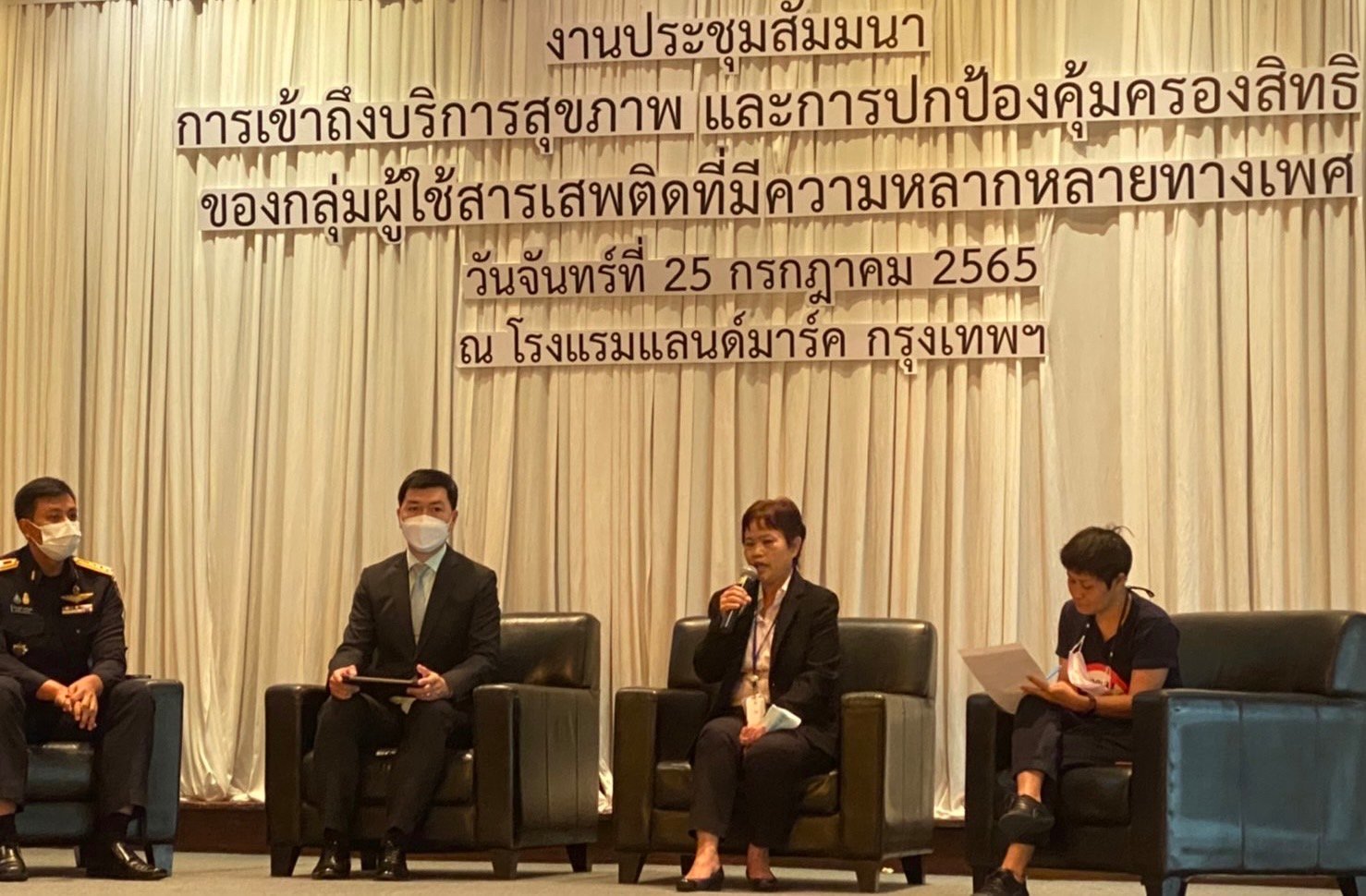 เมื่อวันที่ 25 กรกฎาคม 2565 เวลา 09.30 น. นางสาวสุภัทรา นาคะผิว กรรมการสิทธิมนุษยชนแห่งชาติ เป็นวิทยากรเวทีเสวนา เรื่อง การบังคับใช้กฎหมายและการปกป้องคุ้มครองสิทธิของกลุ่มผู้ใช้สารเสพติดที่มีความหลากหลายทางเพศ ในงานประชุมสัมมนา หัวข้อ การเข้าถึงบริการสุขภาพและการปกป้องคุ้มครองสิทธิของกลุ่มผู้ใช้สารเสพติดที่มีความหลากหลายทางเพศ ณ ห้องบอลรูม ชั้น 7 โรงแรมแลนด์มาร์ค กรุงเทพฯ