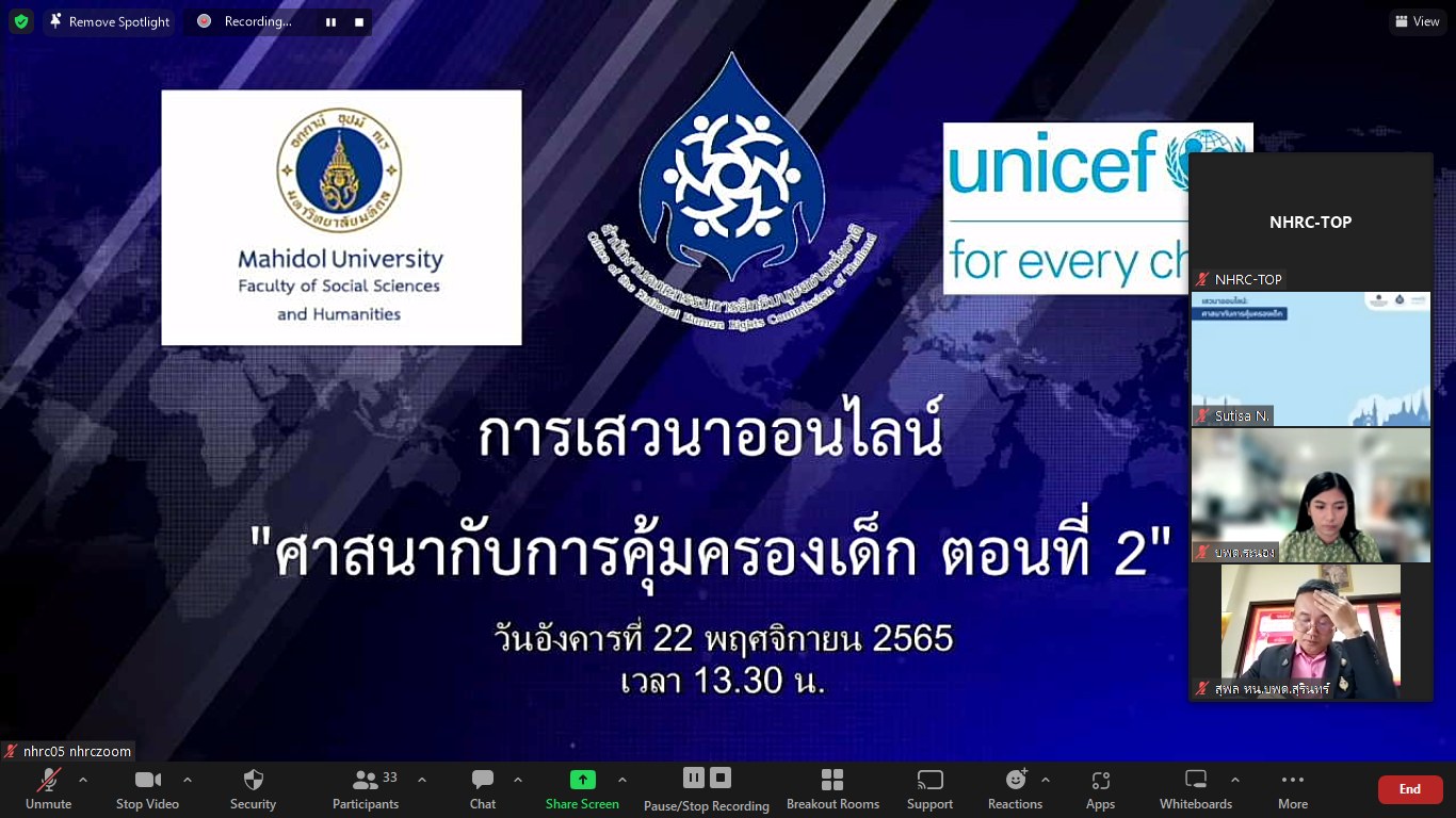 วันที่ 22 พฤศจิกายน 2565 เวลา 13.30 น. นายวสันต์ ภัยหลีกลี้ กรรมการสิทธิมนุษยชนแห่งชาติ กล่าวเปิดงานหัวข้อ “ศาสนากับการคุ้มครองเด็ก ครั้งที่ 2 : เสียงสะท้อนและมุมมองจากผู้ปฏิบัติงานในชุมชน ถึงข้อท้าทายและโอกาสต่อภาคศาสนาในการคุ้มครองเด็ก” ผ่านระบบออนไลน์ จัดโดย สำนักงานคณะกรรมการสิทธิมนุษยชนแห่งชาติ ร่วมกับคณะสังคมศาสตร์และมนุษยศาสตร์ มหาวิทยาลัยมหิดล และองค์การยูนิเซฟ ประเทศไทย โดยมีวัตถุประสงค์เพื่อรับฟังความคิดเห็นและประสบการณ์จากผู้ปฏิบัติงานในพื้นที่ที่ทำงานใกล้ชิดกับเด็กและชุมชน ในการสะท้อนให้เห็นภาพสถานการณ์ ข้อท้าทายและโอกาส ในการปกป้องคุ้มครองเด็ก
