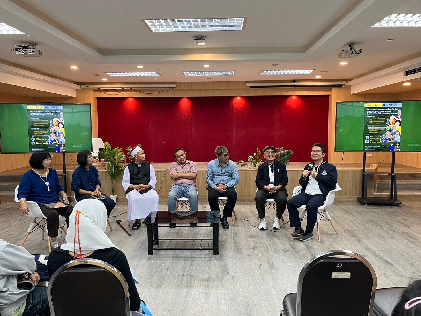 ช่วงเช้ามีเวทีเสวนาหัวข้อ "สถานการณ์สิทธิชุมชน และสิ่งแวดล้อม กับนักปกป้องสิทธิมนุษยชน" ซึ่งผู้ร่วมเสวนาเป็นผู้แทนจากภาคประชาสังคมที่ขับเคลื่อนงานด้านสิทธิชุมชนและสิ่งแวดล้อมในพื้นที่จังหวัดชายแดนภาคใต้ ได้แก่ มูลนิธิภาคใต้สีเขียว เครือข่ายจะนะรักษ์ถิ่น สมาคมลุ่มน้ำสายบุรี ชมรมอนุรักษ์สิ่งแวดล้อม สมัชชาประชาสังคมเพื่อสันติภาพ และผู้แทนประชาชนที่ได้รับผลกระทบจากโครงการของรัฐ