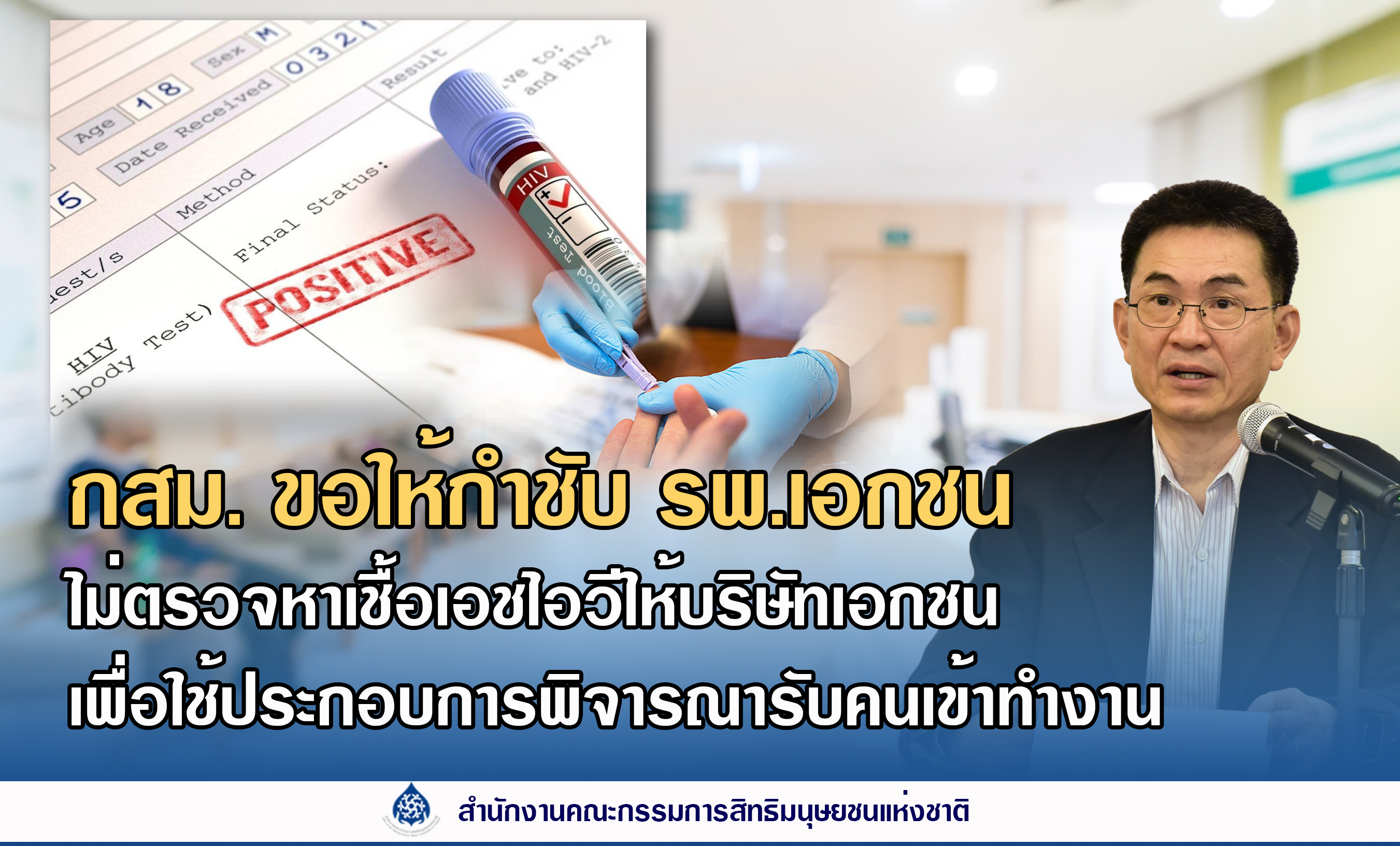 เชื้อเอชไอวีให้แก่ผู้ประกอบการ นายจ้าง หรือบุคคลอื่นใด ทราบด้วย ในส่วนของกรมควบคุมโรคได้มีหนังสือเมื่อเดือนพฤษภาคม 2566 แจ้งไปยังสมาคมโรงพยาบาลเอกชนเพื่อขอความร่วมมือโรงพยาบาลเอกชนไม่รับตรวจหาเชื้อเอชไอวีประกอบการรับเข้าทำงานหรือใช้ประเมินบุคคล อันเป็นกรณีที่หน่วยงานที่เกี่ยวข้องได้ดำเนินการตามหน้าที่และอำนาจเพื่อแก้ไขปัญหาตามสมควรแล้ว กสม. จึงมีมติเห็นชอบผลการประสานการคุ้มครองสิทธิมนุษยชน อย่างไรก็ดี เพื่อส่งเสริมสิทธิมนุษยชน จึงมีมติให้แจ้งไปยังสมาคมโรงพยาบาลเอกชนอีกครั้งเพื่อกำชับโรงพยาบาลเอกชนทุกแห่งไม่ให้ตรวจหาเชื้อเอชไอวีในผู้สมัครงานหรือพนักงานรวมถึงแจ้งผลการตรวจหาเชื้อเอชไอวี