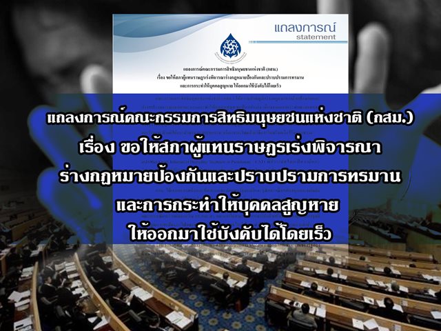 คณะกรรมการสิทธิมนุษยชนแห่งชาติ (กสม.) ให้ความสำคัญต่อร่างกฎหมายว่าด้วยป้องกันและปราบปรามการทรมานและการกระทำให้บุคคลสูญหายเป็นอย่างยิ่ง เนื่องจากการกระทำทรมานและการกระทำให้บุคคลสูญหายเป็นการละเมิดสิทธิมนุษยชนอย่างร้ายแรงที่สมควรได้รับการลงโทษตามกฎหมาย ซึ่งรัฐธรรมนูญแห่งราชอาณาจักรไทย มาตรา 28 ได้บัญญัติรับรองและคุ้มครองสิทธิและเสรีภาพในชีวิตและร่างกาย ห้ามมิให้กระทำทรมาน ทารุณกรรม หรือการลงโทษด้วยวิธีการโหดร้ายหรือไร้มนุษยธรรม
