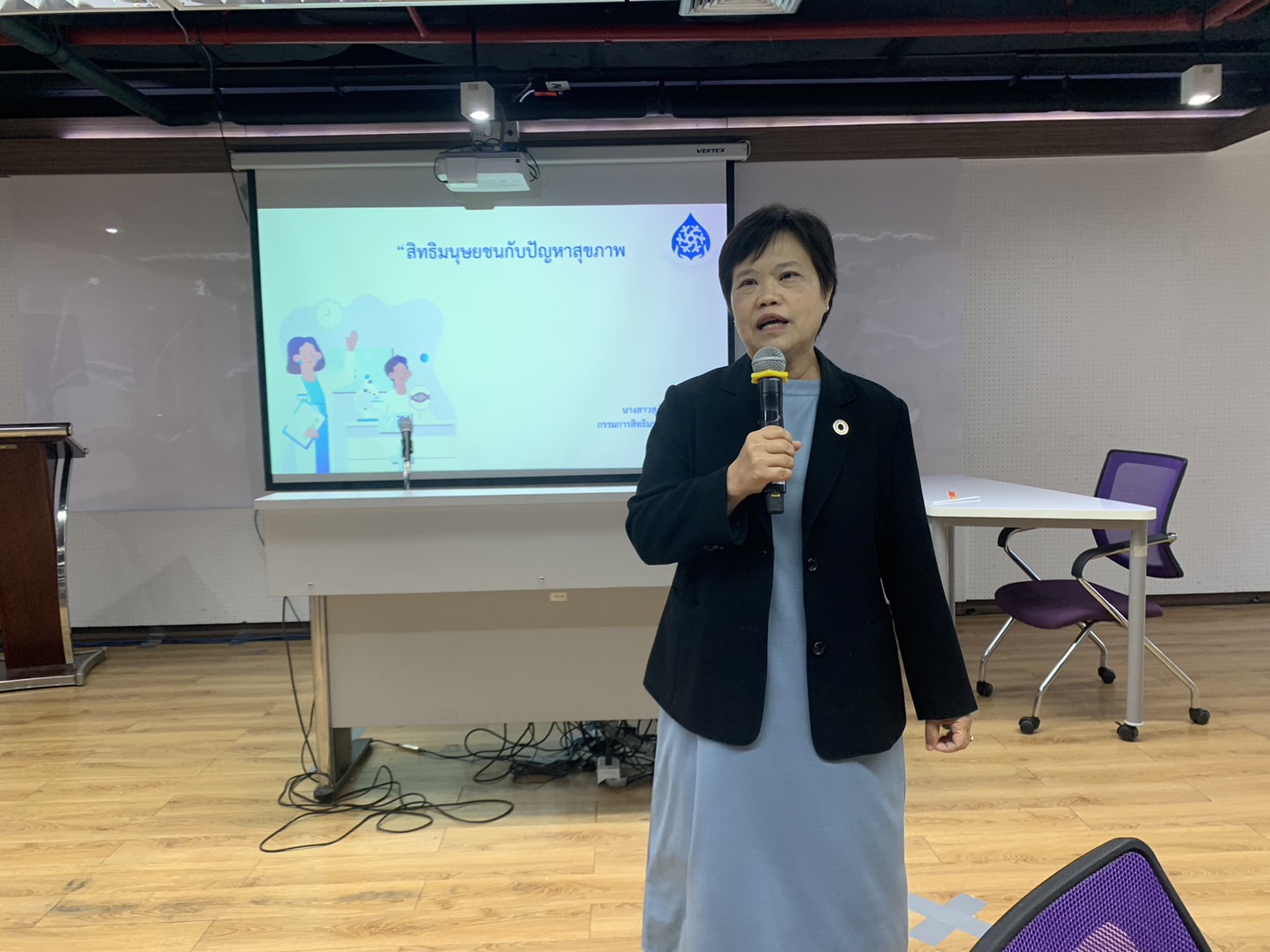 กรรมการสิทธิมนุษยชนแห่งชาติ เริ่มต้นบรรยายด้วยการแนะนำคณะกรรมการสิทธิมนุษยชนแห่งชาติ (กสม.) และองค์กรอิสระตามรัฐธรรมนูญ หน้าที่และอำนาจของ กสม. ในการตรวจสอบการละเมิดสิทธิมนุษยชน การเสนอแนะมาตรการหรือการแก้ไขกฎหมาย  การประเมินสถานการณ์และการชี้แจงสถานการณ์ด้านสิทธิมนุษยชน และการส่งเสริมสิทธิมนุษยชน จากนั้นได้ให้ความรู้เรื่องปฐมบทสิทธิมนุษยชน ปฏิญญาสากลว่าด้วยสิทธิมนุษยชนของสหประชาชาติ ข้อ 25 ที่ระบุว่า ทุกคนมีสิทธิในมาตรฐานการครองชีพอันเพียงพอสำหรับสุขภาพและความอยู่ดีของตนและของครอบครัว รวมทั้งอาหาร เครื่องนุ่งห่ม ที่อยู่อาศัย และการดูแลรักษาทางการแพทย์ และบริการสังคมที่จำเป็น และมีสิทธิในหลักประกันยามว่างงาน เจ็บป่วย พิการ ม่าย วัยชรา หรือปราศจากการดำรงชีพอื่นในสภาวะแวดล้อมนอกเหนือการควบคุมของตน และยังได้บรรยายถึงสนธิสัญญาหลักด้านสิทธิมนุษยชน 9 ฉบับของสหประชาชาติ และที่ประเทศไทยให้การรับรอง ความหมายของสิทธิมนุษยชน และบทบาทหน้าที่ของรัฐด้านสิทธิมนุษยชน