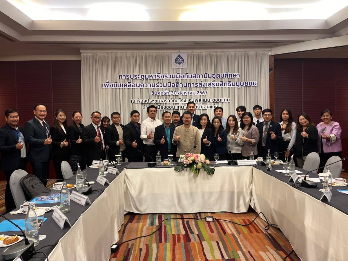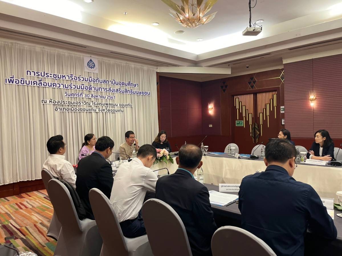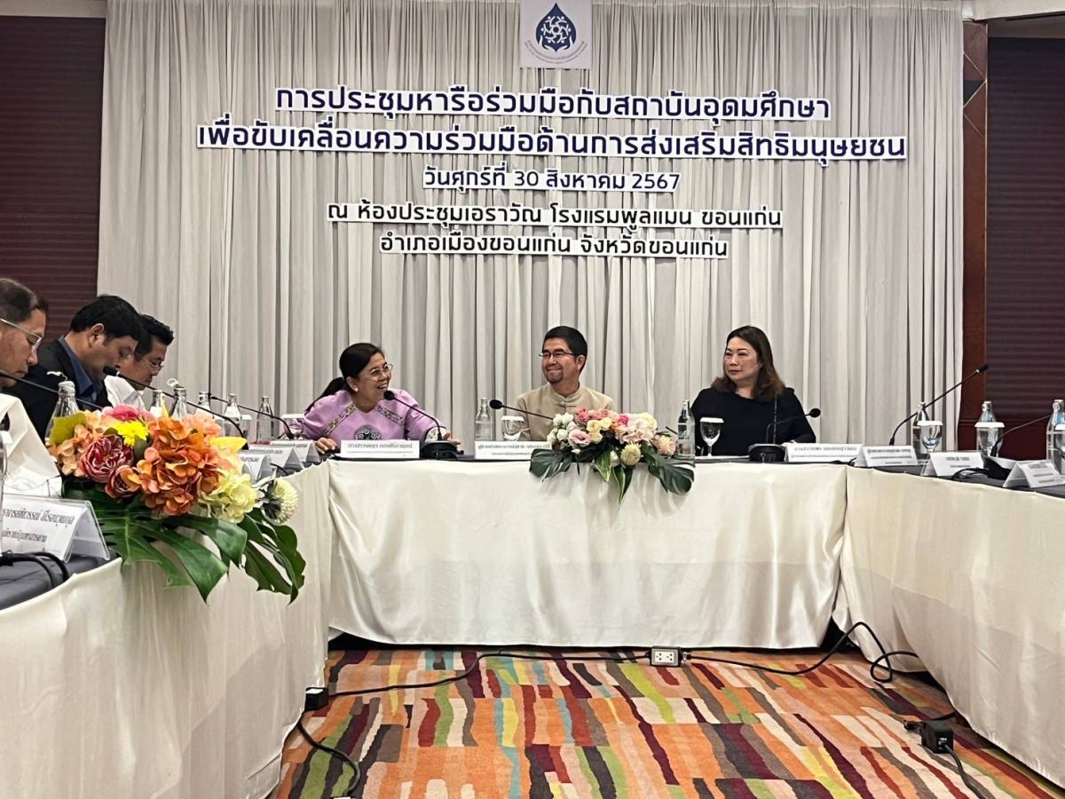 เมื่อวันที่ 30 สิงหาคม 2567 ผู้ช่วยศาสตราจารย์สุชาติ  เศรษฐมาลินี กรรมการสิทธิมนุษยชนแห่งชาติ พร้อมด้วยนางสาวรตญา  กอบศิริกาญจน์ รองเลขาธิการคณะกรรมการสิทธิมนุษยชนแห่งชาติ และเจ้าหน้าที่สำนักงานคณะกรรมการสิทธิมนุษยชนแห่งชาติ (สำนักงาน กสม.) ประชุมหารือเกี่ยวกับการขับเคลื่อนความร่วมมือด้านการส่งเสริมสิทธิมนุษยชนของสถาบันอุดมศึกษา ร่วมกับผู้บริหารและผู้แทนสถาบันอุดมศึกษา 11 แห่ง ในเขตพื้นที่ภาคตะวันออกเฉียงเหนือตอนบน ประกอบด้วย มหาวิทยาลัยขอนแก่น มหาวิทยาลัยภาคตะวันออกเฉียงเหนือ มหาวิทยาลัยนครพนม มหาวิทยาลัยกาฬสินธุ์ มหาวิทยาลัยมหาสารคาม มหาวิทยาลัยราชภัฏอุดรธานี มหาวิทยาลัยราชภัฏร้อยเอ็ด มหาวิทยาลัยราชภัฏสกลนคร มหาวิทยาลัยราชภัฏมหาสารคาม วิทยาลัยพิชญบัณฑิต และวิทยาลัยบัณฑิตเอเชีย ณ โรงแรมพูลแมน ขอนแก่น ราชา ออคิด จังหวัดขอนแก่น