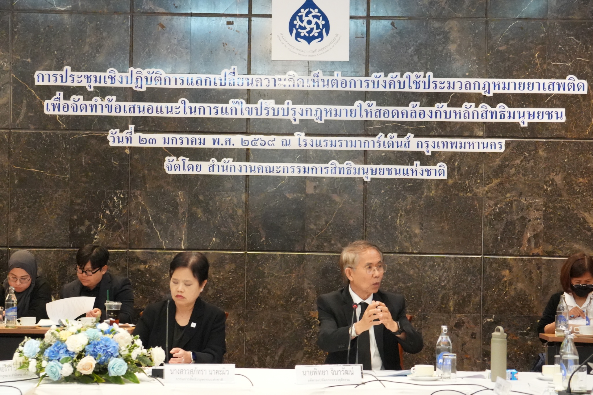 เมื่อวันที่ 23 มกราคม 2569 นางสาวสุภัทรา  นาคะผิว กรรมการสิทธิมนุษยชนแห่งชาติ พร้อมด้วย นายพิทยา  จินาวัฒน์ และนายบุญแทน  ตันสุเทพวีรวงศ์ ที่ปรึกษาประจำ กสม. นางสาวทิพย์ธีรา  รัมมณีย์ ผู้อำนวยการสำนักกฎหมาย และเจ้าหน้าที่สำนักงาน กสม. เข้าร่วม “การประชุมเชิงปฏิบัติการแลกเปลี่ยนความคิดเห็นต่อการบังคับใช้ประมวลกฎหมายยาเสพติด เพื่อจัดทำข้อเสนอแนะในการแก้ไขปรับปรุงกฎหมายให้สอดคล้องกับหลักสิทธิมนุษยชน” ร่วมกับผู้แทนหน่วยงานภาครัฐและองค์กรภาคประชาสังคม ณ ห้องลีลาวดี โรงแรมรามา การ์เด้น กรุงเทพมหานคร