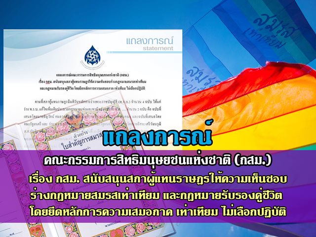 แถลงการณ์คณะกรรมการสิทธิมนุษยชนแห่งชาติ (กสม.) เรื่อง กสม. สนับสนุนสภาผู้แทนราษฎรให้ความเห็นชอบร่างกฎหมายสมรสเท่าเทียม และกฎหมายรับรองคู่ชีวิต โดยยึดหลักการความเสมอภาค เท่าเทียม ไม่เลือกปฏิบัติ ตามที่สภาผู้แทนราษฎรมีมติรับหลักการร่างพระราชบัญญัติ (พ.ร.บ.) จำนวน 4 ฉบับ ได้แก่ ร่าง พ.ร.บ. แก้ไขเพิ่มเติมประมวลกฎหมายแพ่งและพาณิชย์ (ฉบับที่) พ.ศ. …. จำนวน 2 ฉบับ คือ ฉบับที่เสนอโดยนายธัญวัจน์ กมลวงศ์วัฒน์ ส.ส.บัญชีรายชื่อ พรรคก้าวไกล กับคณะ และฉบับที่เสนอโดยคณะรัฐมนตรี และ ร่าง พ.ร.บ.คู่ชีวิต พ.ศ. .… เสนอโดยคณะรัฐมนตรี และที่เสนอโดยนายอิสระ เสรีวัฒนวุฒิ ส.ส.บัญชีรายชื่อพรรคประชาธิปัตย์ กับคณะ เมื่อวันที่ 15 มิถุนายน 2565 และขณะนี้อยู่ระหว่างการพิจารณาของคณะกรรมาธิการ มีกำหนดเสร็จสิ้น เพื่อเสนอให้สภาผู้แทนราษฎรพิจารณาวาระ 2 และวาระ 3 ก่อนปิดสมัยประชุมรัฐสภานี้ นั้น คณะกรรมการสิทธิมนุษยชนแห่งชาติ (กสม.) เห็นว่า โดยสาระสำคัญของร่างกฎหมายดังกล่าวเป็นการส่งเสริมและคุ้มครองสิทธิและเสรีภาพในการเลือกคู่ครองและสร้างครอบครัวของคนทุกเพศ สอดคล้องกับหลักการไม่เลือกปฏิบัติต่อบุคคล ตามปฏิญญาสากลว่าด้วยสิทธิมนุษยชนแห่งสหประชาชาติ กติการะหว่างประเทศว่าด้วยสิทธิพลเมืองและสิทธิทางการเมือง ข้อ 2 ข้อ 23 และข้อ 26 ซึ่งเป็นพันธสัญญาที่ประเทศไทยให้การรับรอง รวมทั้งสอดคล้องกับหลักการยอกยาการ์ตา (The Yogyakata Principles) ว่าด้วยการใช้กฎหมายสิทธิมนุษยชนระหว่างประเทศในประเด็นวิถีทางเพศและอัตลักษณ์ทางเพศ จึงสนับสนุนให้สภาผู้แทนราษฎรเห็นชอบร่างกฎหมายดังกล่าว เพื่อยกระดับการคุ้มครองสิทธิมนุษยชน ศักดิ์ศรีความเป็นมนุษย์ของกลุ่มคนที่มีความหลากหลายทางเพศ และขจัดการเลือกปฏิบัติเพราะเหตุแห่งเพศในประเทศไทย อีกทั้งจะเป็นการพัฒนาคุณภาพชีวิตของกลุ่มคนที่มีความหลากหลายทางเพศในการสร้างครอบครัวตามแบบที่ต้องการ คณะกรรมการสิทธิมนุษยชนแห่งชาติ 6 กันยายน 2565