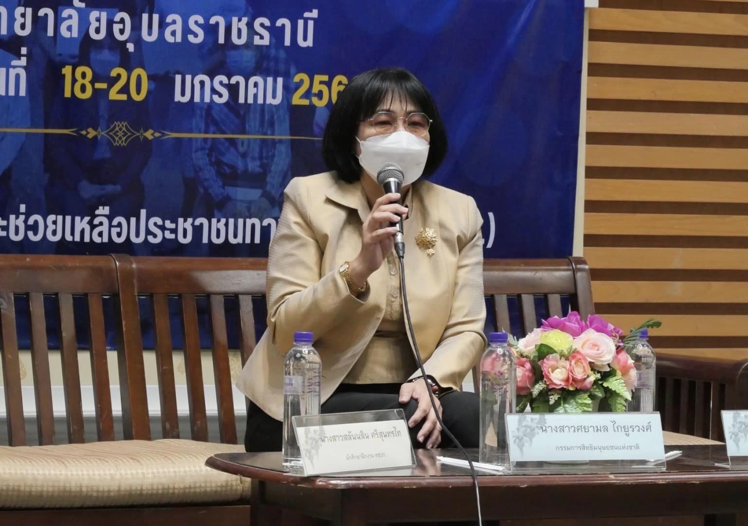 เมื่อวันที่ 20 มกราคม 2565 เวลา 09.00 – 12.00 น. นางสาวศยามล ไกยูรวงศ์ กรรมการสิทธิมนุษยชนแห่งชาติ เป็นวิทยากรเสวนา เรื่อง “เยาวชนกับสิทธิมนุษยชน” ให้แก่เยาวชนชั้นมัธยมศึกษาปีที่ 5 ที่สมัครเข้าร่วมกิจกรรมค่ายเยาวชนพิทักษ์สิทธิมนุษยชน ครั้งที่ 14 ซึ่งจัดโดย ศูนย์เผยแพร่และช่วยเหลือประชาชนทางกฎหมาย (ศชปก.) คณะนิติศาสตร์ มหาวิทยาลัยอุบลราชธานี ณ สถานปฏิบัติการโรงแรมและการท่องเที่ยว (โรงแรม U-Place) มหาวิทยาลัยอุบลราชธานี