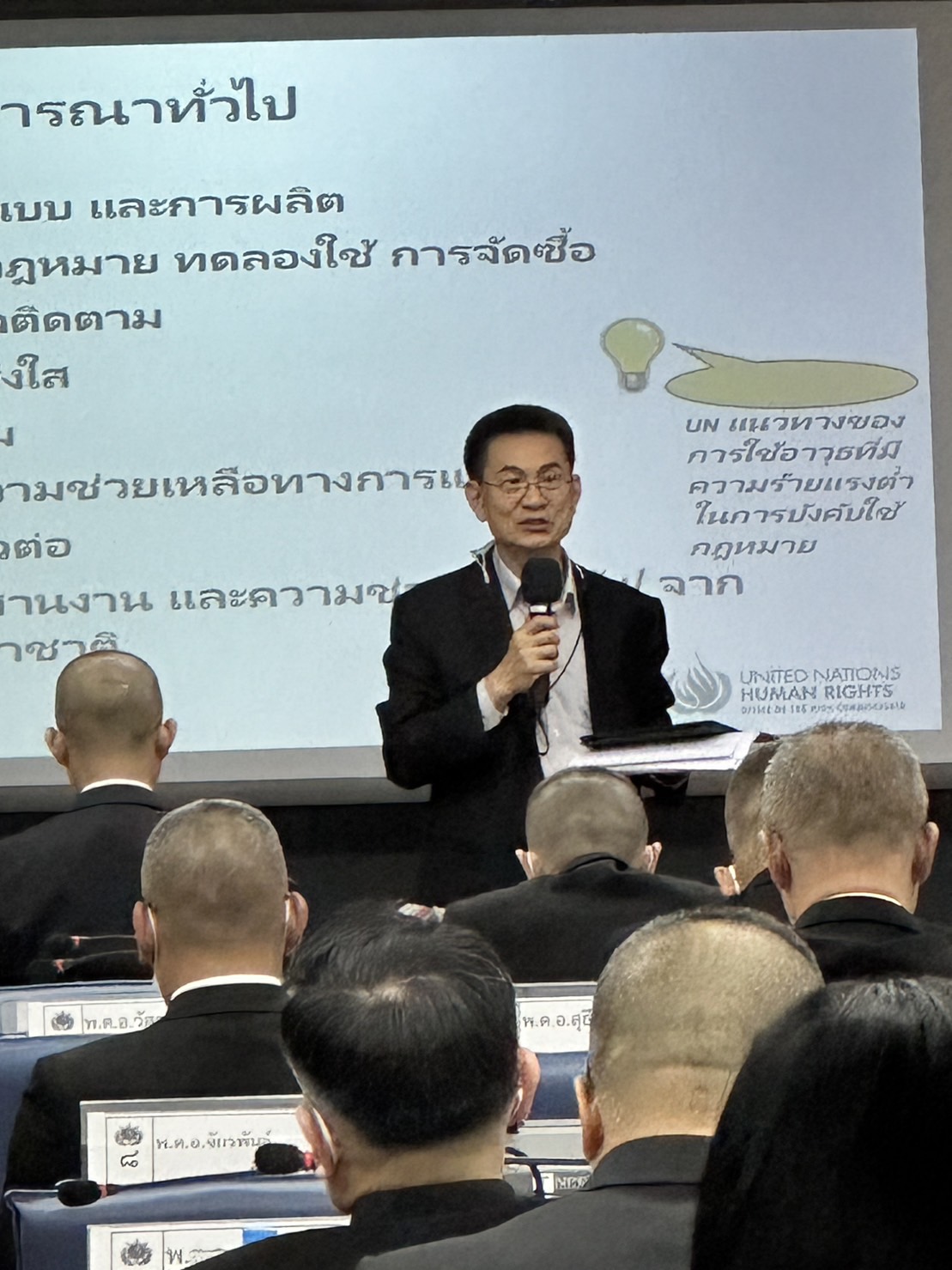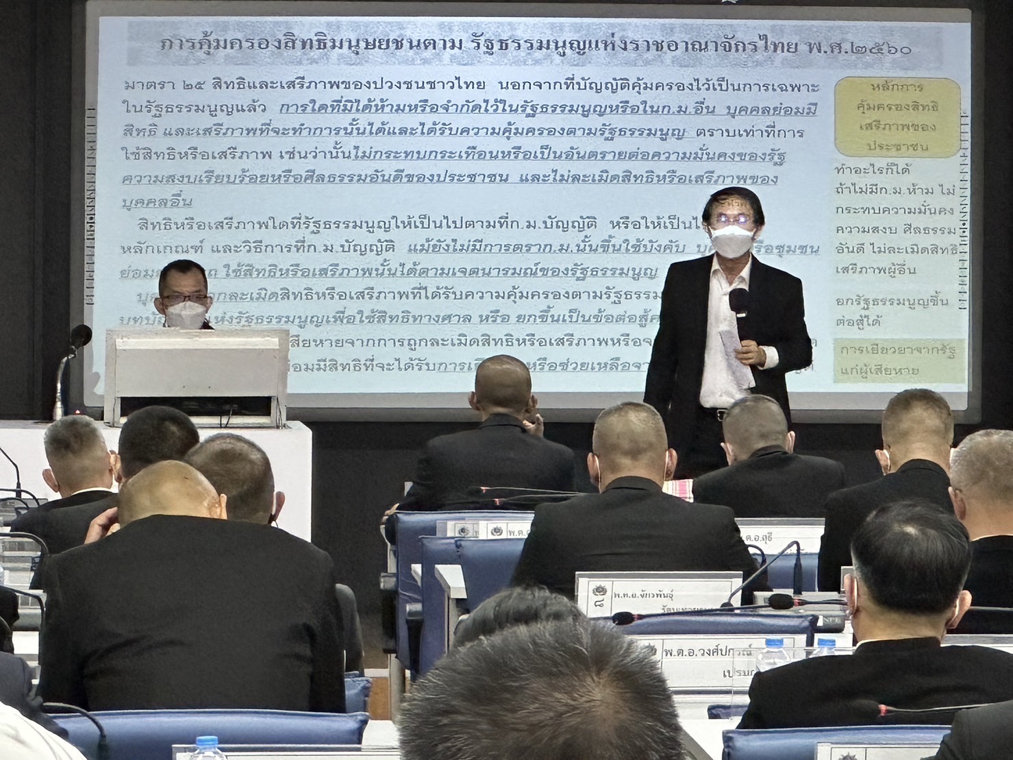 ทั้งนี้ การบรรยายในหลักสูตรดังกล่าวเป็นผลจากการหารือเพื่อขับเคลื่อนภารกิจด้านสิทธิมนุษยชนศึกษาในหลักสูตรการฝึกอบรมสำหรับกลุ่มเป้าหมายที่เป็นเจ้าหน้าที่ตำรวจ ด้วยการบรรจุหัวข้อวิชาสิทธิมนุษยชนเข้าไปในหลักสูตรของกองบัญชาการศึกษา สำนักงานตำรวจแห่งชาติ โดย กสม. ได้บรรยายเนื้อหาเกี่ยวกับพัฒนาการ ที่มา กลไกสิทธิมนุษยชน และกฎหมายที่เกี่ยวข้องกับสิทธิมนุษยชน รวมถึงการแนะนำบทบาทและนโยบายของ กสม. ตลอดจนเรื่องร้องเรียนเกี่ยวกับสถานการณ์ชุมนุมที่ กสม. มีข้อเสนอแนะไปยังหน่วยงานที่เกี่ยวข้อง ซึ่งนอกจากการบรรยายแล้วยังมีการเรียนรู้ผ่านกิจกรรมโดยให้ผู้เข้ารับการฝึกอบรมยกกรณีตัวอย่างสถานการณ์วิกฤติที่เกิดขึ้นจริง อาทิ สถานการณ์การชุมนุม และได้มีการแลกเปลี่ยนเรียนรู้ในการวิเคราะห์สถานการณ์ พร้อมทั้งนำเสนอแนวทาง/วิธีการบริหารจัดการสถานการณ์วิกฤติ รวมถึงข้อสรุปในบริหารจัดการสถานการณ์ดังกล่าว