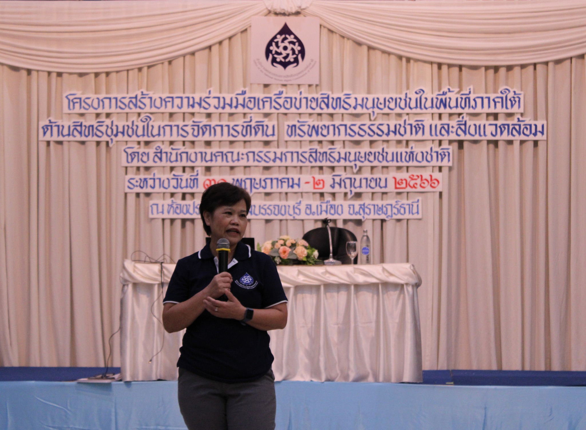 วันที่ 31 พฤษภาคม 2566 ที่โรงแรมบรรจงบุรี อำเภอเมือง จังหวัดสุราษฎร์ธานี นางสาวสุภัทรา นาคะผิว กรรมการสิทธิมนุษยชนแห่งชาติ กล่าวเปิดการประชุมเชิงปฏิบัติการโครงการสร้างความร่วมมือเครือข่ายสิทธิมนุษยชนในพื้นที่ภาคใต้ ด้านสิทธิชุมชนในการจัดการที่ดิน ทรัพยากรธรรมชาติ และสิ่งแวดล้อม โดยกล่าวถึงวัตถุประสงค์การประชุมครั้งนี้ว่า เพื่อรวบรวมข้อมูลและประเมินสถานการณ์การทำงานของนักปกป้องสิทธิมนุษยชนในพื้นที่ภาคใต้ ทั้งบทบาท ปัญหาอุปสรรค ความท้าทาย และข้อเสนอแนะต่อการคุ้มครองสิทธินักปกป้องสิทธิมนุษยชน รวมทั้งกลไกที่เหมาะสม เพื่อจัดทำข้อเสนอแนะภาพรวมทั้งประเทศต่อไป พร้อมทั้งบรรยายเรื่อง “บทบาทและหน้าที่ของคณะกรรมการสิทธิมนุษยชนแห่งชาติ แนวคิดและบทบาทของนักปกป้องสิทธิมนุษยชนตามปฏิญญาว่าด้วยนักปกป้องสิทธิมนุษยชนของสหประชาชาติ และกลไกคุ้มครองนักปกป้องสิทธิมนุษยชน” โดยมีนางสาวรตญา กอบศิริกาญจน์ รองเลขาธิการคณะกรรมการสิทธิมนุษยชนแห่งชาติ กล่าวรายงาน