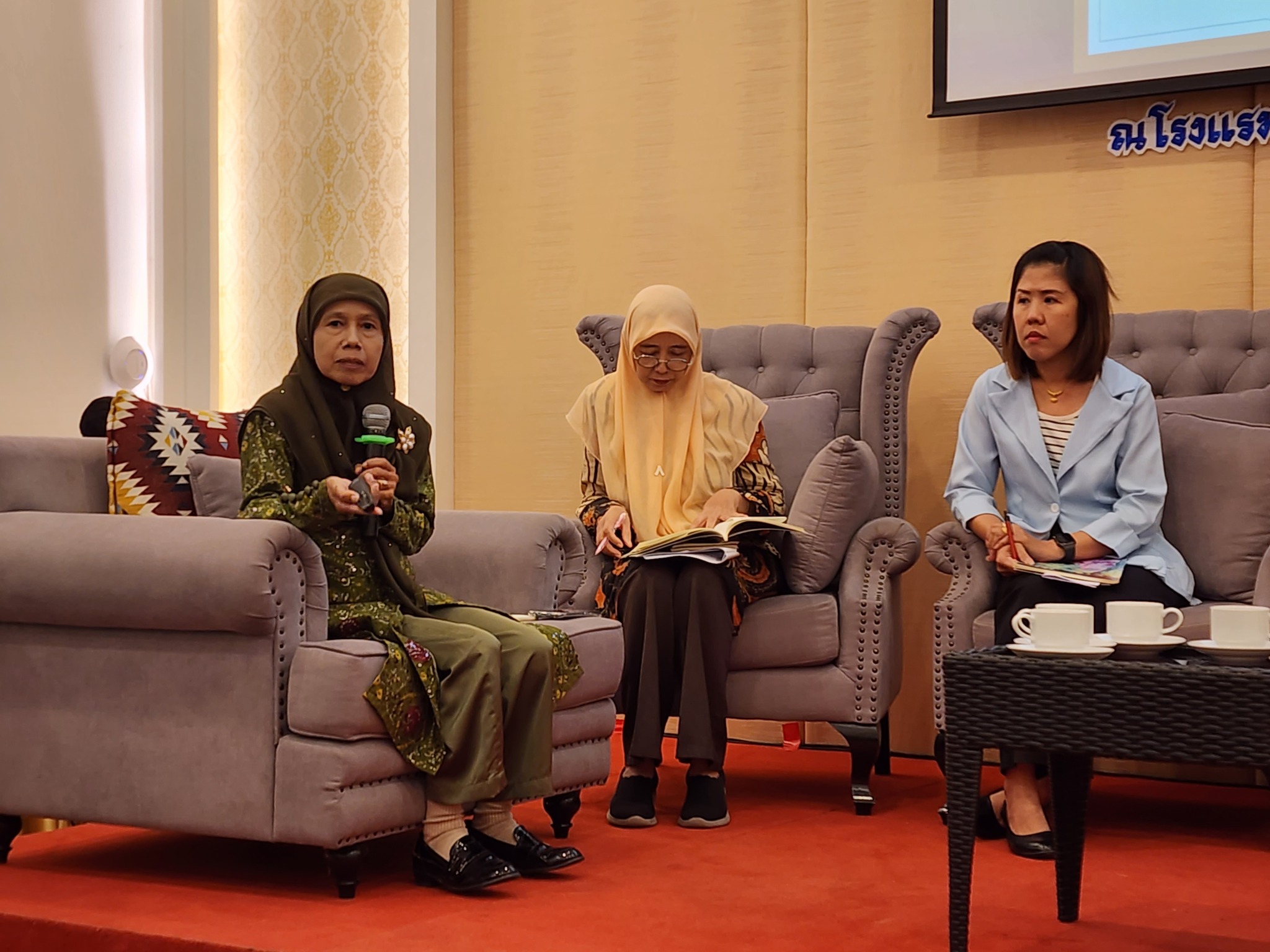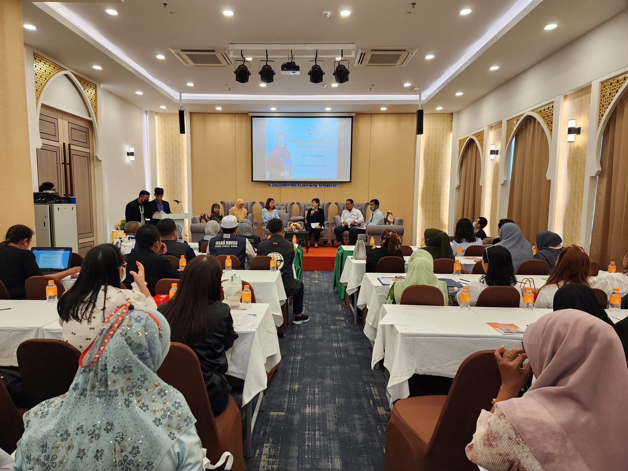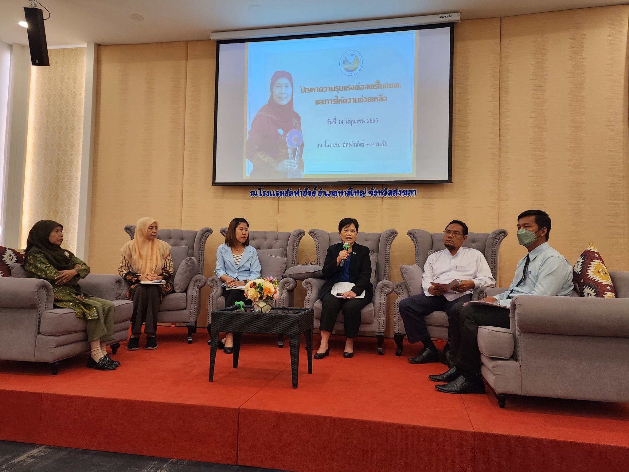 จากนั้นมีการอภิปราย เรื่อง “สถานการณ์ความรุนแรงต่อสตรีและครอบครัวในพื้นที่จังหวัดชายแดนภาคใต้ และข้อเสนอแนะในการแก้ไขปัญหา” ดำเนินการอภิปรายโดย นางสาวสุภัทรา นาคะผิว กรรมการสิทธิมนุษยชนแห่งชาติ โดยมีการนำเสนอสถานการณ์เรื่องความรุนแรงต่อสตรีและครอบครัวในมิติต่าง ๆ ดังนี้ (1) ปัญหาความรุนแรงต่อสตรีในจังหวัดชายแดนภาคใต้และการให้ความช่วยเหลือ โดย คุณรอซิดะห์ ปูซู ประธานเครือข่ายศูนย์บริการให้คำปรึกษาเสริมพลังสตรี (2) บทบาทของศูนย์ประสานงานด้านเด็กและสตรีในจังหวัดชายแดนภาคใต้ในการหนุนเสริมองค์กรเครือข่าย เพื่อช่วยเหลือสตรีที่ประสบความรุนแรงในครอบครัว โดย อาจารย์โซรยา จามจุรี ประธานคณะกรรมการศูนย์ประสานงานเด็กและสตรีในจังหวัดชายแดนภาคใต้ (ศป.ดส.) ในประเด็น (3) กลไกการช่วยเหลือและเยียวยาต่อสตรีที่ถูกกระทำด้วยความรุนแรง โดยคุณฮารีฟ มาหิและ นักพัฒนาสังคมชำนาญการพิเศษ ผู้แทนพัฒนาสังคมและความมั่นคงของมนุษย์จังหวัดปัตตานี คุณชุตาภัณฑ์ ไพศาลเจริญวงศ์ หัวหน้าศูนย์ประสานงานเด็กและสตรีในจังหวัดชายแดนภาคใต้ ศอ.บต. และ ผศ.ดร. ฆอซาลี เบ็ญหมัด ผู้เขียนหนังสือพัฒนาการของการตีความกฎหมายอิสลามเพื่อการนำมาใช้ลดความรุนแรงต่อผู้หญิงในครอบครัวในจังหวัดชายแดนภาคใต้