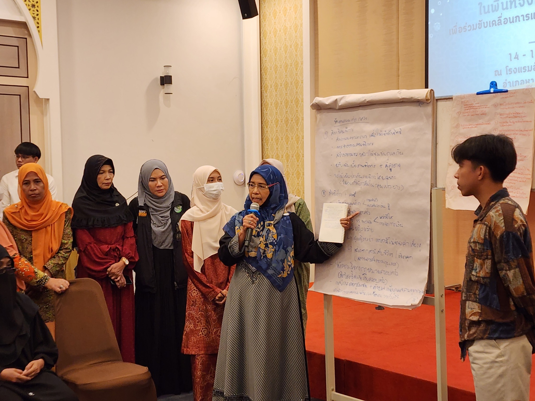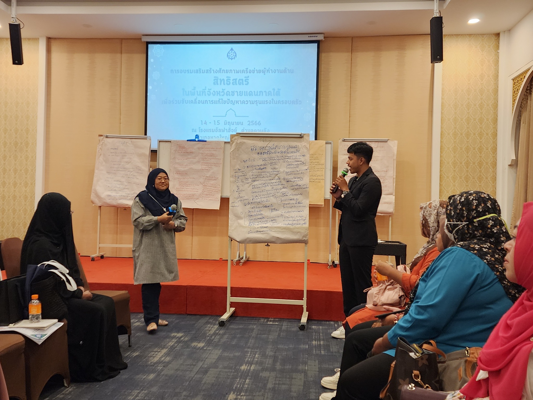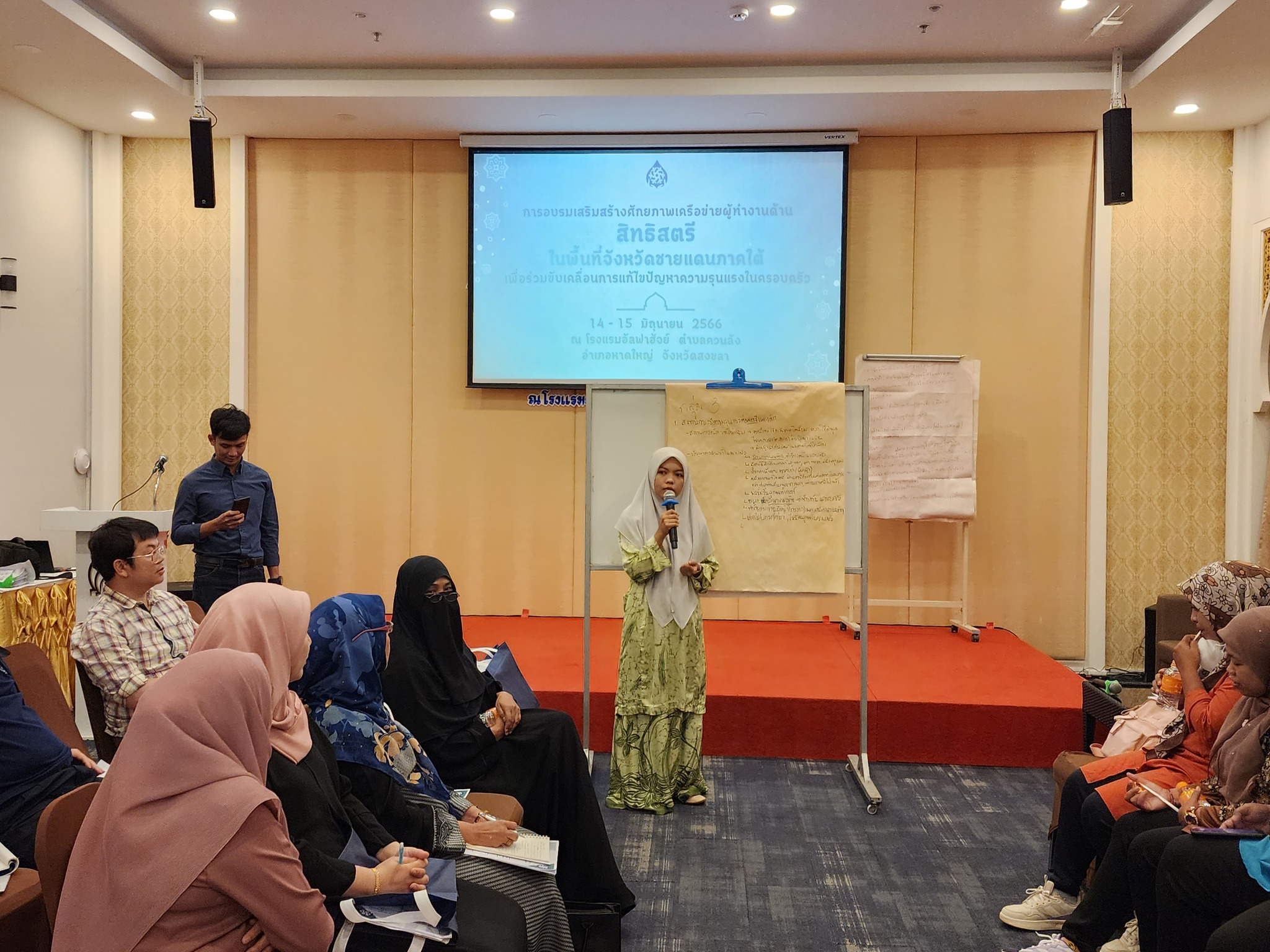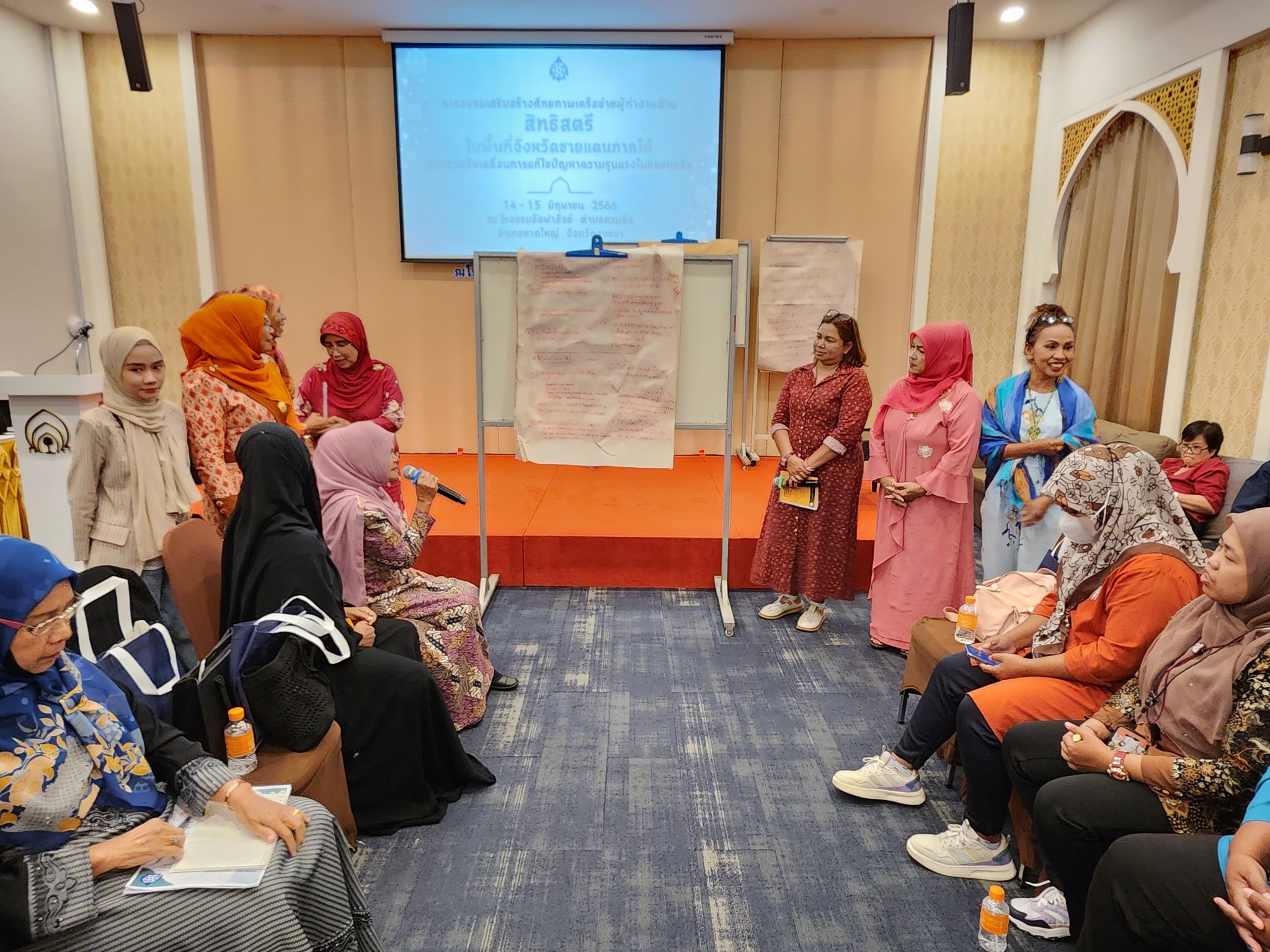 จากนั้น ผู้เข้าร่วมการอบรมได้นำเสนอผลการระดมความคิดเห็นกลุ่มย่อย จากการระดมความเห็นในกิจกรรมวันก่อนหน้า เกี่ยวกับสถานการณ์ความรุนแรงต่อสตรี ข้อเสนอแนะในการแก้ไขปัญหา และ ข้อเสนอแนะต่อ กสม. ในการขับเคลื่อนการแก้ไขปัญหาความรุนแรงต่อสตรีในจังหวัดชายแดนภาคใต้ ในการนี้ ผู้ช่วยศาสตราจารย์สุชาติ เศรษฐมาลินี นายวสันต์ ภัยหลีกลี้ และนางสาวสุภัทรา นาคะผิว กรรมการสิทธิมนุษยชนแห่งชาติ ได้ร่วมตอบข้อซักถามและแลกเปลี่ยนความคิดเห็นในประเด็นการขับเคลื่อนการทำงานกับ กสม. เพื่อแก้ไขปัญหาความรุนแรงต่อสตรีในจังหวัดชายแดนภาคใต้