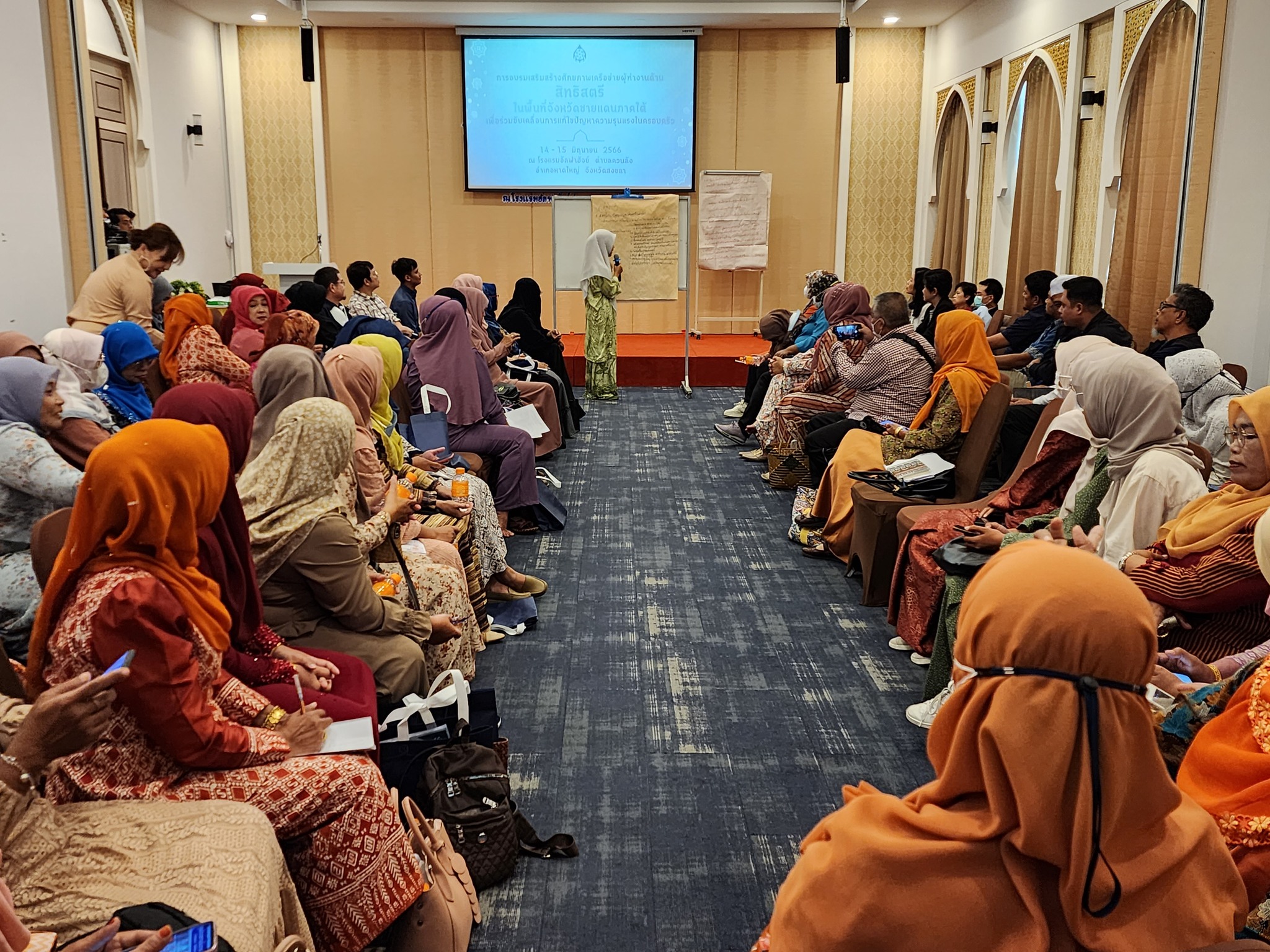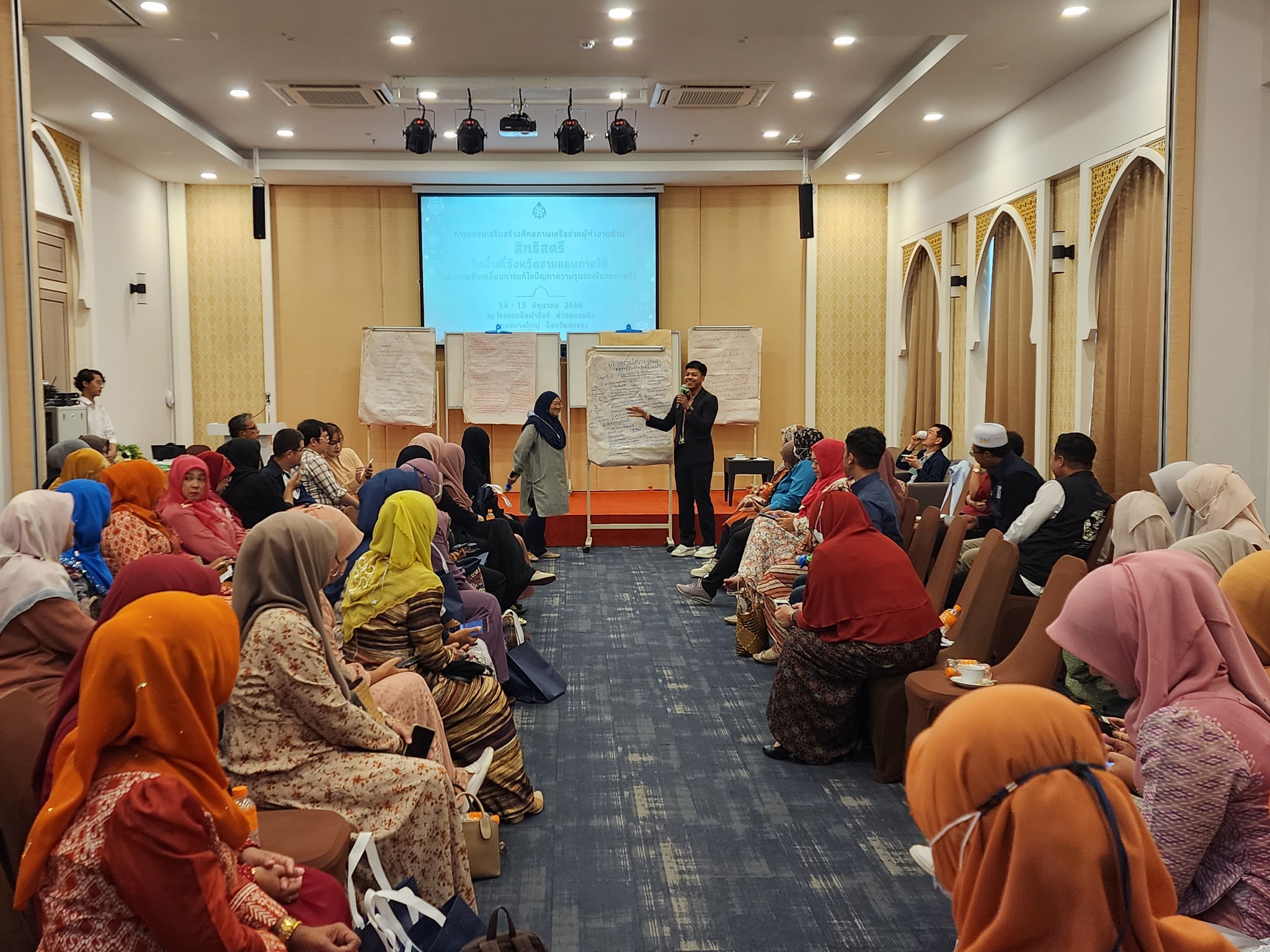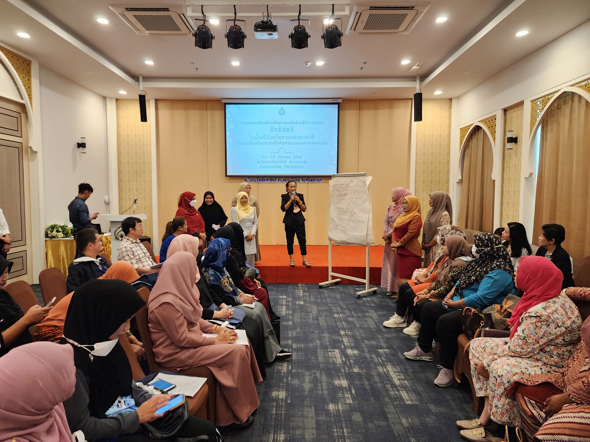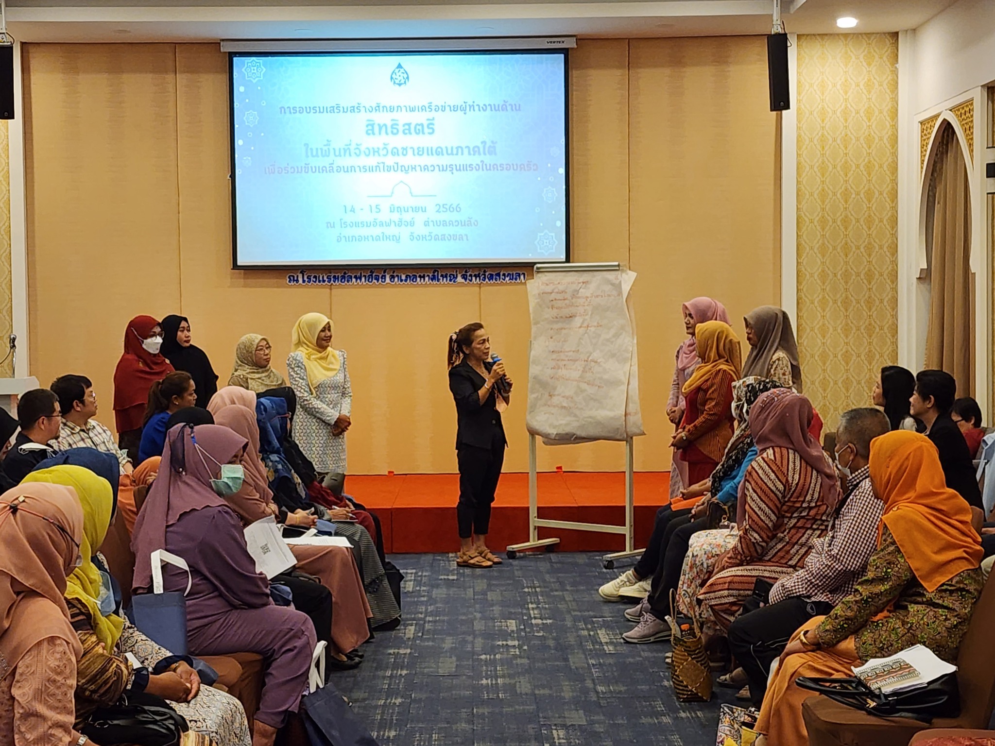 วันที่ 15 มิถุนายน 2566 สำนักงานคณะกรรมการสิทธิมนุษยชนแห่งชาติ (สำนักงาน กสม.) ดำเนินกิจกรรม “การอบรมเสริมสร้างศักยภาพเครือข่ายผู้ทำงานด้านสิทธิสตรีในพื้นที่จังหวัดชายแดนภาคใต้เพื่อร่วมขับเคลื่อนการแก้ไขปัญหาความรุนแรงในครอบครัว” (วันที่สอง) โดยมีผู้ช่วยศาสตราจารย์สุชาติ เศรษฐมาลินี นายวสันต์ ภัยหลีกลี้ และนางสาวสุภัทรา นาคะผิว กรรมการสิทธิมนุษยชนแห่งชาติ พร้อมด้วย นางหรรษา บุญรัตน์ รองเลขาธิการคณะกรรมการสิทธิมนุษยชนแห่งชาติ ร่วมรับฟังและแลกเปลี่ยนความคิดเห็นกับผู้เข้าร่วมการอบรมซึ่งเป็นเครือข่ายสตรีในพื้นที่จังหวัดชายแดนภาคใต้ประมาณ 80 คน ณ โรงแรม อัลฟาฮัจย์ ตำบลควนลัง อำเภอหาดใหญ่ จังหวัดสงขลา กิจกรรมในวันนี้มีการฉายวิดีทัศน์เกี่ยวกับการยุติความรุนแรงในครอบครัวเรื่อง “เรื่องผัวเมียยุ่งได้” จัดทำโดย สำนักงาน กสม. ร่วมกับกองทุนพัฒนาสื่อปลอดภัยและสร้างสรรค์ และมีการแลกเปลี่ยนความคิดเห็นจากการรับชมสื่อเพื่อร่วมกันสร้างความตระหนักรู้ในการมีส่วนร่วมยุติความรุนแรงในครอบครัวซึ่งเป็นหน้าที่ของพลเมืองทุกคนที่ต้องไม่เพิกเฉย นิ่งดูดาย และต้องแจ้งเจ้าหน้าที่เข้าให้ความช่วยเหลือทันทีเมื่อพบเห็นการกระทำความรุนแรงต่อกันภายในครอบครัวของผู้อื่น