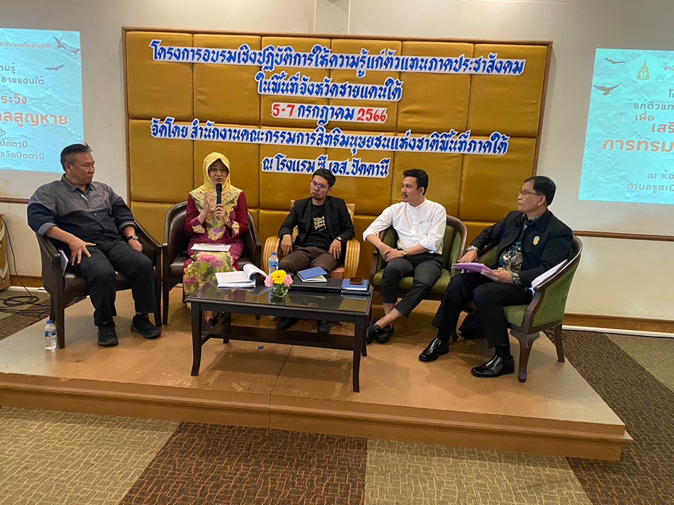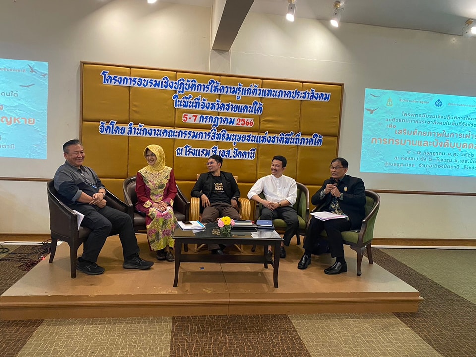 เมื่อวันที่ 6 กรกฎาคม 2566 คณะกรรมการสิทธิมนุษยชนแห่งชาติ (กสม.) โดยนางสาวปิติกาญจน์ สิทธิเดช และผู้ช่วยศาสตราจารย์สุชาติ เศรษฐมาลินี  กรรมการสิทธิมนุษยชนแห่งชาติ เข้าร่วมรับฟังความเห็นและเป็นวิทยากร “โครงการอบรมเชิงปฏิบัติการให้ความรู้แก่ตัวแทนภาคประชาสังคมในพื้นที่จังหวัดชายแดนใต้ เพื่อเสริมศักยภาพในการเฝ้าระวังการทรมานและบังคับสูญหาย” จัดโดย สำนักงาน กสม. ร่วมกับสถาบันนิติวัชร์ สำนักงานอัยการสูงสุด (วันที่สอง) ณ ห้องสะบารัง 2 โรงแรม ซี.เอส.ปัตตานี ตำบลรูสะมิแล อำเภอเมืองปัตตานี จังหวัดปัตตานี