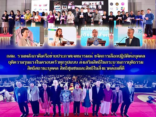 กสม. รวมพลังภาคีเครือข่ายประกาศเจตนารมณ์ ขจัดการเลือกปฏิบัติต่อบุคคล ยุติความรุนแรงในครอบครัวทุกรูปแบบ ส่งเสริมสิทธิในกระบวนการยุติธรรม สิทธิสถานะบุคคล สิทธิชุมชนและสิทธิในสิ่งแวดล้อมที่ดี