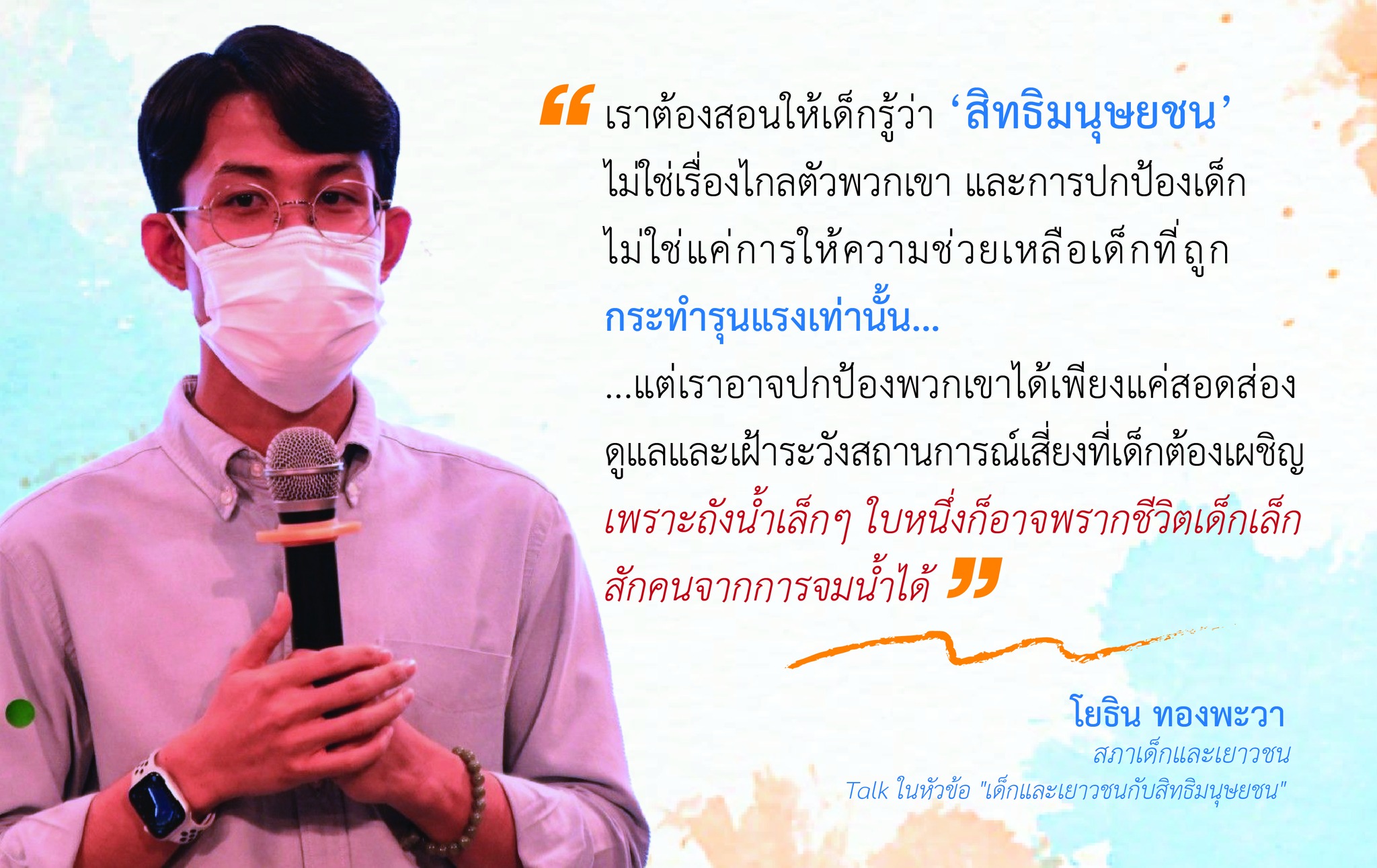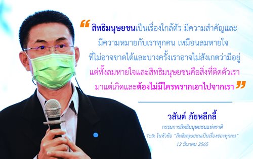 วันที่ 12 มีนาคม 2565 ณ หอศิลปวัฒนธรรมแห่งกรุงเทพมหานคร เพราะ “สิทธิมนุษยชนเป็นเรื่องของทุกคน” สำนักงาน กสม. ขอสรุปประโยคสำคัญที่สะท้อนทัศนะเรื่องสิทธิมนุษยชนจากผู้แทนแวดวงต่าง ๆ ที่ขับเคลื่อนเรื่องสิทธิมนุษยชนในสังคม จากเวที Talk เรื่อง “สิทธิมนุษยชนเป็นเรื่องของทุกคน” ในงานเสวนาและมอบรางวัลการประกวดภาพถ่ายสิทธิมนุษยชนและการประกวดคลิปสั้นผ่านแพลตฟอร์ม TikTok โครงการเยาวชนคนรุ่นใหม่ใส่ใจและยืนเคียงข้างสิทธิมนุษยชน (Youth Standing Up for Human Rights) เมื่อวันเสาร์ที่ 12 มีนาคม 2565 ณ หอศิลปวัฒนธรรมแห่งกรุงเทพมหานคร
