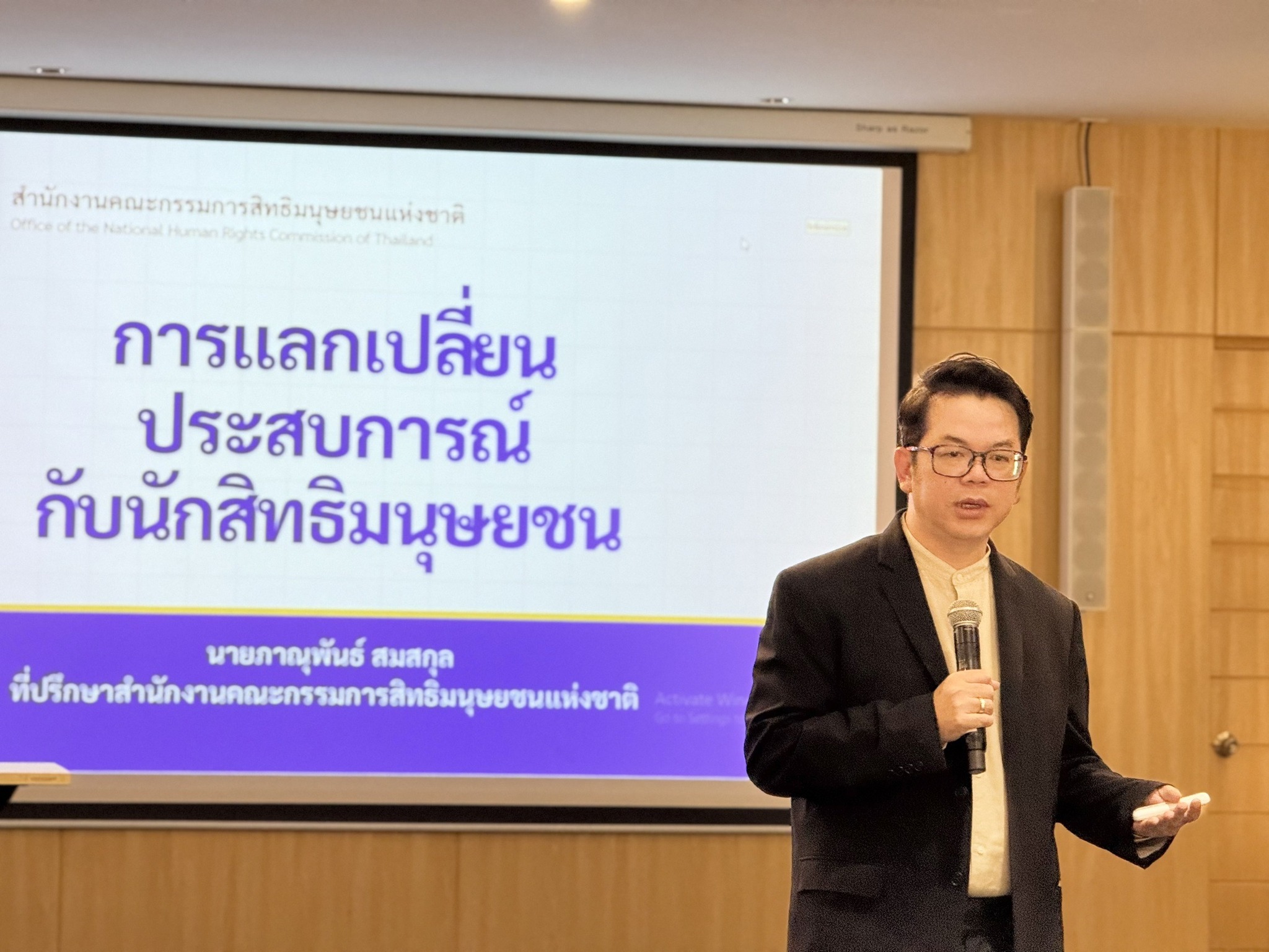 เมื่อวันที่ 21 กรกฎาคม 2568 นายภาณุพันธ์  สมสกุล ที่ปรึกษาสำนักงานคณะกรรมการสิทธิมนุษยชนแห่งชาติได้รับมอบหมายจากเลขาธิการคณะกรรมการสิทธิมนุษยชนแห่งชาติ เป็นวิทยากรบรรยายให้แก่ผู้เข้าอบรมหลักสูตรนักบริหารด้านสิทธิมนุษยชนระดับต้น รุ่นที่ 3 ในหัวข้อ “การแลกเปลี่ยนประสบการณ์กับนักสิทธิมนุษยชน” ซึ่งจัดโดยสถาบันพัฒนาสิทธิมนุษยชน กรมคุ้มครองสิทธิและเสรีภาพ กระทรวงยุติธรรม