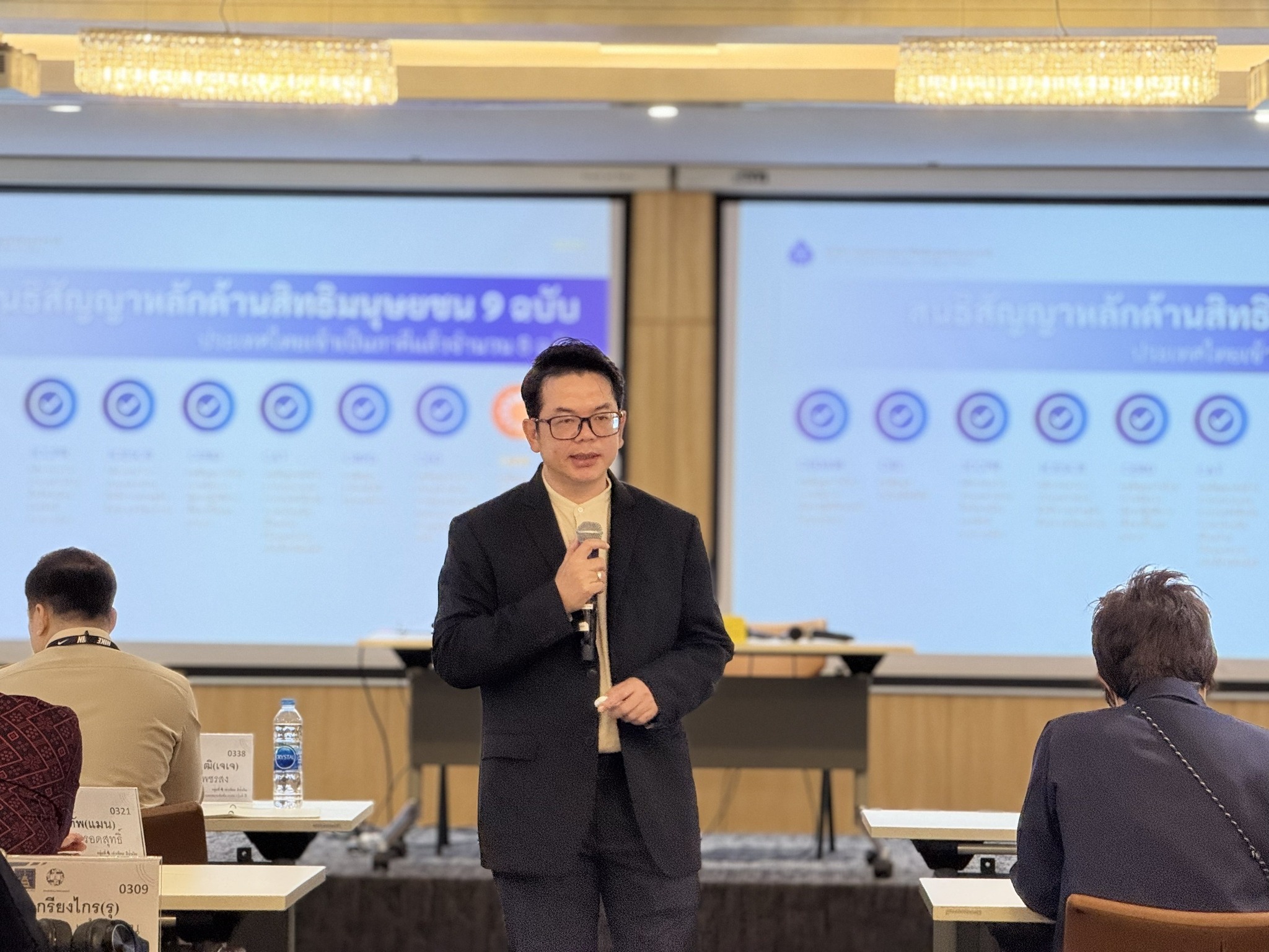 ต่อมาที่ปรึกษาสำนักงาน กสม. ได้นำเสนอภาพรวมสถานการณ์ด้านสิทธิมนุษยชนของประเทศไทยในปี 2567 ซึ่งมีพัฒนาการที่สำคัญ เช่น การเข้าเป็นภาคีอนุสัญญาว่าด้วยการคุ้มครองบุคคลจากการหายสาบสูญโดยถูกบังคับ การยกร่างกฎหมายว่าด้วยการขจัดการเลือกปฏิบัติต่อบุคคล และการถอนข้อสงวนข้อที่ 22 ของอนุสัญญาว่าด้วยสิทธิเด็ก ตลอดจนข้อท้าทายด้านสิทธิมนุษยชนในมิติต่าง ๆ เช่น อุปสรรคในการเข้าถึงกระบวนการยุติธรรม การเปลี่ยนรูปแบบการจ้างงานเป็นจ้างเหมาบริการ และความรุนแรงต่อเด็ก สตรี และกลุ่มเปราะบาง นอกจากนี้ กสม. อยู่ระหว่างจัดทำเครื่องมือสำคัญในการเฝ้าระวังสถานการณ์สิทธิมนุษยชนของประเทศ ผ่านดัชนีสิทธิมนุษยชนซึ่งครอบคลุมในหลายประเด็น ทั้งด้านการค้ามนุษย์ สิทธิในกระบวนการยุติธรรม สิทธิในสุขภาพ สิทธิด้านการศึกษา และสิทธิแรงงาน เป็นต้น