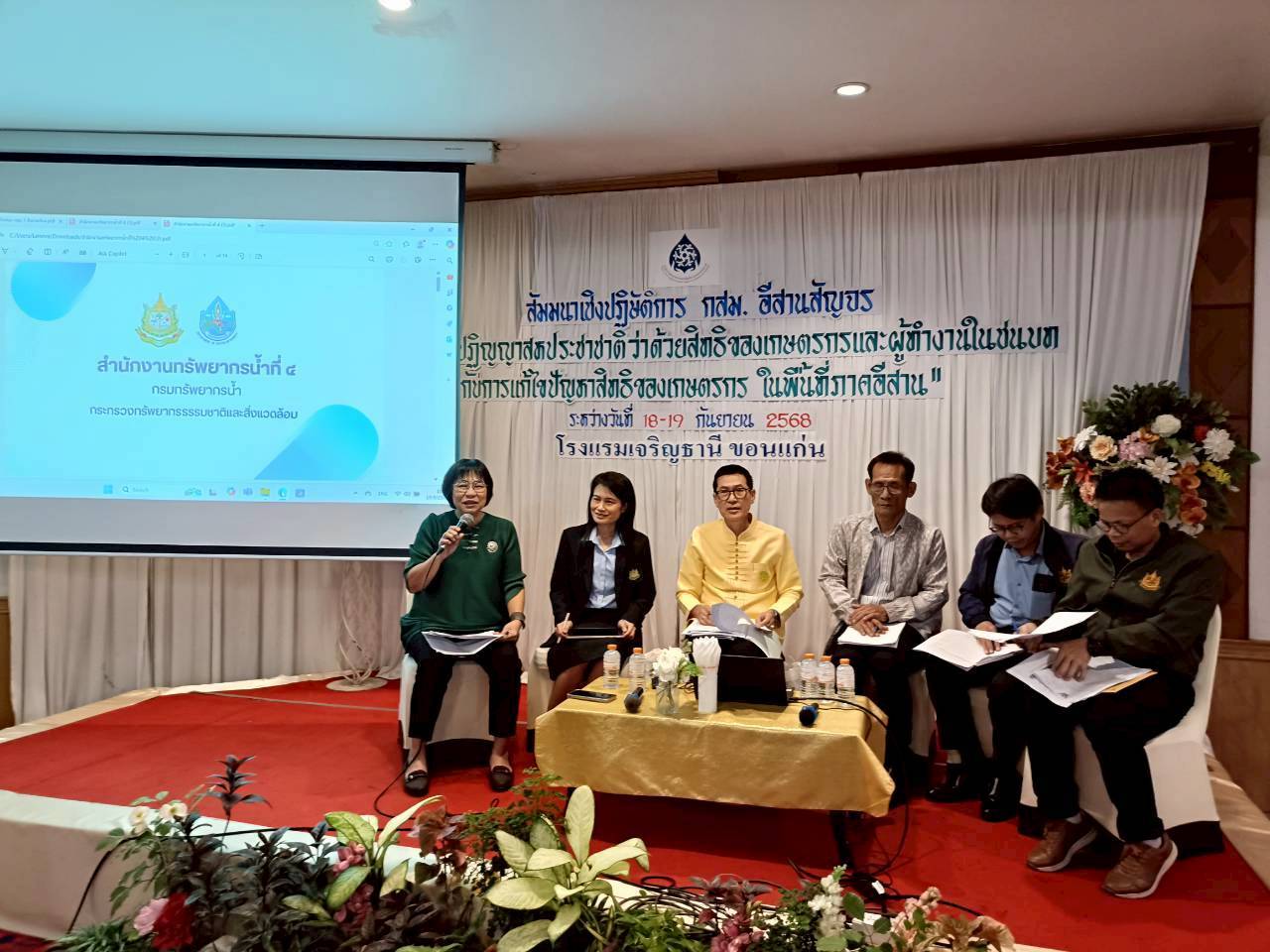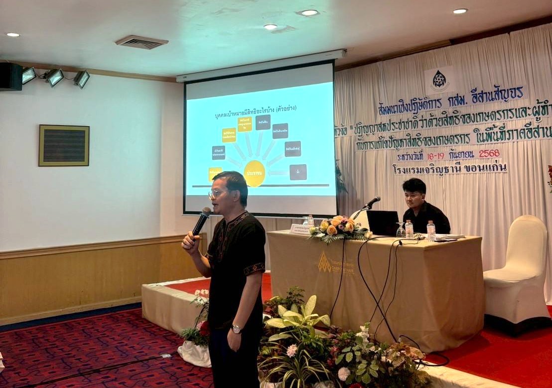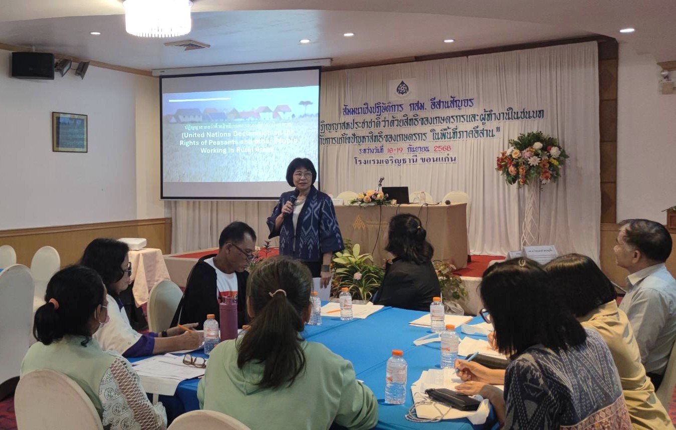 เมื่อวันที่ 18 – 19  กันยายน 2568 ที่โรงแรมเจริญธานี จังหวัดขอนแก่น สำนักงานคณะกรรมการสิทธิมนุษยชนแห่งชาติพื้นที่ภาคตะวันออกเฉียงเหนือ (สำนักงาน กสม. พื้นที่ภาคตะวันออกเฉียงเหนือ) ประสานความร่วมมือกับภาคีเครือข่ายสมัชชาคนจน จัดสัมมนาเชิงปฏิบัติการ กสม. อีสานสัญจร หัวข้อ “ปฏิญญาสหประชาชาติว่าด้วยสิทธิของเกษตรกรและผู้ทำงานในชนบท (UNDROP) กับการแก้ไขปัญหาสิทธิของเกษตรกรในพื้นที่ภาคอีสาน” ทั้งนี้ โดยมีวัตถุประสงค์เพื่อขยายผลการเผยแพร่ความรู้เกี่ยวกับปฏิญญา UNDROP และสิทธิของเกษตรกรซึ่งจะช่วยสร้างความรู้ ความเข้าใจ เพิ่มศักยภาพให้แก่เกษตรกรและสาธารณชนในการปกป้องสิทธิของตนเอง ตลอดจนเพื่อรับทราบสถานการณ์ปัญหา ผลกระทบ และข้อเสนอในการแก้ไขปัญหาเรื่องสิทธิเกษตรกรในภาคตะวันออกเฉียงเหนือ ซึ่งจะช่วยส่งเสริมให้เกิดความร่วมมือและประสานการทำงานร่วมกันระหว่างกลุ่มเกษตรกร องค์กรภาคประชาสังคม และหน่วยงานภาครัฐในพื้นที่ภูมิภาค ในการนำหลักการสิทธิมนุษยชนที่ปรากฏในปฏิญญา UNDROP ไปผลักดันให้เกิดผลในทางไปปฏิบัติต่อไป ทั้งนี้ มีผู้เข้าร่วมกิจกรรมประกอบด้วย เกษตรกรที่ได้รับความเดือดร้อนและผลกระทบด้านสิทธิมนุษยชนประเด็นต่าง ๆ ในพื้นที่ภาคตะวันออกเฉียงเหนือ ผู้แทนหน่วยงานของรัฐที่มีหน้าที่เกี่ยวข้อง นักวิชาการและอาจารย์จากสถาบันการศึกษา และสื่อมวลชน จำนวนรวม 65 คน