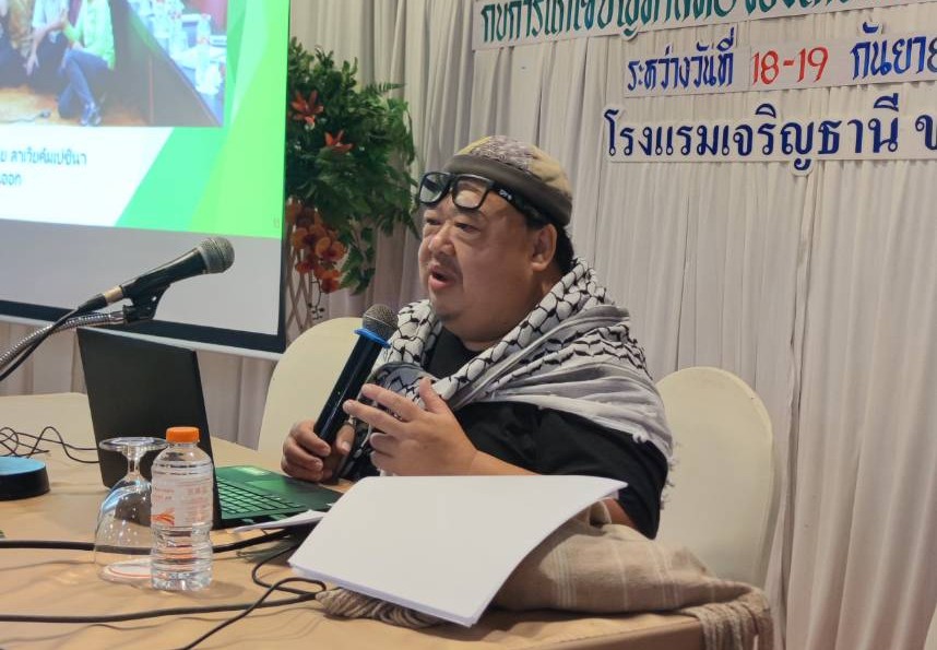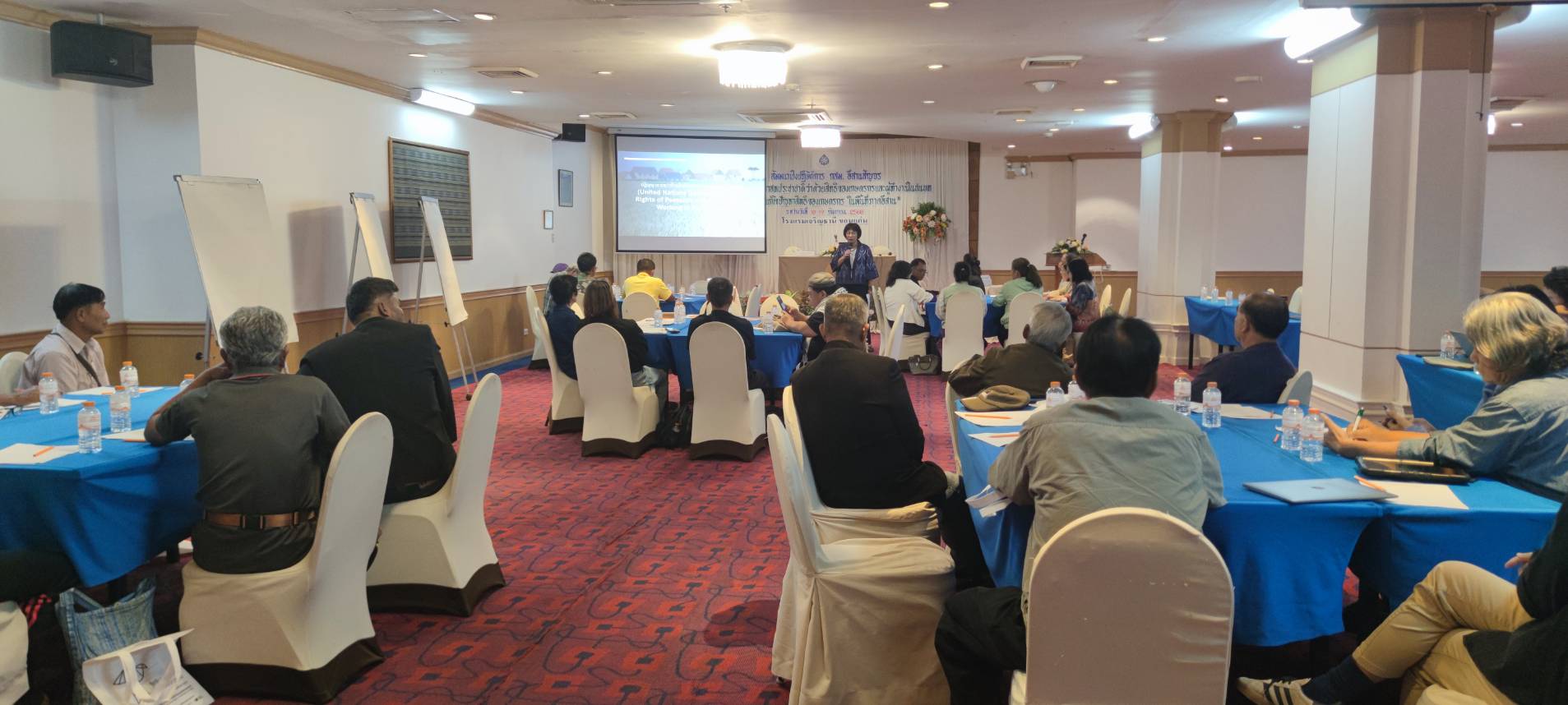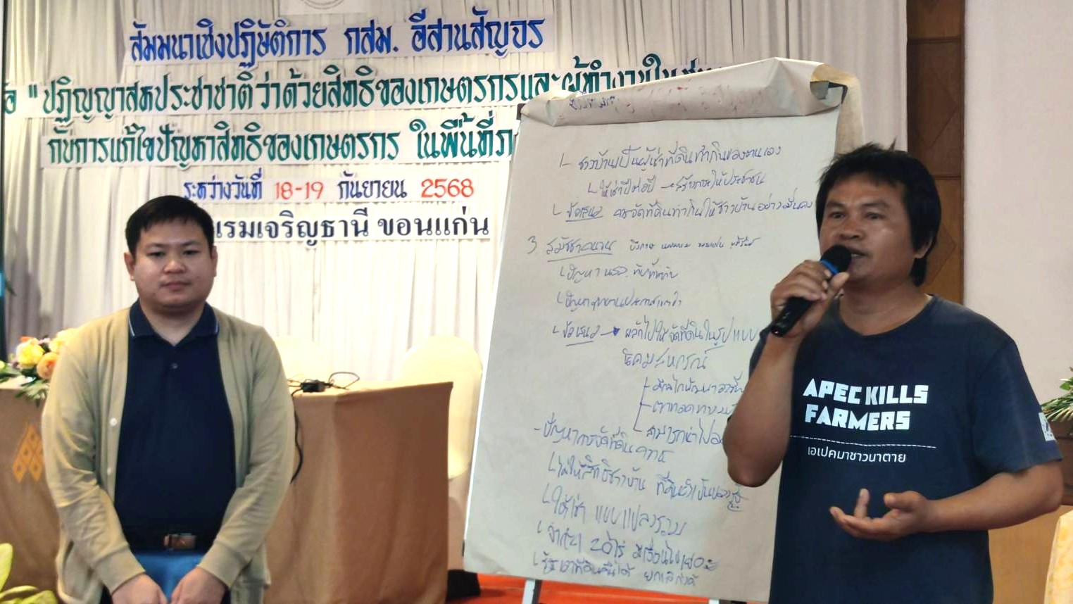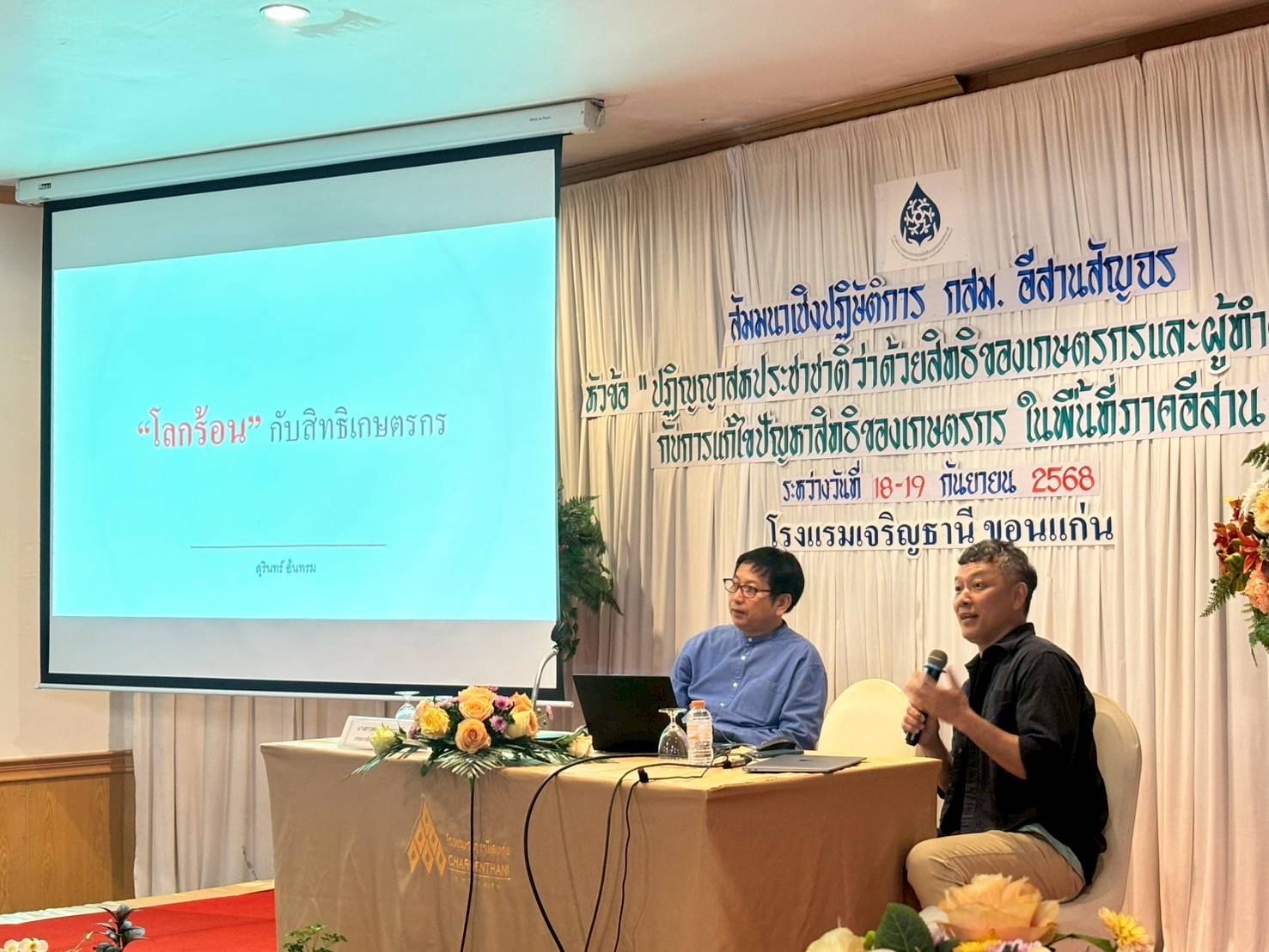 เมื่อวันที่ 18 – 19  กันยายน 2568 ที่โรงแรมเจริญธานี จังหวัดขอนแก่น สำนักงานคณะกรรมการสิทธิมนุษยชนแห่งชาติพื้นที่ภาคตะวันออกเฉียงเหนือ (สำนักงาน กสม. พื้นที่ภาคตะวันออกเฉียงเหนือ) ประสานความร่วมมือกับภาคีเครือข่ายสมัชชาคนจน จัดสัมมนาเชิงปฏิบัติการ กสม. อีสานสัญจร หัวข้อ “ปฏิญญาสหประชาชาติว่าด้วยสิทธิของเกษตรกรและผู้ทำงานในชนบท (UNDROP) กับการแก้ไขปัญหาสิทธิของเกษตรกรในพื้นที่ภาคอีสาน” ทั้งนี้ โดยมีวัตถุประสงค์เพื่อขยายผลการเผยแพร่ความรู้เกี่ยวกับปฏิญญา UNDROP และสิทธิของเกษตรกรซึ่งจะช่วยสร้างความรู้ ความเข้าใจ เพิ่มศักยภาพให้แก่เกษตรกรและสาธารณชนในการปกป้องสิทธิของตนเอง ตลอดจนเพื่อรับทราบสถานการณ์ปัญหา ผลกระทบ และข้อเสนอในการแก้ไขปัญหาเรื่องสิทธิเกษตรกรในภาคตะวันออกเฉียงเหนือ ซึ่งจะช่วยส่งเสริมให้เกิดความร่วมมือและประสานการทำงานร่วมกันระหว่างกลุ่มเกษตรกร องค์กรภาคประชาสังคม และหน่วยงานภาครัฐในพื้นที่ภูมิภาค ในการนำหลักการสิทธิมนุษยชนที่ปรากฏในปฏิญญา UNDROP ไปผลักดันให้เกิดผลในทางไปปฏิบัติต่อไป ทั้งนี้ มีผู้เข้าร่วมกิจกรรมประกอบด้วย เกษตรกรที่ได้รับความเดือดร้อนและผลกระทบด้านสิทธิมนุษยชนประเด็นต่าง ๆ ในพื้นที่ภาคตะวันออกเฉียงเหนือ ผู้แทนหน่วยงานของรัฐที่มีหน้าที่เกี่ยวข้อง นักวิชาการและอาจารย์จากสถาบันการศึกษา และสื่อมวลชน จำนวนรวม 65 คน