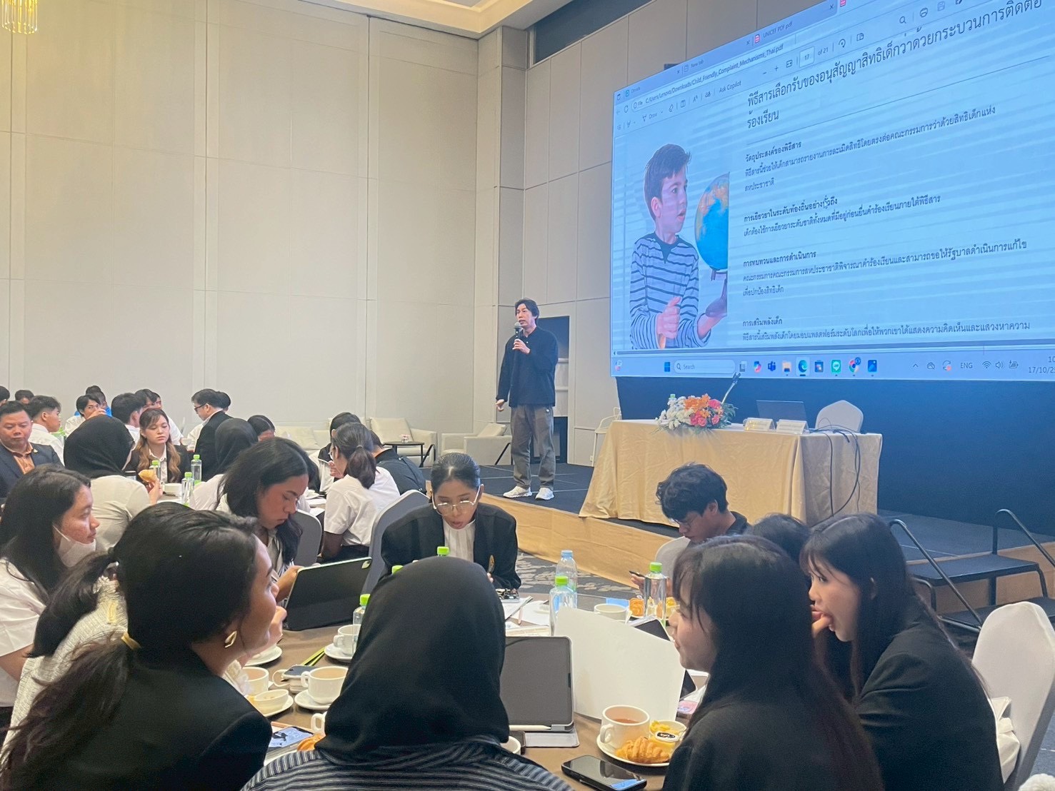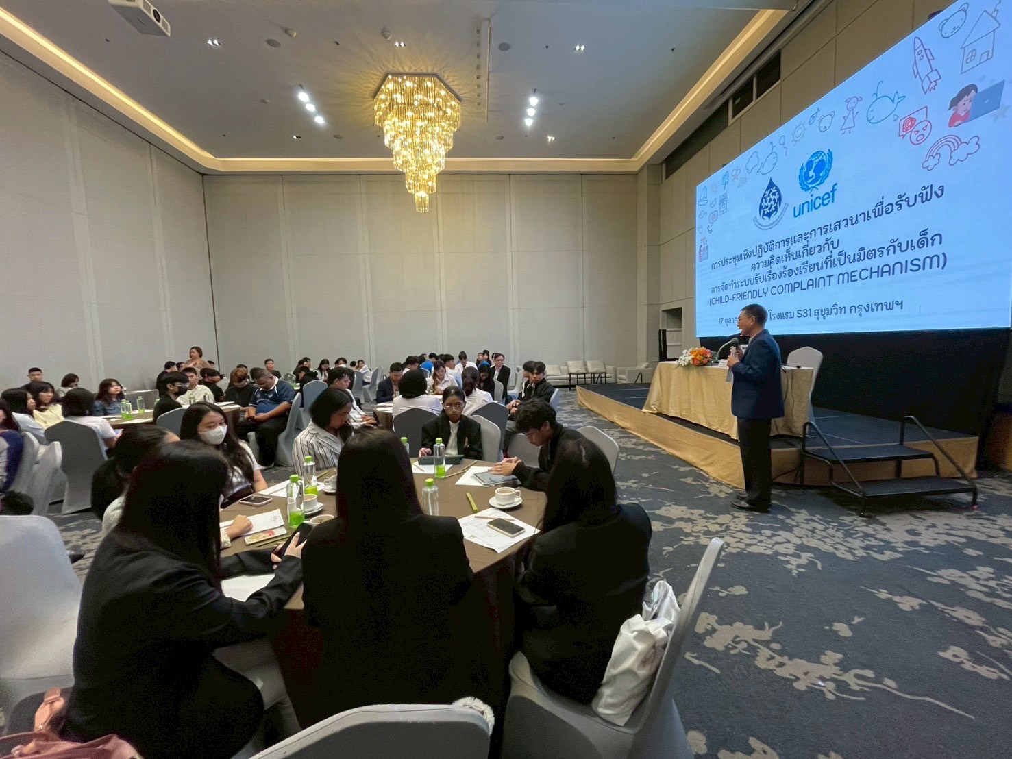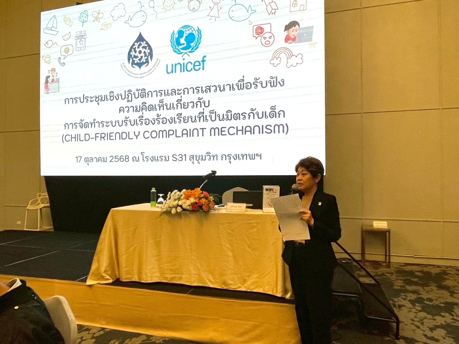 เมื่อวันที่ 16 ตุลาคม 2568 ที่โรงแรม S31 สุขุมวิท กรุงเทพฯ สำนักงานคณะกรรมการสิทธิมนุษยชนแห่งชาติ (สำนักงาน กสม.) ร่วมกับองค์การทุนเพื่อเด็กแห่งสหประชาชาติ (UNICEF) ประเทศไทย จัดการประชุมเชิงปฏิบัติการและการเสวนาเพื่อรับฟังความคิดเห็นจากผู้มีส่วนเกี่ยวข้อง โดยเฉพาะเด็กและเยาวชนเกี่ยวกับการจัดทำกลไกรับเรื่องร้องเรียนที่เป็นมิตรกับเด็ก (Child-friendly Complaint Mechanism) เพื่อสร้างการมีส่วนร่วมของเด็กตั้งแต่กระบวนการออกแบบ และพัฒนาแพลตฟอร์มออนไลน์ของระบบรับเรื่องร้องเรียนที่เหมาะสมและเป็นมิตรกับเด็ก รวมถึงเพื่อยกระดับการเข้าถึง การตอบสนองและประสิทธิภาพของกลไกรับเรื่องร้องเรียนของคณะกรรมการสิทธิมนุษยชนแห่งชาติ (กสม.) ซึ่งมีผู้เข้าร่วมการประชุมประกอบด้วย ผู้แทนเด็กและเยาวชนกลุ่มต่าง ๆ ผู้ปกครอง ผู้ดูแล และผู้แทนจากหน่วยงานและภาคส่วนที่เกี่ยวข้อง โดยมี นายวสันต์  ภัยหลีกลี้ กรรมการสิทธิมนุษยชนแห่งชาติ พร้อมด้วยนางสรวงมณฑ์  สิทธิสมาน ที่ปรึกษาประจำ กสม. และนางสาวหรรษา  หอมหวล เลขาธิการ กสม. เข้าร่วมกิจกรรม โดยกรรมการสิทธิมนุษยชนแห่งชาติได้กล่าวเปิดการเสวนาโดยเน้นย้ำถึงความสำคัญของการมีระบบรับเรื่องร้องเรียนที่มีประสิทธิภาพ ตอบสนองและเข้าถึงบุคคลทุกกลุ่มโดยเฉพาะกลุ่มเด็กและเยาวชน