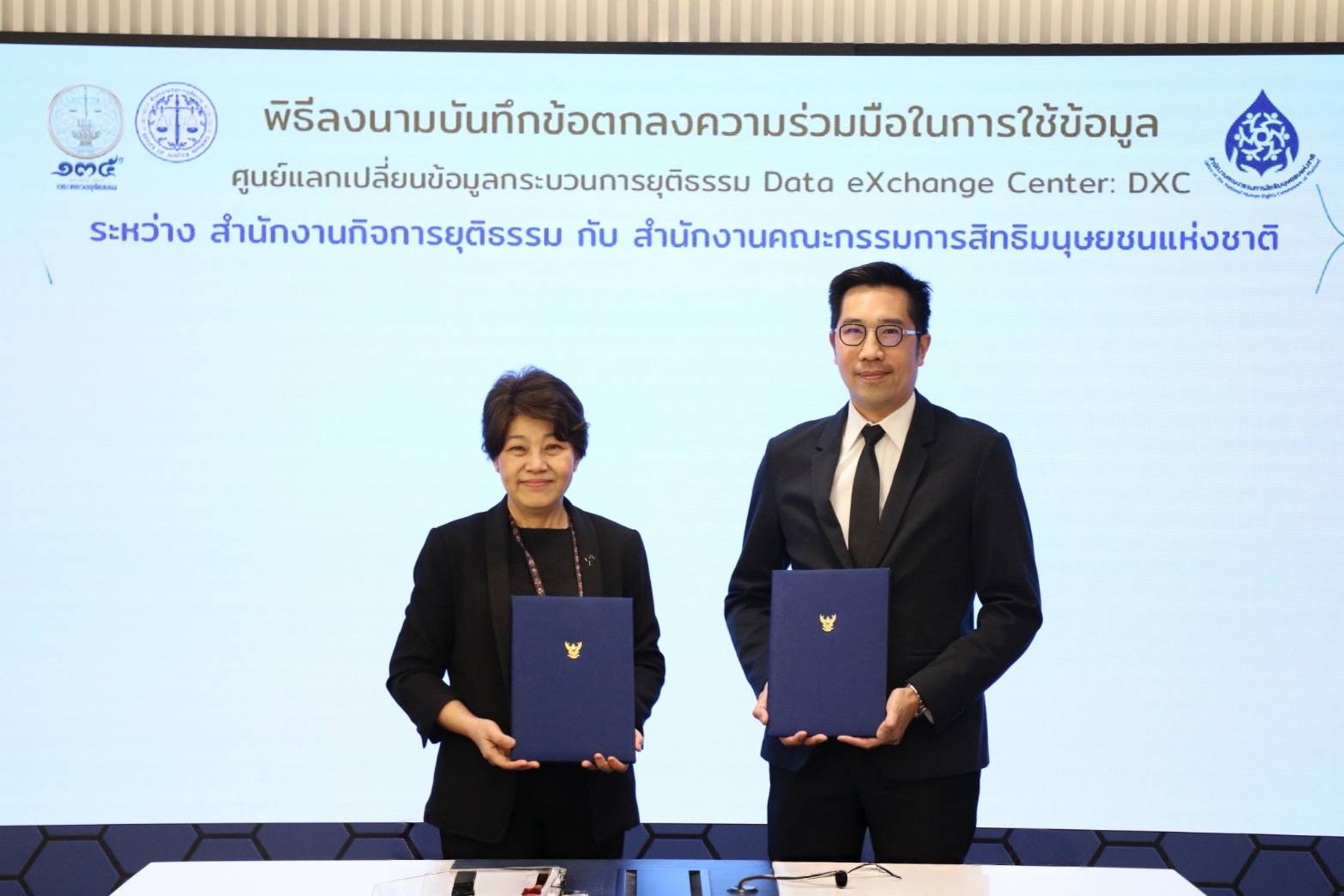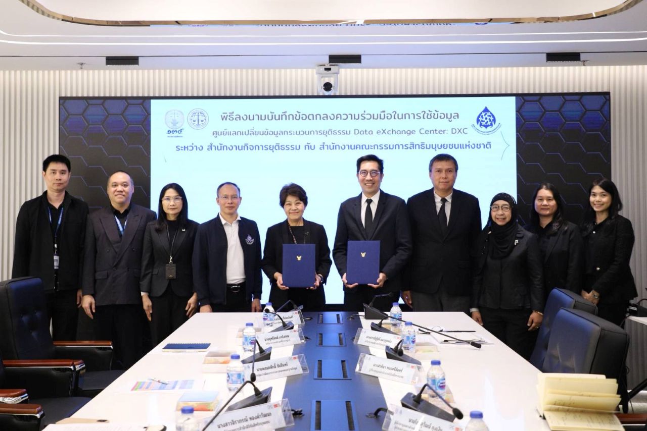วันที่ 4 มีนาคม 2569 เวลา 13.30 น. สำนักงานคณะกรรมการสิทธิมนุษยชนแห่งชาติ (สำนักงาน กสม.) ร่วมกับสำนักงานกิจการยุติธรรม จัดพิธีลงนามบันทึกข้อตกลงความร่วมมือในการดำเนินงานของศูนย์แลกเปลี่ยนข้อมูลกระบวนการยุติธรรม (Data Exchange Center : DXC) ระหว่างสำนักงาน กสม. กับสำนักงานกิจการยุติธรรม โดยมี นางสาวหรรษา  หอมหวล เลขาธิการคณะกรรมการสิทธิมนุษยชนแห่งชาติ และนายยอดฉัตร  ตสาริกา ที่ปรึกษาด้านกฎหมาย รักษาราชการแทนผู้อำนวยการสำนักงานกิจการยุติธรรม เป็นผู้แทนลงนามในบันทึกข้อตกลงฯ ในการนี้ นายภาณุวัฒน์  ทองสุข  รองเลขาธิการคณะกรรมการสิทธิมนุษยชนแห่งชาติ ผู้บริหาร และเจ้าหน้าที่สำนักงาน กสม. ร่วมเป็นสักขีพยานในพิธีลงนามบันทึกข้อตกลงความร่วมมือด้วย ณ ห้องประชุม กพยช. สำนักงานกิจการยุติธรรม