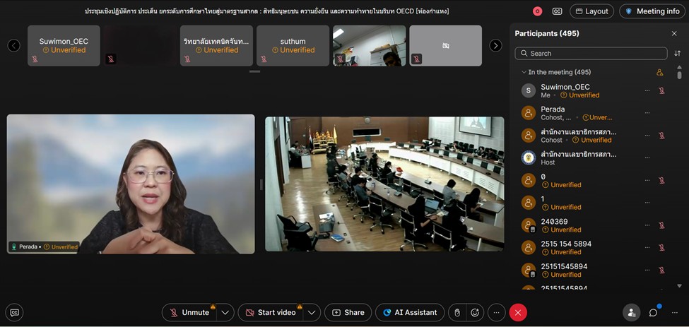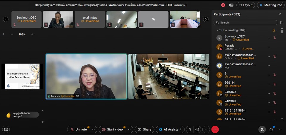 เมื่อวันที่ 24 มีนาคม 2569 นางสาวพีรดา  ภูมิสวัสดิ์ ผู้อำนวยการสำนักเฝ้าระวังและประเมินสถานการณ์สิทธิมนุษยชน ในฐานะได้รับมอบหมายจากเลขาธิการคณะกรรมการสิทธิมนุษยชนแห่งชาติ เข้าร่วมเป็นวิทยากรให้แก่สำนักงานสภาการศึกษาในการประชุมเชิงปฏิบัติการ “การยกระดับการศึกษาไทยสู่มาตรฐานสากล: สิทธิมนุษยชน ความยั่งยืน และความท้าทายในบริบท OECD” ณ สำนักงานเลขาธิการสภาการศึกษาและผ่านระบบการประชุมออนไลน์ เพื่อสร้างความรู้ความเข้าใจในการยกระดับการศึกษาไทยสู่มาตรฐานสากล และการเข้าร่วมเป็นสมาชิกองค์การ เพื่อความร่วมมือทางเศรษฐกิจและการพัฒนา (Organisation for Economic Co-operation and Development: OECD) โดยมีผู้บริหารและเจ้าหน้าที่ของสภาการศึกษา ผู้บริหารและเจ้าหน้าที่สถาบันการศึกษา หน่วยงานที่เกี่ยวข้องด้านการศึกษาในส่วนกลางและภูมิภาคเข้าร่วม รวมจำนวน 582 คน โดยผู้แทนสำนักงาน กสม. ได้นำเสนอหลักสิทธิมนุษยชน กรอบพันธกรณีระหว่างประเทศด้านสิทธิมนุษยชน ความเชื่อมโยงของสิทธิมนุษยชนและการศึกษา บริบทสถานการณ์โลกที่ส่งผลต่อสิทธิด้านศึกษา และแนวทางในการบูรณาการมิติสิทธิมนุษยชนเข้าสู่ระบบการศึกษา เพื่อสอดคล้องกับมาตรฐานในระดับสากล รวมทั้งได้แลกเปลี่ยนกับผู้เข้าร่วมประชุมในประเด็นสิทธิการศึกษา