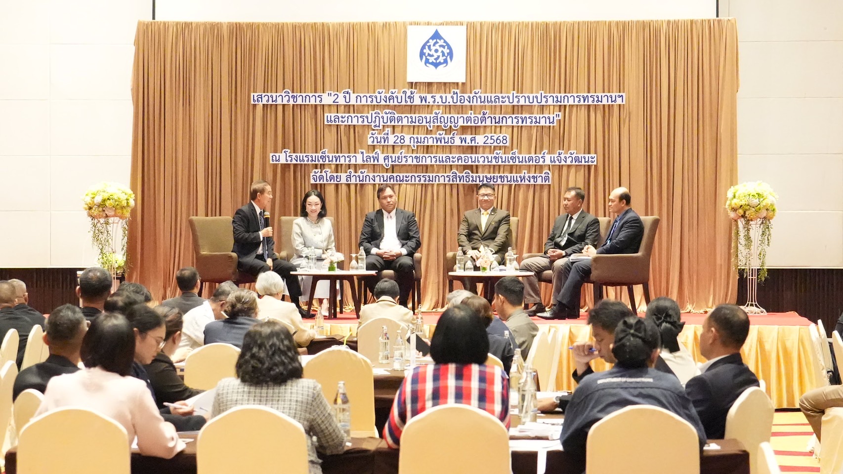 วันที่ 28 กุมภาพันธ์ 2568 เวลา 09.00 น. ที่ห้องวายุภักษ์ 2 โรงแรมเซ็นทารา ไลฟ์ ศูนย์ราชการ และคอนเวนชันเซ็นเตอร์ สำนักงานคณะกรรมการสิทธิมนุษยชนแห่งชาติ (สำนักงาน กสม.) ร่วมกับกรมคุ้มครองสิทธิและเสรีภาพ สถาบันนิติวัชร์ และมูลนิธิผสานวัฒนธรรม จัดการเสวนาวิชาการ หัวข้อ 2 ปี การบังคับใช้ พ.ร.บ.ป้องกันและปราบปรามการทรมานฯ และการปฏิบัติตามอนุสัญญาต่อต้านการทรมาน โดยมีวัตถุประสงค์เพื่อจัดทำข้อเสนอแนะเชิงนโยบายไปยังรัฐสภา คณะรัฐมนตรี และหน่วยงานที่เกี่ยวข้อง และติดตามและขับเคลื่อนการบังคับใช้พระราชบัญญัติป้องกันและปราบปรามการทรมานและการกระทำให้บุคคลสูญหาย พ.ศ. 2565  ให้เป็นไปอย่างมีประสิทธิภาพ สมดังเจตนารมณ์ของกฎหมาย เพื่อให้เป็นไปตามข้อมติสมัชชาสิทธิมนุษยชน ที่ กสม. ร่วมกับภาคีเครือข่ายดำเนินการมาอย่างต่อเนื่อง