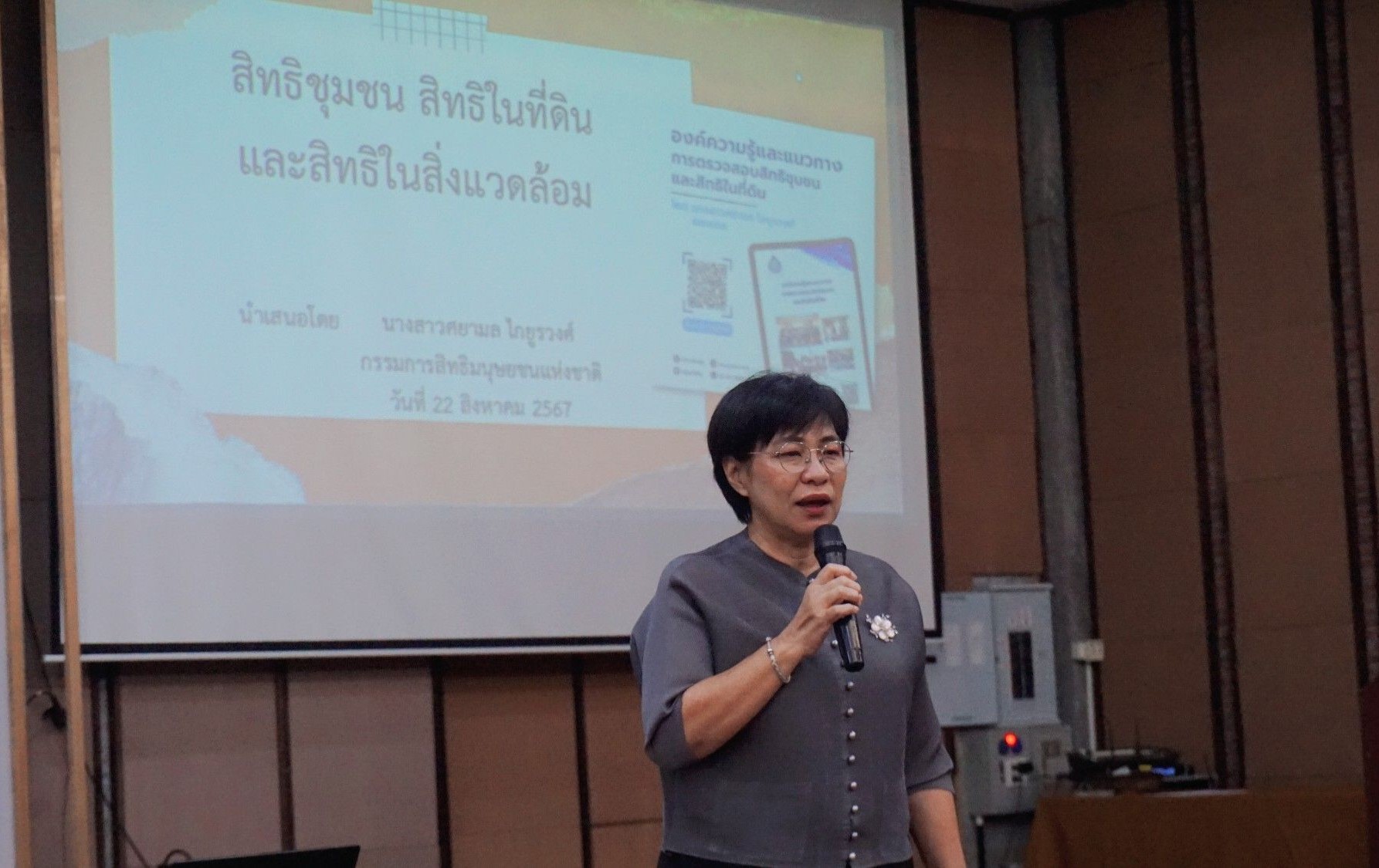 ทั้งนี้ ในวันที่ 17 พฤษภาคม 2568 นางสาวศยามล  ไกยูรวงศ์ กรรมการสิทธิมนุษยชนแห่งชาติ เป็นประธานกล่าวเปิดงานและบรรยายพิเศษ หัวข้อ สิทธิชุมชน สิทธิในที่ดิน และสิทธิในสิ่งแวดล้อม โดยกล่าวว่า ภาคประชาชนคือแรงขับเคลื่อนให้เกิดการเปลี่ยนแปลงทางสังคมที่สำคัญ ทุกท่านที่เข้าร่วมกิจกรรมนี้ คือ “นักปกป้องสิทธิมนุษยชนตามนิยามของสหประชาชาติ” ที่ทำหน้าที่ส่งเสริมและคุ้มครองสิทธิมนุษยชนในประเด็นสิทธิชุมชนและสิ่งแวดล้อมให้แก่คนจำนวนมากในชุมชน ในอดีตชุมชนจะมีความรู้สึกหวาดกลัวที่ต้องลุกขึ้นมาปกป้องคุ้มครองสิทธิมนุษยชนของตนเอง ภาคประชาสังคมจึงมีบทบาทในการเป็นพี่เลี้ยงให้ชุมชนสามารถดูแลตนเองในส่วนนี้ คณะกรรมการสิทธิมนุษยชนแห่งชาติ (กสม.) ได้รับเรื่องร้องเรียนประเด็นสิทธิในสิ่งแวดล้อมจำนวนมาก ข้อร้องเรียนที่มีจำนวนมากที่สุด คือ การเข้าไม่ถึงกระบวนการรับฟังความคิดเห็นจากโครงการพัฒนาต่าง ๆ ในอดีตการเป็นกระบอกเสียงเผยแพร่ประเด็นต่างๆ สู่สังคมในวงกว้างที่ยังมีข้อจำกัด แต่ปัจจุบันเทคโนโลยีมีความเปลี่ยนแปลง ทุกคนสามารถทำข้อมูลสื่อสารไปสู่สังคมได้ในบทบาทนักข่าวพลเมือง จึงขอให้ทุกท่านช่วยกันใช้กระบวนการลักษณะนี้ส่งเสริมและคุ้มครองสิทธิชุมชนของเราร่วมกัน