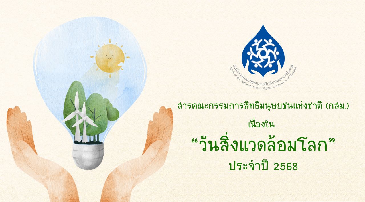 เนื่องในวันสิ่งแวดล้อมโลก 5 มิถุนายน ประจำปี 2568 นี้ กสม. ขอเน้นย้ำถึงความสำคัญของสิทธิในสิ่งแวดล้อมที่ดี โดยเฉพาะประเด็นการมีส่วนร่วมของประชาชนในการเข้าถึงข้อมูลข่าวสาร การตัดสินใจด้านสิ่งแวดล้อม และการเข้าถึงความยุติธรรมด้านสิ่งแวดล้อม และขอให้ทุกภาคส่วนได้ร่วมกันอนุรักษ์ ฟื้นฟูสิ่งแวดล้อม และใช้ประโยชน์จากทรัพยากรธรรมชาติโดยคำนึงถึงการพัฒนาที่ยั่งยืน และไม่ทิ้งใครไว้ข้างหลัง