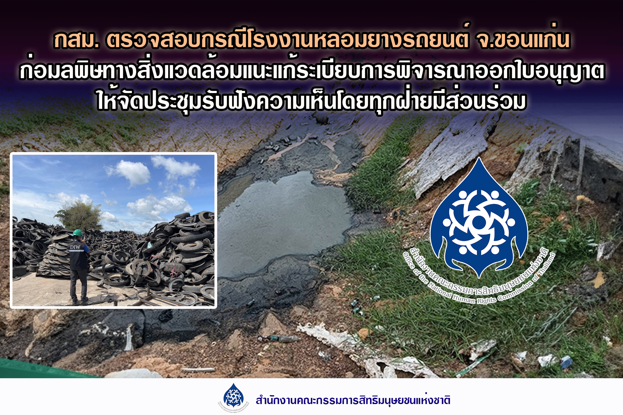 นายวสันต์  ภัยหลีกลี้ กรรมการสิทธิมนุษยชนแห่งชาติ เปิดเผยว่า คณะกรรมการสิทธิมนุษยชนแห่งชาติ (กสม.) ได้รับเรื่องร้องเรียนจากผู้ร้องรายหนึ่งเมื่อเดือนกรกฎาคม 2567 ระบุว่า ผู้ร้องเป็นตัวแทนประชาชนที่ได้รับความเดือดร้อนจากการประกอบกิจการโรงงานหลอมยางรถยนต์ของบริษัทเอกชนแห่งหนึ่ง (ผู้ถูกร้องที่ 1) ในพื้นที่ ต.โคกสูง อ.อุบลรัตน์ จ.ขอนแก่น โรงงานดังกล่าวประกอบกิจการทำน้ำมันเชื้อเพลิงทดแทนจากยางรถยนต์และพลาสติกใช้แล้ว ตั้งแต่เดือนกุมภาพันธ์ 2567 และก่อให้เกิดผลกระทบต่อสิ่งแวดล้อมและที่อยู่อาศัยของประชาชนใกล้เคียงหลายหมู่บ้าน ทั้งปัญหาฝุ่นละออง กลิ่นเหม็นจากการหลอมยางรถยนต์ และน้ำเสีย รวมถึงประชาชนในพื้นที่ไม่มีส่วนร่วมหรือเคยได้รับรู้ข้อมูลข่าวสารก่อนการขออนุญาตประกอบกิจการโรงงาน และการพิจารณาออกใบอนุญาตโดยสำนักงานอุตสาหกรรมจังหวัดขอนแก่น (ผู้ถูกร้องที่ 2) และกรมโรงงานอุตสาหกรรม (ผู้ถูกร้องที่ 3) ยังมีความเร่งรีบเกินสมควร จึงขอให้ตรวจสอบ