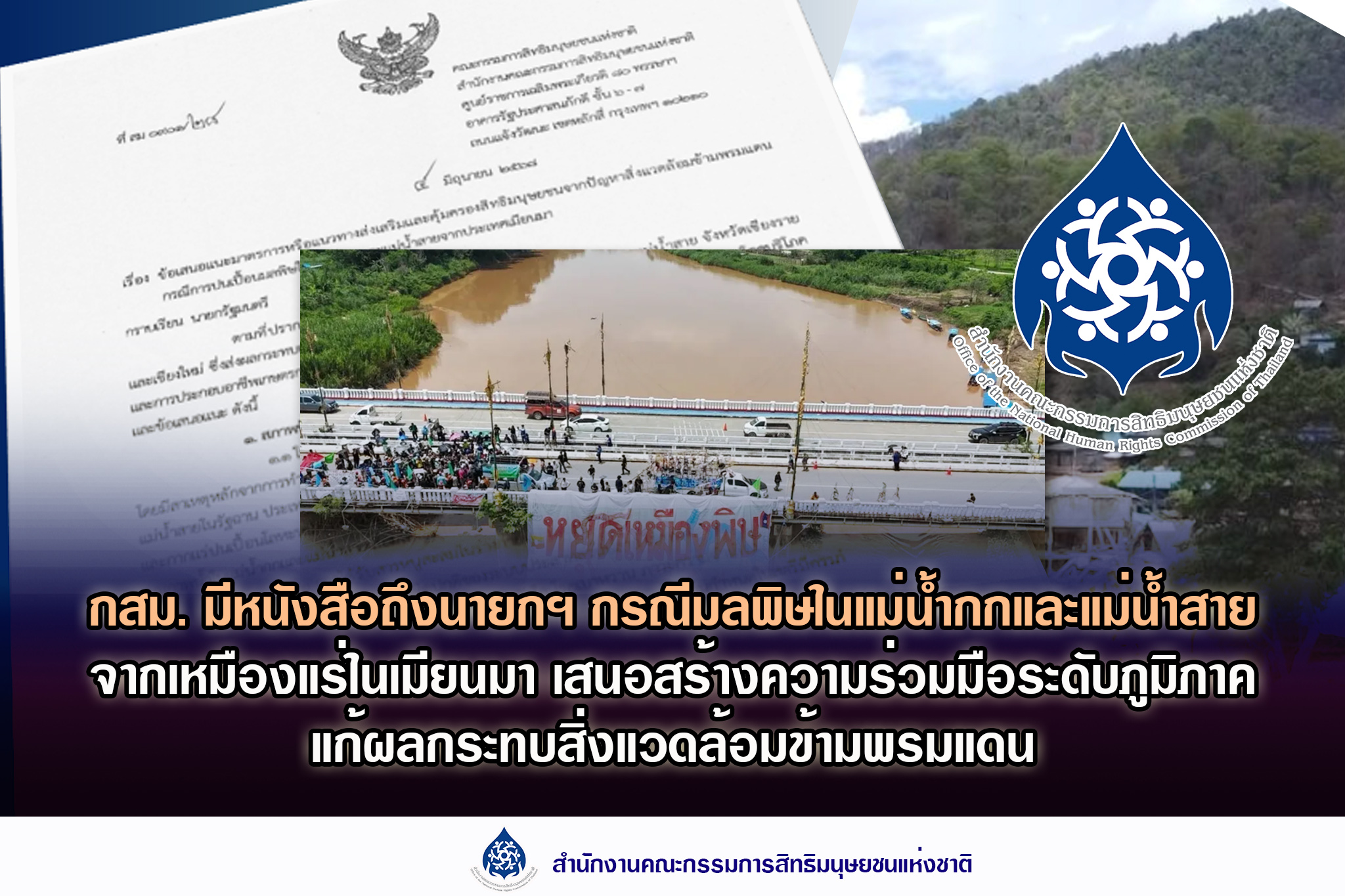 2. กสม. มีหนังสือถึงนายกรัฐมนตรี กรณีปัญหามลพิษในแม่น้ำกกและแม่น้ำสายจากการทำเหมืองแร่ในเมียนมา เสนอเร่งแก้ไขเยียวยาประชาชน แนะสร้างความร่วมมือระดับภูมิภาคแก้ผลกระทบสิ่งแวดล้อมข้ามพรมแดน