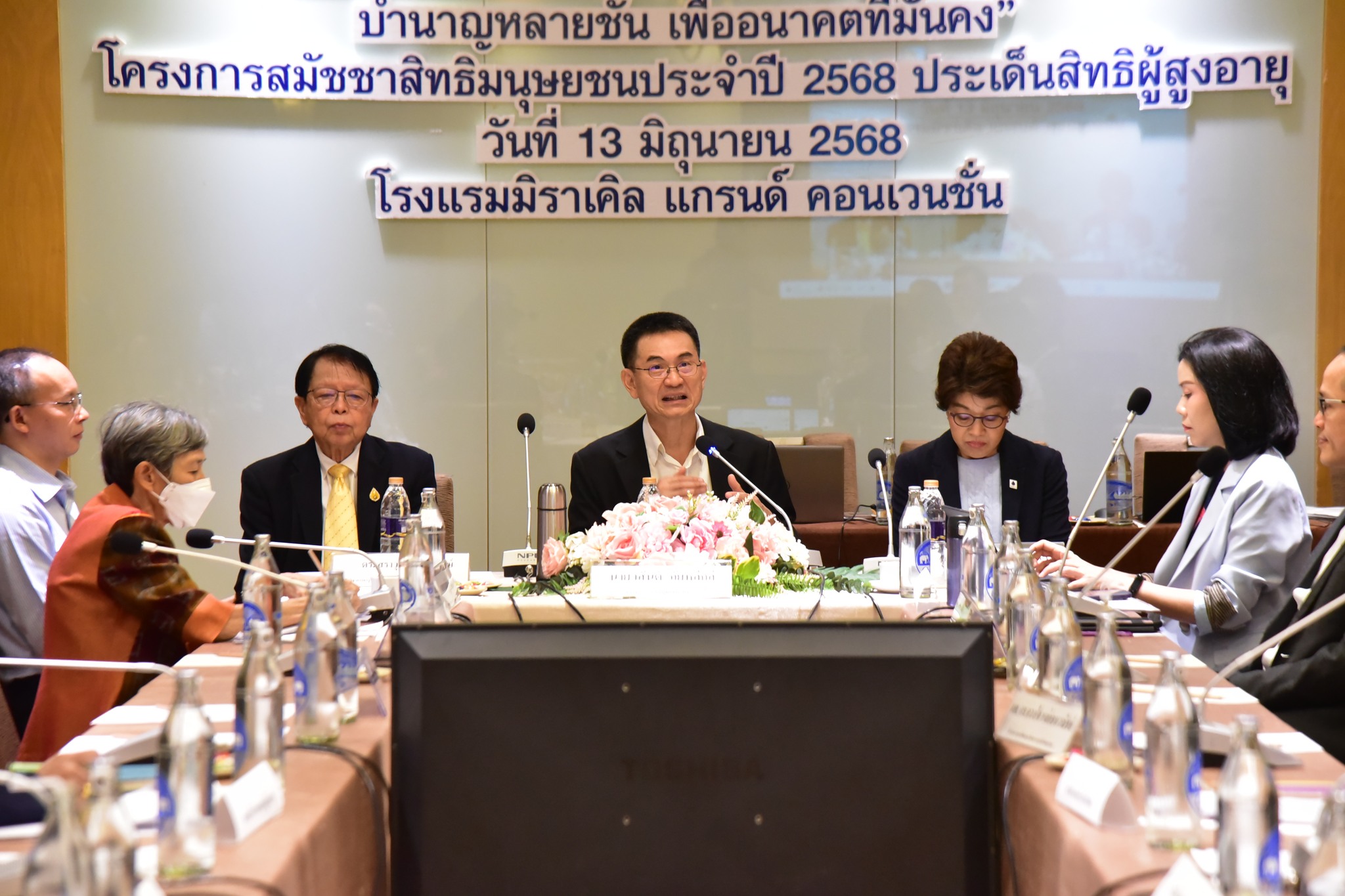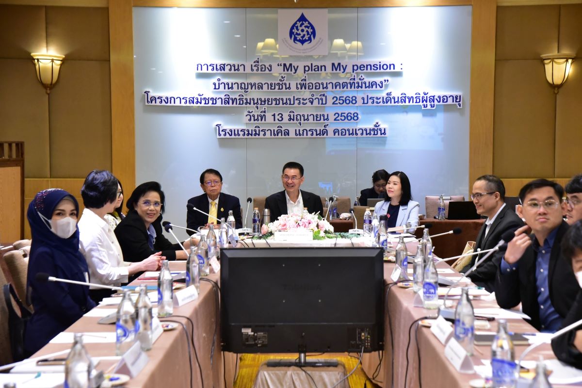 เมื่อวันที่ 13 มิถุนายน 2568 เวลา 9.00 น. นายวสันต์  ภัยหลีกลี้ กรรมการสิทธิมนุษยชนแห่งชาติ พร้อมด้วยนางสาวหรรษา  หอมหวล เลขาธิการ กสม. นายภาณุวัฒน์  ทองสุข รองเลขาธิการ กสม. และเจ้าหน้าที่สำนักงาน กสม. เข้าร่วมการเสวนา "MY PLAN, MY PENSION: บำนาญหลายชั้น เพื่ออนาคตที่มั่นคง" เนื่องในโครงการสมัชชาสิทธิมนุษยชน ประจำปี 2568 ประเด็นสิทธิผู้สูงอายุ โดยมีผู้แทนจากหน่วยงานภาครัฐ ภาคประชาสังคม และสถาบันวิชาการ ประกอบด้วย สำนักงานประกันสังคม สำนักงานเศรษฐกิจการคลัง สำนักงานสภาพัฒนาการเศรษฐกิจและสังคมแห่งชาติ กรมสวัสดิการและคุ้มครองแรงงาน สำนักงานเลขาธิการสภาผู้แทนราษฎร รัฐสภา กองบริหารกองทุนผู้สูงอายุ กองทุนบำเหน็จบำนาญข้าราชการ ศูนย์พัฒนาธุรกิจและการดูแลสังคมสูงอายุ และเพจมนุษย์ต่างวัย เข้าร่วมเสวนา ณ ห้องประชุม Gemini โรงแรมมิราเคิล แกรนด์ คอนเวนชั่น โดยแบ่งการเสวนาเป็น 2 ช่วง ดังนี้
