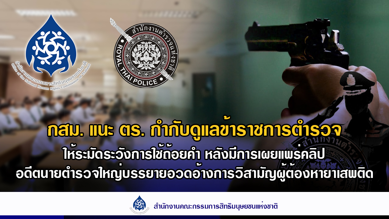 1. กสม. แนะ ตร. กำกับดูแลข้าราชการตำรวจให้ระมัดระวังการใช้ถ้อยคำ หลังมีการเผยแพร่คลิปอดีตนายตำรวจใหญ่บรรยายอวดอ้างการวิสามัญผู้ต้องหายาเสพติด ห่วงกระทบความเชื่อมั่นกระบวนการยุติธรรมทางอาญา