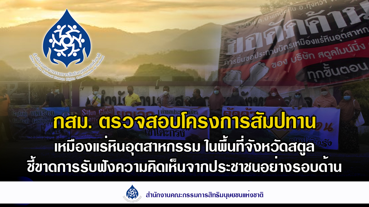 นายภาณุวัฒน์  ทองสุข รองเลขาธิการคณะกรรมการสิทธิมนุษยชนแห่งชาติ เปิดเผยว่า คณะกรรมการสิทธิมนุษยชนแห่งชาติ (กสม.) ได้รับเรื่องร้องเรียนเมื่อเดือนพฤษภาคม 2565 ระบุว่า การดำเนินโครงการสัมปทานเหมืองแร่หินอุตสาหกรรมในจังหวัดสตูล 2 แห่ง เข้าข่ายไม่ชอบด้วยกฎหมายและขัดต่อหลักสิทธิมนุษยชนในประเด็นการมีส่วนร่วมของประชาชนในกระบวนการจัดทำรายงานการประเมินผลกระทบสิ่งแวดล้อม (EIA) โดยการขอประทานบัตรเหมืองแร่ที่ 1/2559 ในพื้นที่เขาลูกเล็กลูกใหญ่ ตำบลป่าแก่บ่อหิน อำเภอทุ่งหว้า มีการปิดกั้นการแสดงความคิดเห็นของประชาชนผู้ได้รับผลกระทบโดยตรง และไม่ได้นำข้อเท็จจริงของสภาพพื้นที่มาศึกษาอย่างรอบด้าน อีกทั้งในรายงานผลการสำรวจพื้นที่ของกรมป่าไม้ ที่ระบุว่า ไม่มีสภาพพื้นที่ป่าสมบูรณ์นั้น ขัดแย้งกับข้อเท็จจริงจากการสำรวจครั้งแรกร่วมกับตัวแทนประชาชนในพื้นที่ซึ่งพบว่า เป็นป่าในเขตพื้นที่ป่าเพื่อการอนุรักษ์โซน C และเป็นแหล่งน้ำซับซึม ตามพระราชบัญญัติแร่ พ.ศ. 2560 นอกจากนี้ พื้นที่ดังกล่าวเป็นถิ่นที่อยู่อาศัยและดำรงชีวิตของกลุ่มชาติพันธุ์มานิ และการขอประทานบัตรเหมืองแร่ที่ 4/2559 ในพื้นที่เขาโต๊ะกรัง ตำบลควนโดน อำเภอควนโดน และตำบลทุ่งนุ้ย อำเภอควนกาหลง ไม่ได้นำข้อร้องเรียนจากประชาชนในพื้นที่ไปพิจารณาและประชาชนไม่ได้รับแจ้งให้เข้าร่วมเวทีการรับฟังความคิดเห็นที่จัดขึ้นเพิ่มเติม สภาพพื้นที่เป็นแหล่งต้นน้ำอยู่ใกล้กับบ้านเรือนประชาชน โรงเรียนสอนศาสนาและแหล่งโบราณคดีที่สำคัญของจังหวัด
