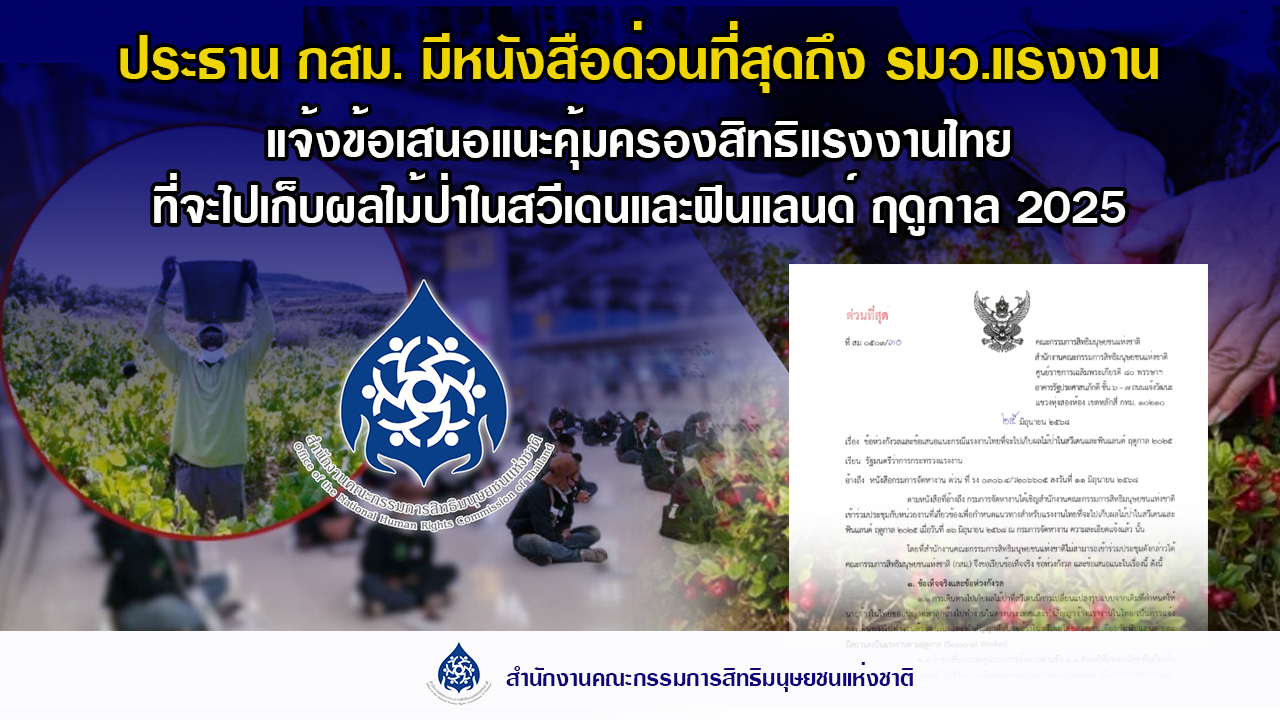 3. ประธาน กสม. มีหนังสือด่วนที่สุดถึง รมว.แรงงาน แจ้งข้อห่วงกังวลและข้อเสนอแนะกรณีแรงงานไทยที่จะไปเก็บผลไม้ป่าในสวีเดนและฟินแลนด์ ฤดูกาล 2025 เพื่อคุ้มครองมิให้ถูกละเมิดสิทธิฯ