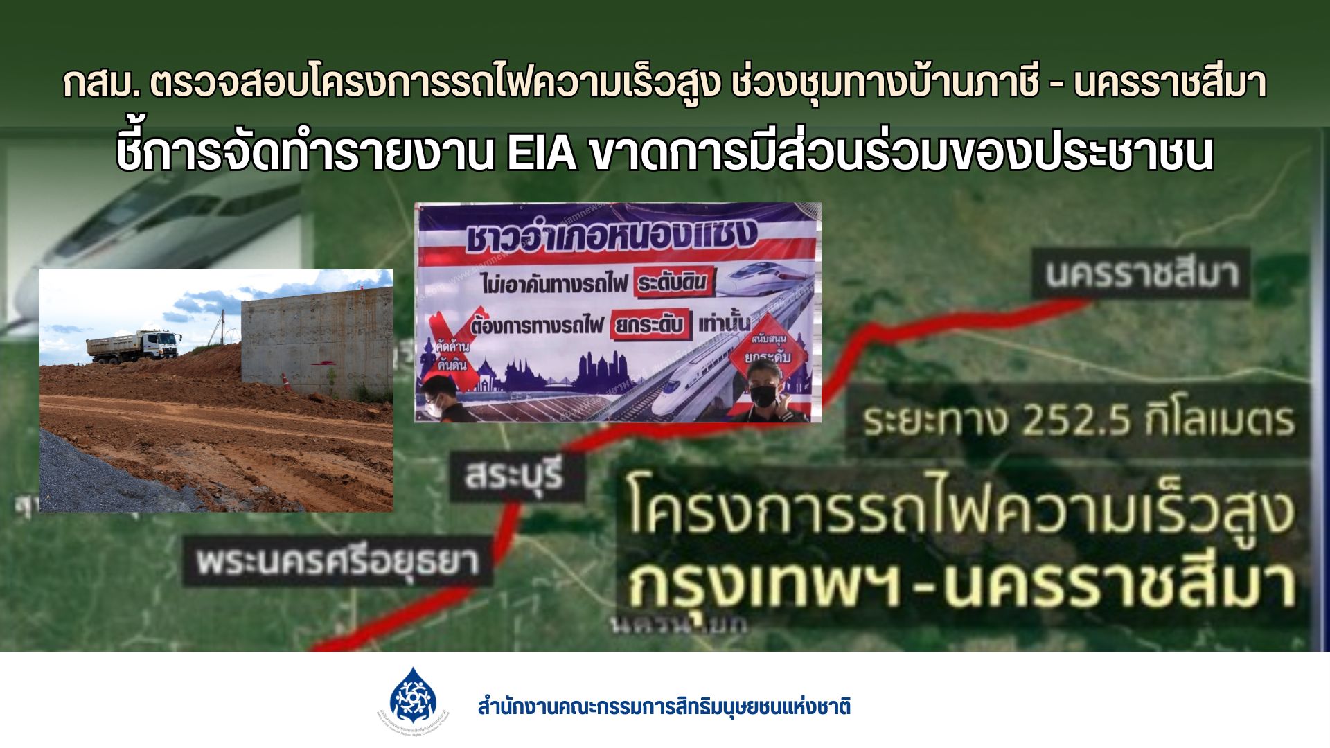 2. กสม. ตรวจสอบโครงการรถไฟความเร็วสูง กรุงเทพฯ - นครราชสีมา (ช่วงชุมทางบ้านภาชี - นครราชสีมา) ชี้การจัดทำรายงาน EIA ขาดการมีส่วนร่วมของประชาชน แนะทบทวนรูปแบบการก่อสร้าง
