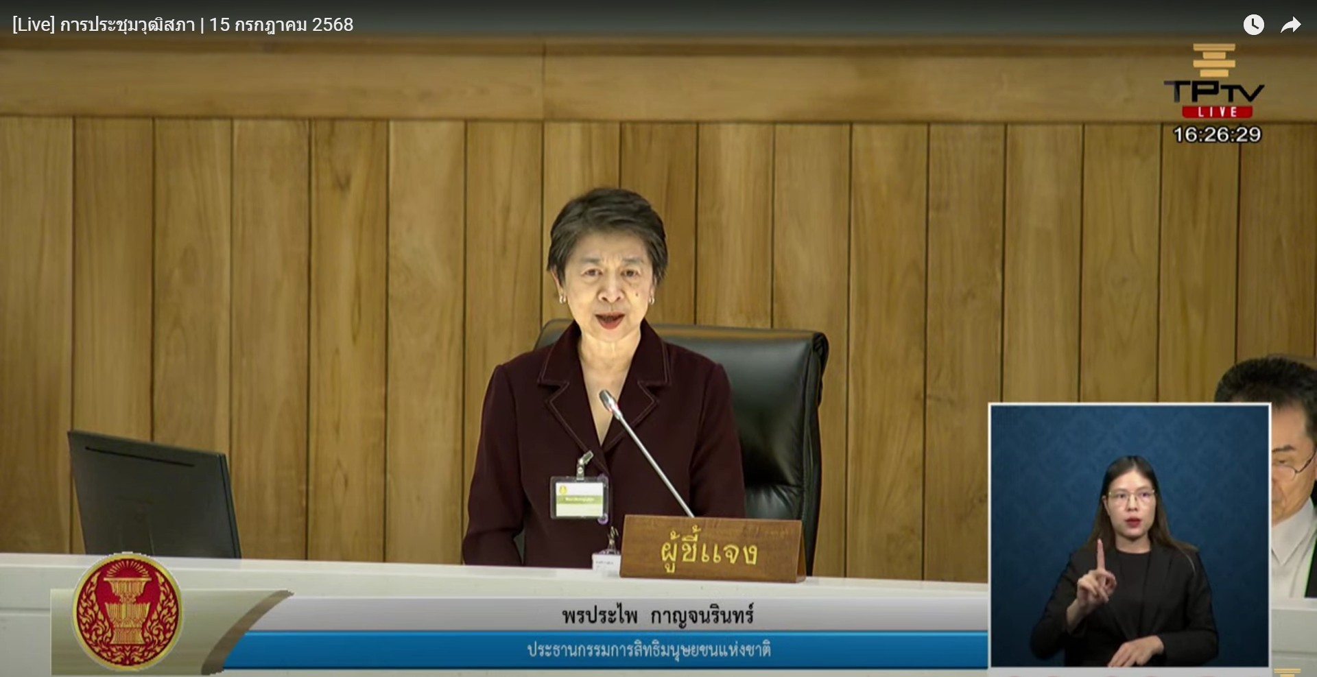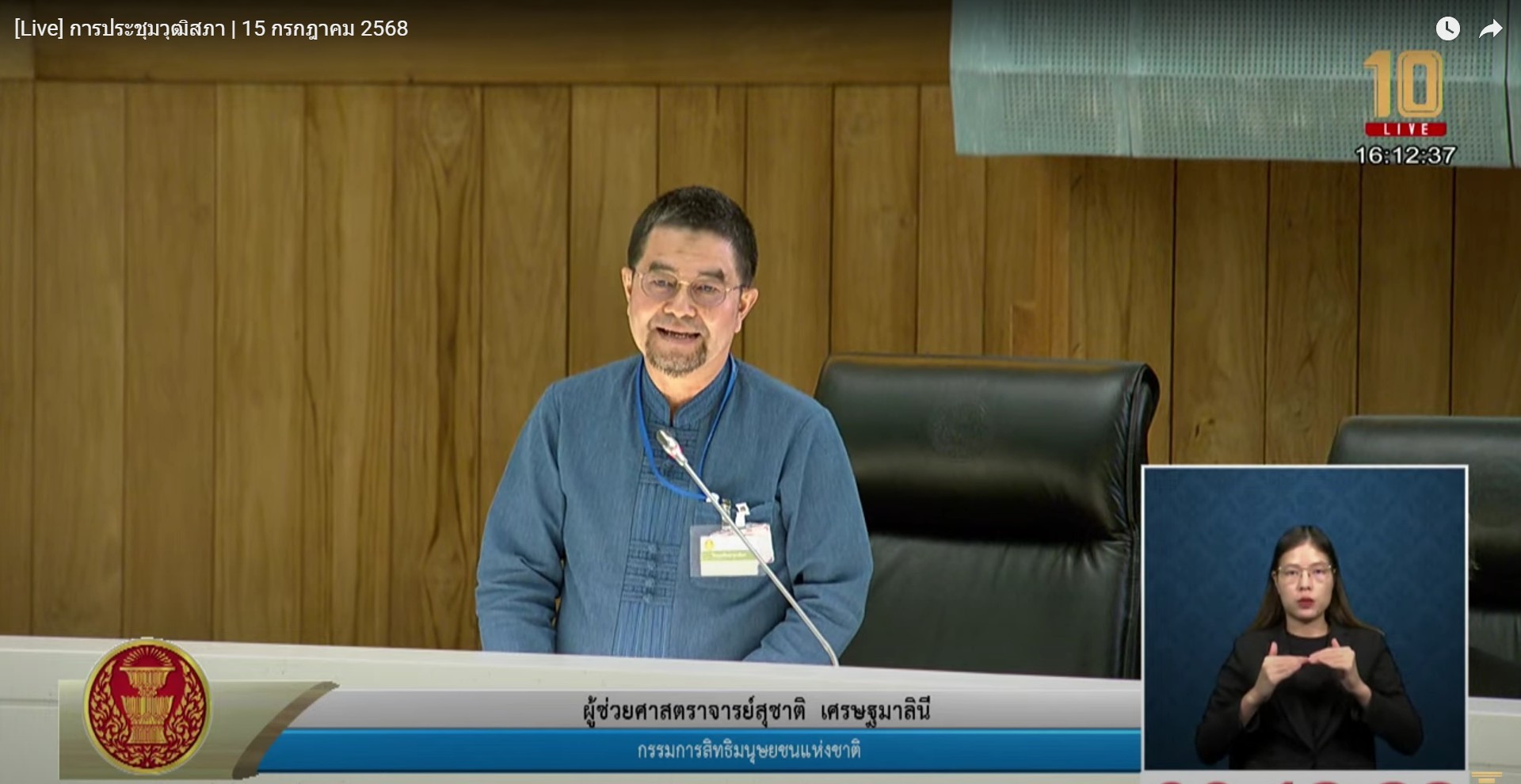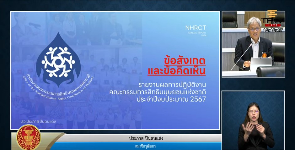 เมื่อวันที่ 15 กรกฎาคม 2568 คณะกรรมการสิทธิมนุษยชนแห่งชาติ (กสม.) โดยประธานกรรมการสิทธิมนุษยชนแห่งชาติ พรประไพ  กาญจนรินทร์ และกรรมการสิทธิมนุษยชนแห่งชาติ วสันต์  ภัยหลีกลี้ ผู้ช่วยศาสตราจารย์สุชาติ  เศรษฐมาลินี พร้อมด้วยเลขาธิการคณะกรรมการสิทธิมนุษยชนแห่งชาติ ผู้บริหาร และเจ้าหน้าที่สำนักงานคณะกรรมการสิทธิมนุษยชนแห่งชาติ เข้าร่วมการประชุมวุฒิสภา ครั้งที่ 4 (สมัยสามัญประจำปีครั้งที่หนึ่ง) เพื่อชี้แจงรายงานผลการประเมินสถานการณ์ด้านสิทธิมนุษยชนของประเทศไทย ปี 2567 และรายงานผลการปฏิบัติงานคณะกรรมการสิทธิมนุษยชนแห่งชาติ ประจำปีงบประมาณ พ.ศ. 2567 ณ ห้องประชุมวุฒิสภา อาคารรัฐสภา