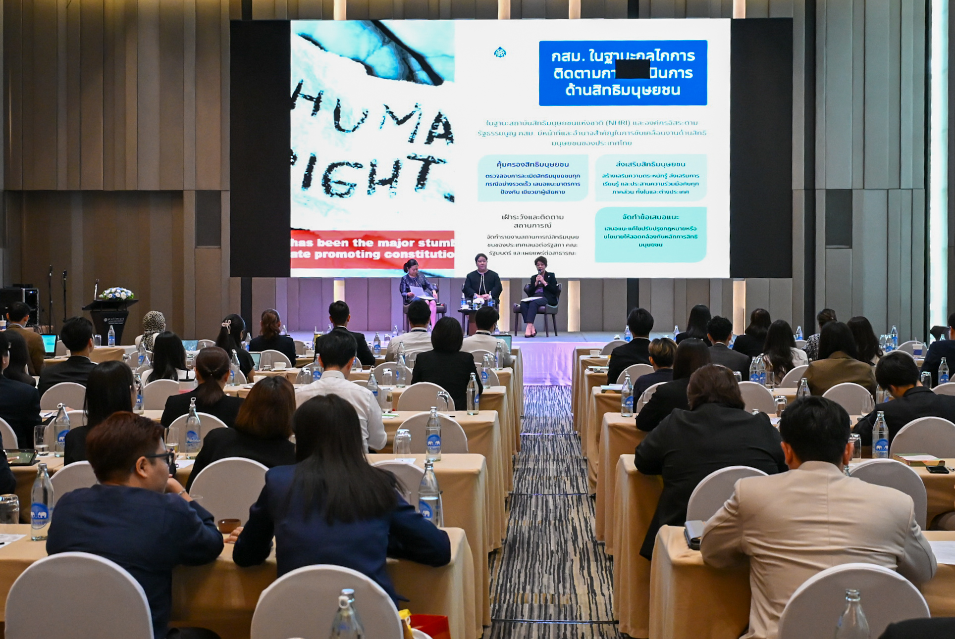 ในโอกาสนี้ เลขาธิการ กสม. หรรษา  หอมหวล ได้ร่วมเป็นวิทยากรบรรยายในหัวข้อ “กลไกระดับประเทศและการติดตามการดำเนินการด้านสิทธิมนุษยชน” โดยกล่าวถึงหน้าที่และอำนาจของ กสม. ในฐานะสถาบันสิทธิมนุษยชนแห่งชาติ (NHRI) ตามหลักการปารีส (Paris Principles) ในการติดตามการปฏิบัติตามพันธกรณีด้านสิทธิมนุษยชนของไทย โดยเครื่องมือหลักของ กสม. ประกอบด้วย การรับเรื่องร้องเรียน การจัดทำรายงานผลการประเมินสถานการณ์ด้านสิทธิมนุษยชนของประเทศไทยเป็นประจำทุกปี และการจัดทำรายงานคู่ขนาน (alternative report) เพื่อติดตามการดำเนินการของไทยให้เป็นไปตามพันธกรณีในสนธิสัญญาระหว่างประเทศด้านสิทธิมนุษยชนฉบับต่าง ๆ รวมถึงรายงานคู่ขนานประกอบการทบทวนสถานการณ์สิทธิมนุษยชนของประเทศ (UPR) ซึ่งเป็นกลไกภายใต้ HRC