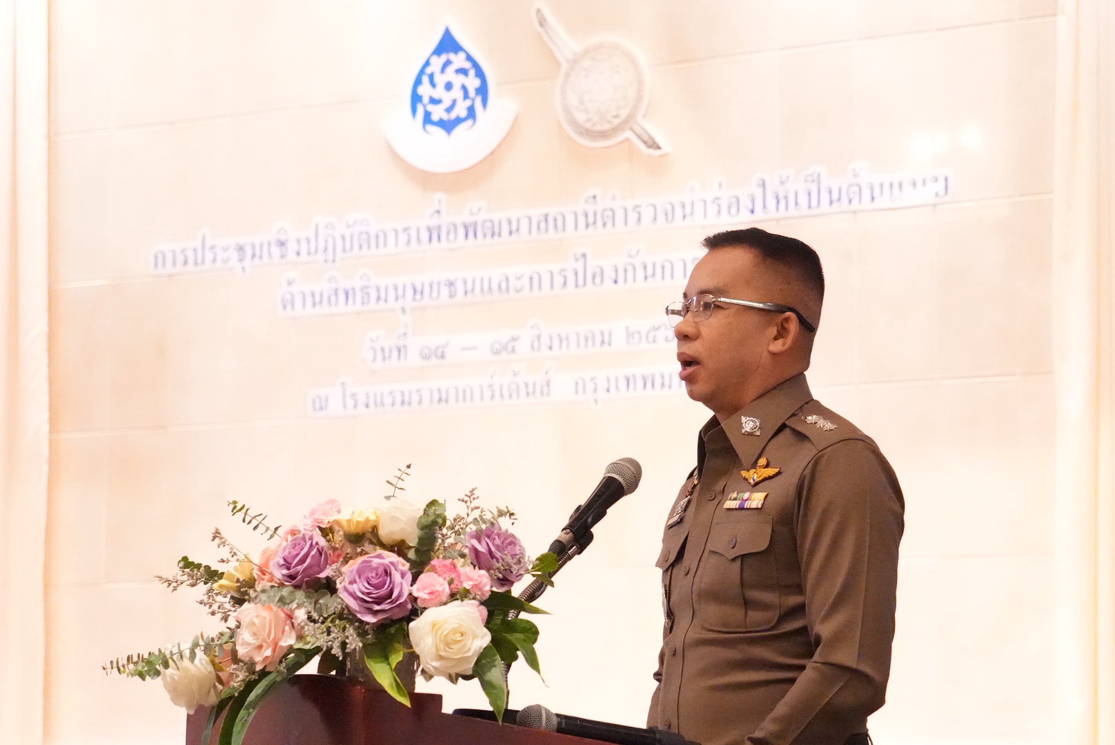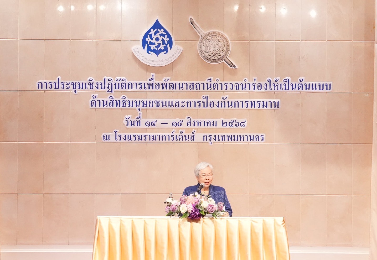 เมื่อวันที่ 13 - 16 สิงหาคม 2568 สำนักงานคณะกรรมการสิทธิมนุษยชนแห่งชาติ (สำนักงาน กสม.) ร่วมกับสำนักงานตำรวจแห่งชาติ (ตร.) และสถานเอกอัครราชทูตอังกฤษประจำประเทศไทย จัดการประชุมเชิงปฏิบัติการเพื่อพัฒนาสถานีตำรวจนำร่องให้เป็นต้นแบบด้านสิทธิมนุษยชนและการป้องกันการทรมาน ณ โรงแรมรามาการ์เด้นส์ กรุงเทพมหานคร และสถานีตำรวจนครบาลปทุมวัน โดยมีสถานีตำรวจนำร่องจากทั่วประเทศ จำนวน 26 สถานี พร้อมด้วยผู้แทน ตร. นักวิชาการ และภาคีเครือข่ายทั้งในและต่างประเทศ เข้าร่วม โดยมี พล.ต.ต. ภัทรภวัต สุขแสง ผู้บังคับการกองคดีอาญา สำนักงานกฎหมายและคดี ตร. และ Mr. David Thomas รองหัวหน้าคณะผู้แทนทางการทูตอังกฤษประจำประเทศไทย กล่าวต้อนรับผู้เข้าร่วม และนางสาวปิติกาญจน์ สิทธิเดช กรรมการสิทธิมนุษยชนแห่งชาติ กล่าวเปิดการประชุม พร้อมย้ำถึงความสำคัญของการพัฒนาสถานีตำรวจให้สอดคล้องกับหลักสิทธิมนุษยชนและพันธกรณีระหว่างประเทศ
