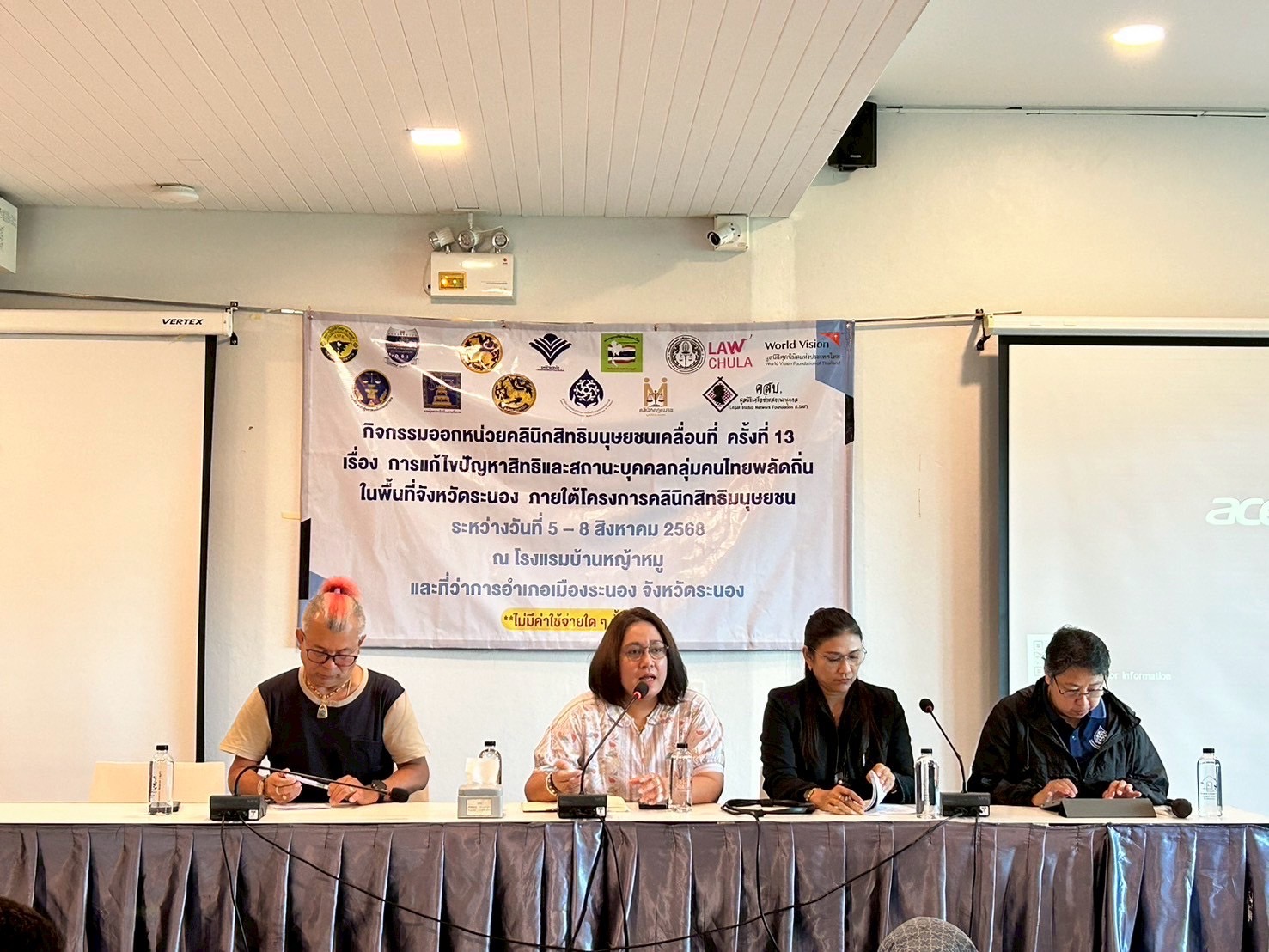 เมื่อวันที่ 5-8 สิงหาคม 2568 ที่อำเภอเมืองระนอง จังหวัดระนอง นางปรีดา  คงแป้น กรรมการสิทธิมนุษยชนแห่งชาติ นำทีมเจ้าหน้าที่สำนักงานคณะกรรมการสิทธิมนุษยชนแห่งชาติ (สำนักงาน กสม.) ลงพื้นที่บูรณาการการทำงานร่วมกับหน่วยงานที่เกี่ยวข้องทั้งภาครัฐและภาคประชาสังคมในการออกหน่วยโครงการคลินิกสิทธิมนุษยชน โดยการประสานความร่วมมือกับอำเภอเมืองระนอง กรมสอบสวนคดีพิเศษ กรมคุ้มครองสิทธิและเสรีภาพ สำนักงานยุติธรรมจังหวัดระนอง กรมพินิจและคุ้มครองเด็กและเยาวชน มูลนิธิชุมชนไทย คลินิกกฎหมาย และเครือข่ายคืนสัญชาติคนไทย ทั้งนี้ การลงพื้นที่ดังกล่าวได้จัดประชุมเชิงปฏิบัติการเพื่อส่งเสริมความเข้าใจในการยื่นคำขอรับรองความเป็นคนไทยพลัดถิ่น ซึ่งกระบวนการยื่นคำขอรับรองความเป็นคนไทยพลัดถิ่นเพื่อให้ประชาชนได้รับการกำหนดสถานะทางทะเบียน จำเป็นต้องมีการสอบปากคำผู้ยื่นคำขอและพยานบุคคล เพื่อให้ได้ความแน่ชัดว่า ผู้ยื่นคำขอมีคุณสมบัติครบถ้วนตามที่กฎหมายกำหนดหรือไม่ ซึ่งต้องอาศัยทักษะและความชำนาญโดยต้องได้รับการกำกับดูแลอย่างใกล้ชิดจากสำนักทะเบียนอำเภอเมืองระนอง ดังนั้น หลักเกณฑ์และขั้นตอนต่าง ๆ ในการยื่นคำขอรับรองความเป็นคนไทยพลัดถิ่น รวมตลอดถึงกระบวนการสอบข้อเท็จจริงต่าง ๆ สำหรับกลุ่มคนไทยพลัดถิ่นดังกล่าว จึงต้องอาศัยความละเอียดรอบคอบ และบูรณาการการทำงานร่วมกันกับหน่วยงานของรัฐและภาคีเครือข่ายที่เกี่ยวข้อง