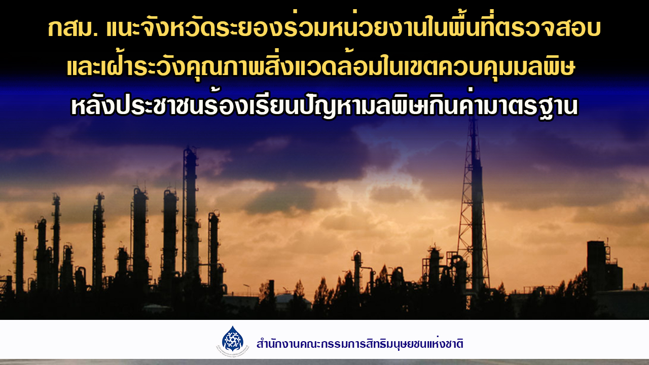 2. กสม. แนะจังหวัดระยองร่วมหน่วยงานในพื้นที่ตรวจสอบและเฝ้าระวังคุณภาพสิ่งแวดล้อมในเขตควบคุมมลพิษ หลังประชาชนร้องเรียนปัญหามลพิษเกินค่ามาตรฐาน