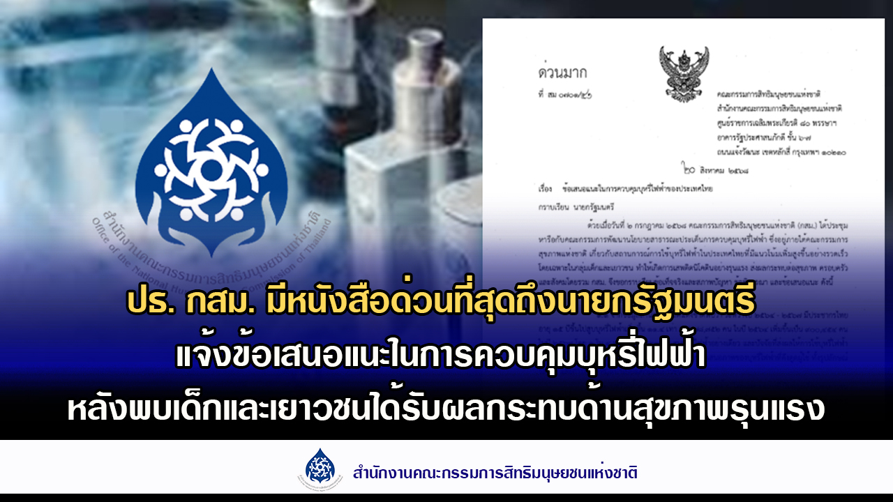 3. ประธาน กสม. มีหนังสือด่วนที่สุดถึงนายกรัฐมนตรี แจ้งข้อเสนอแนะในการควบคุมบุหรี่ไฟฟ้า หลังพบเด็กและเยาวชนใช้มากขึ้นอย่างรวดเร็ว และได้รับผลกระทบด้านสุขภาพรุนแรง
