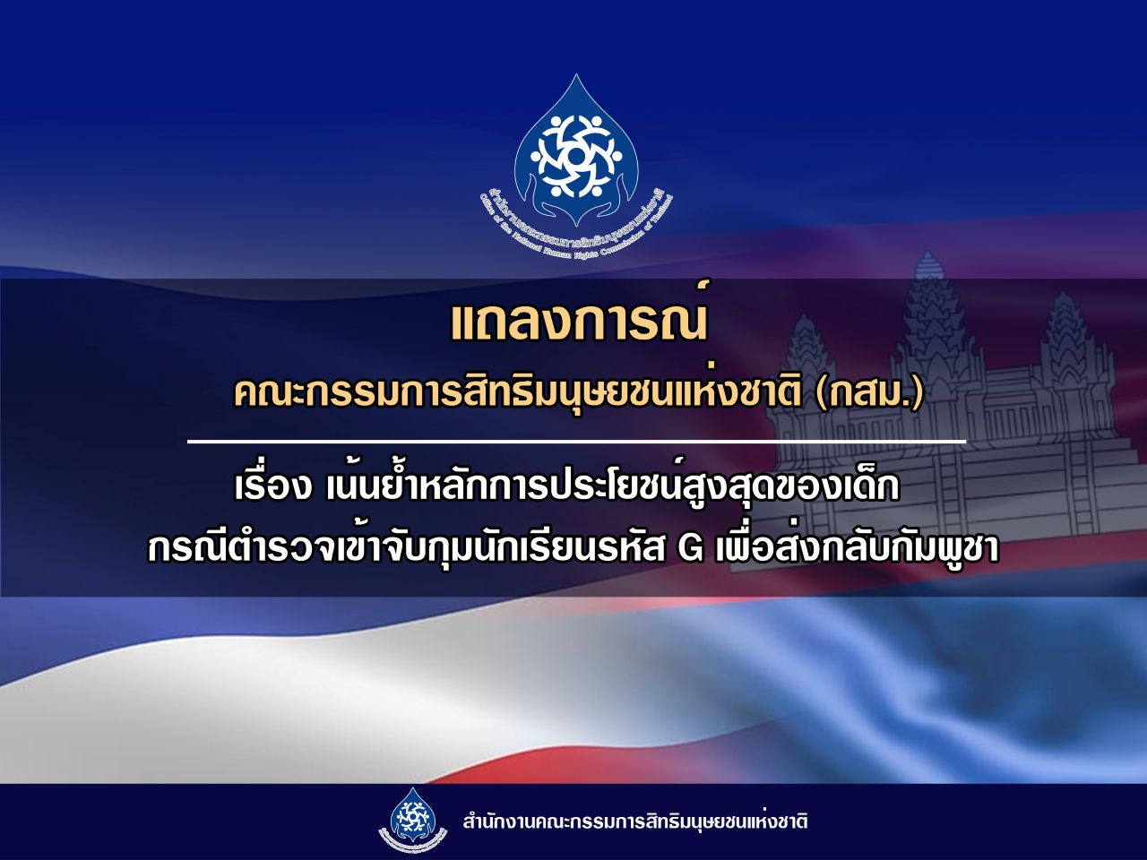 แถลงการณ์คณะกรรมการสิทธิมนุษยชนแห่งชาติ (กสม.) เรื่อง เน้นย้ำหลักการประโยชน์สูงสุดของเด็ก กรณีตำรวจเข้าจับกุมนักเรียนรหัส G เพื่อส่งกลับกัมพูชา