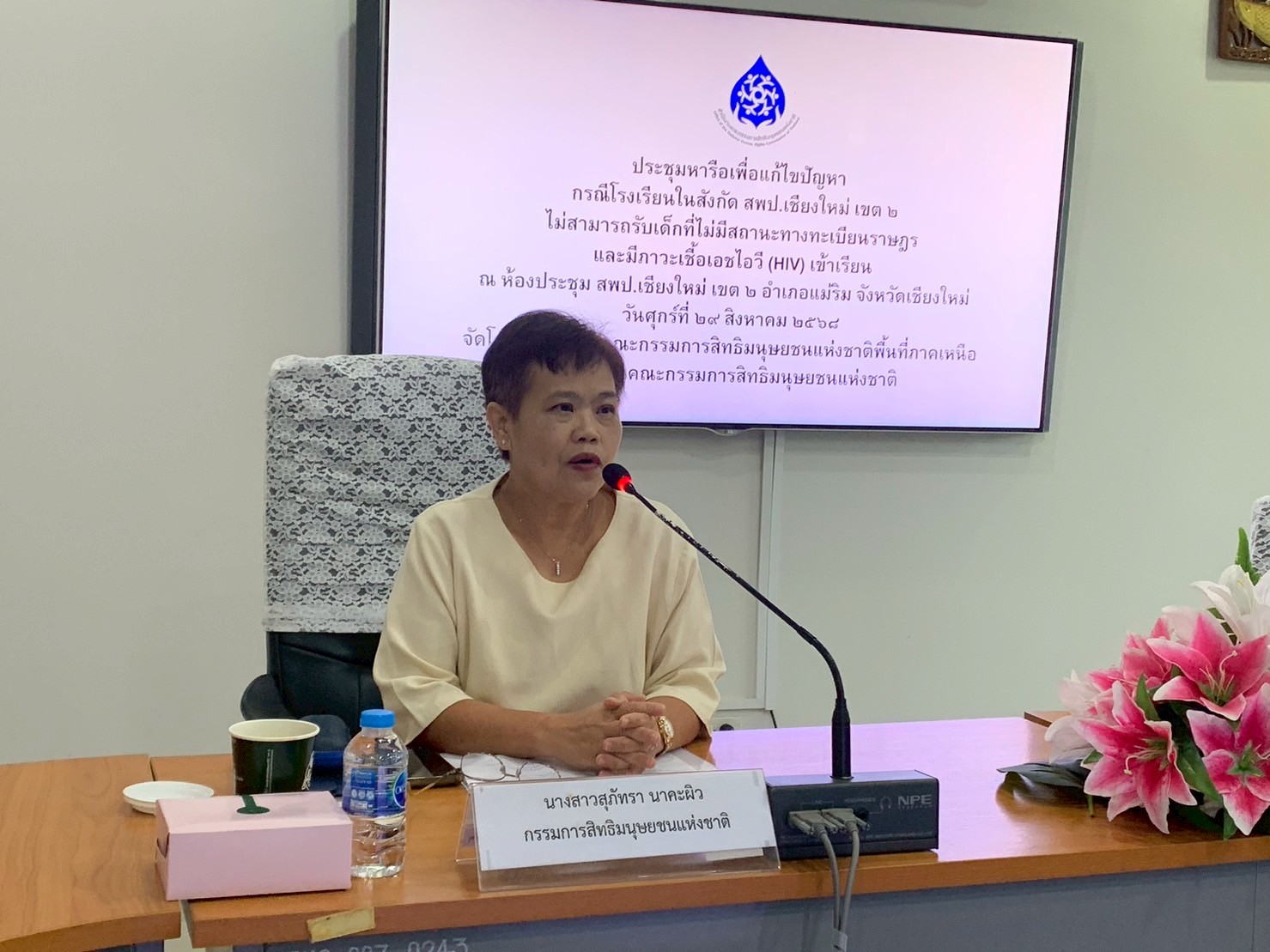 เมื่อวันที่ 29 สิงหาคม 2568 ที่ห้องประชุมสำนักงานเขตพื้นที่การศึกษาประถมศึกษาเชียงใหม่ เขต 2 จังหวัดเชียงใหม่ นางสาวสุภัทรา  นาคะผิว กรรมการสิทธิมนุษยชนแห่งชาติ นายภาณุพันธ์  สมสกุล ที่ปรึกษาสำนักงาน กสม. พร้อมด้วยผู้ทรงคุณวุฒิประจำ กสม. และเจ้าหน้าที่สำนักงาน กสม. พื้นที่ภาคเหนือ ประชุมหารือเพื่อแก้ไขปัญหาและสร้างการตระหนักรู้ ร่วมกับผู้แทนหน่วยงานของรัฐด้านการศึกษา การสาธารณสุข และการพัฒนาสังคมและความมั่นคงของมนุษย์ในพื้นที่จังหวัดเชียงใหม่ พร้อมเครือข่ายภาคประชาสังคมที่ทำงานช่วยเหลือผู้ติดเชื้อเอชไอวี (HIV) กรณีโรงเรียนบางแห่งในพื้นที่อำเภอสันทรายและอำเภอแม่ริม จังหวัดเชียงใหม่ ไม่รับเด็กหญิง ก. (นามสมมติ) ซึ่งเป็นผู้มีเชื้อ HIV และประสบปัญหาด้านสถานะบุคคล (ไม่มีเลขประจำตัว 13 หลัก) รวมถึงมีภาวะปากแหว่งเพดานโหว่ เข้าเรียนในระดับชั้นประถมศึกษาปีที่ 1 และโรงเรียนที่รับไว้แต่ให้เรียนที่บ้าน (Home school)