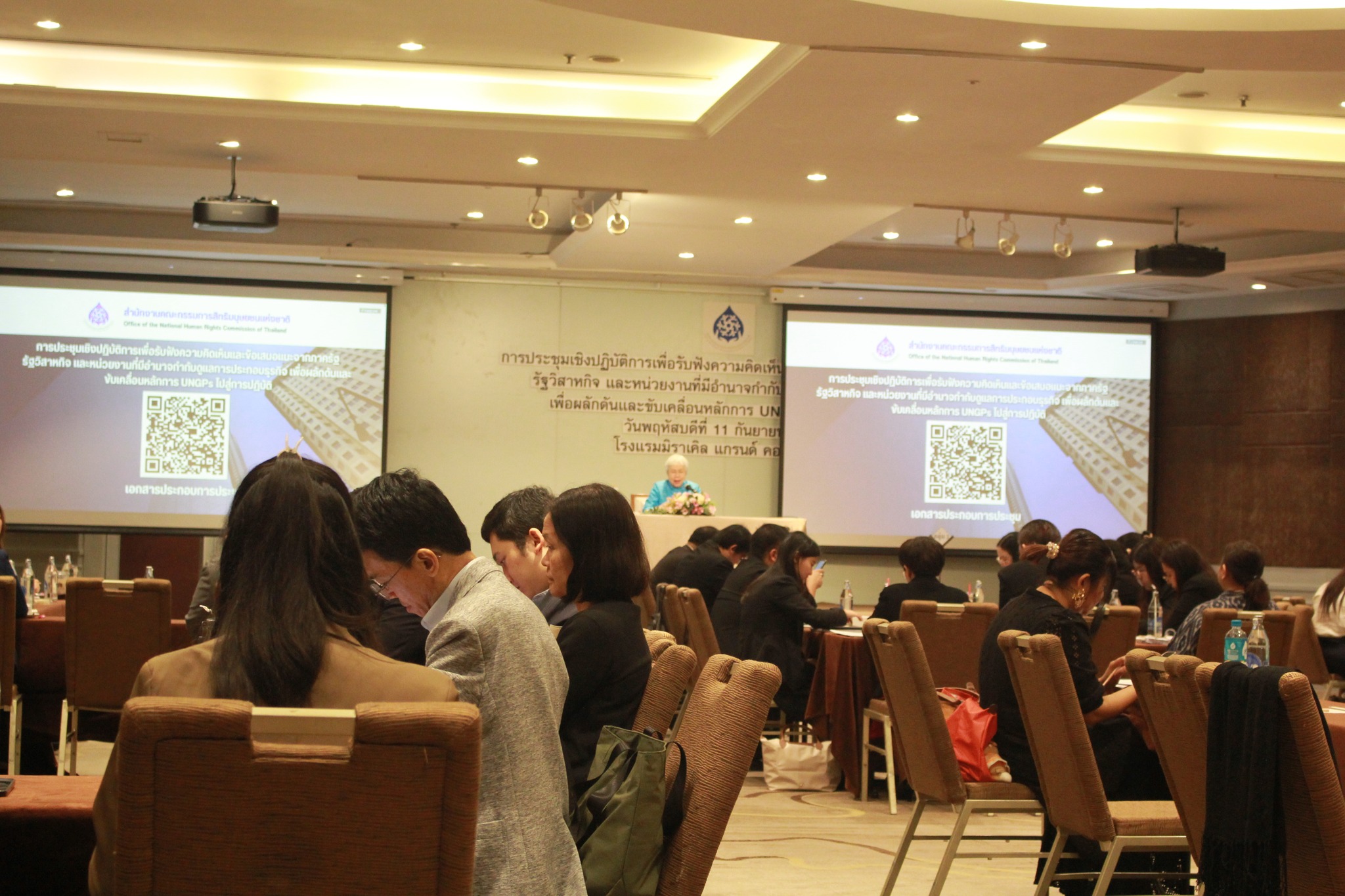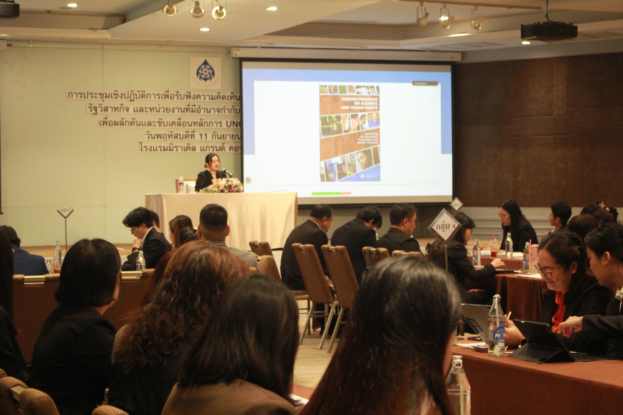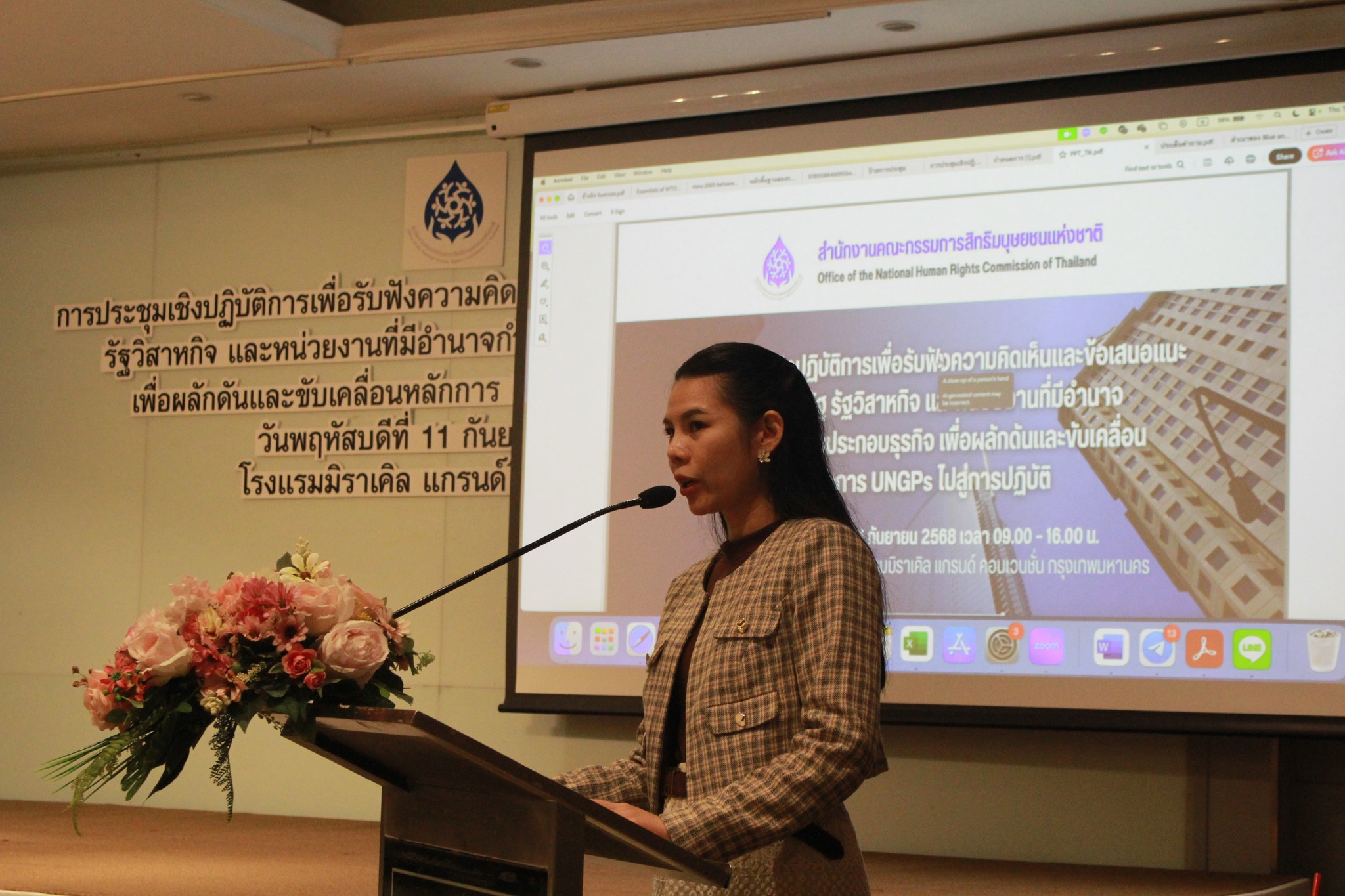 เมื่อวันที่ 11 กันยายน 2568 ที่โรงแรมมิราเคิล แกรนด์ คอนเวนชั่น กรุงเทพมหานคร คุณปิติกาญจน์  สิทธิเดช กรรมการสิทธิมนุษยชนแห่งชาติ พร้อมด้วยคุณรัตติกุล  จันทร์สุริยา ที่ปรึกษาประจำคณะกรรมการสิทธิมนุษยชนแห่งชาติ และเจ้าหน้าที่สำนักงาน กสม. เข้าร่วมการประชุมเชิงปฏิบัติการเพื่อรับฟังความคิดเห็นและข้อเสนอแนะจากภาครัฐ รัฐวิสาหกิจ และหน่วยงานที่มีอำนาจกำกับดูแลการประกอบธุรกิจ เพื่อผลักดันและขับเคลื่อนหลักการสหประชาชาติว่าด้วยธุรกิจกับสิทธิมนุษยชน (UNGPs) ไปสู่การปฏิบัติ โดยมีผู้แทนจากภาครัฐ รัฐวิสาหกิจ ภาควิชาการ และผู้สนใจเข้าร่วมกว่า 100 คน ทั้งแบบ onsite และ online