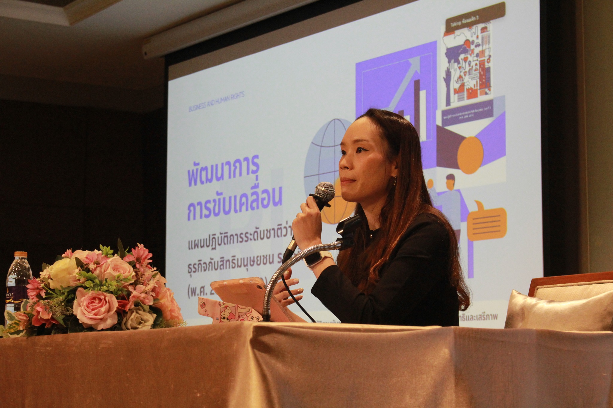 ต่อมา คุณจีรภรณ์  ศิริพลัง ทุมมาศ หัวหน้ากลุ่มงานวิเทศสัมพันธ์และส่งเสริมการปฏิบัติตามพันธกรณีสิทธิมนุษยชนระหว่างประเทศ กรมคุ้มครองสิทธิและเสรีภาพ ได้นำเสนอพัฒนาการการขับเคลื่อนแผนปฏิบัติการระดับชาติว่าด้วยธุรกิจกับสิทธิมนุษยชน ระยะที่ 2 (พ.ศ. 2566–2567) โดยชี้ว่าประเด็นด้านชุมชน ที่ดิน ทรัพยากรธรรมชาติ และสิ่งแวดล้อม ยังคงเป็นความท้าทายสำคัญที่ต้องอาศัยความร่วมมือจากทุกภาคส่วน