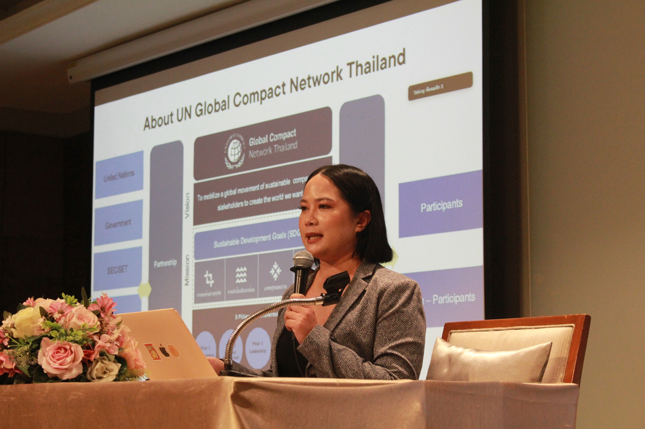นอกจากนี้ คุณเพ็ญพิชชา  จรรย์โกมล ผู้แทน UN Global Compact Network Thailand ได้นำเสนอหลักการสากล 10 ประการที่ภาคธุรกิจควรยึดถือ ครอบคลุมประเด็นสิทธิมนุษยชน แรงงาน สิ่งแวดล้อม และการต่อต้านการทุจริต โดยเครือข่ายได้มีการตั้งสถาบันธุรกิจกับสิทธิมนุษยชน (BHR Academy) ขึ้น เพื่อเสริมสร้างความรู้ความเข้าใจในประเด็นสิทธิมนุษยชนสำหรับองค์กรภาคธุรกิจ และเพื่อพัฒนาศักยภาพในการนำหลักการและแนวปฏิบัติด้านสิทธิมนุษยชนที่ดีไปใช้ให้เกิดผลได้จริง และสามารถตรวจสอบสิทธิมนุษยชนได้อย่างรอบด้านอีกด้วย