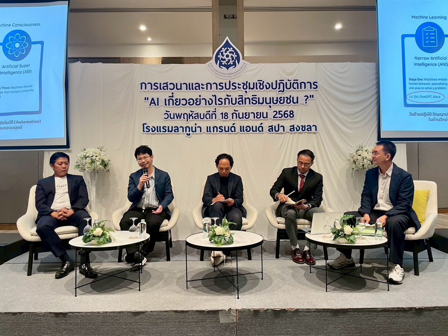 ในวันที่ 18 กันยายน 2568 สำนักงาน กสม. ได้รับเกียรติจากนายวรนล  ฐิตินันทกร กรรมการผู้จัดการ บริษัท ทูเบอร์ จำกัด (Tuber Co., Ltd.) และกรรมการสภาเศรษฐกิจหาดใหญ่ นายว่องวิช  ขวัญพัทลุง รองคณบดีฝ่ายพัฒนานักศึกษาและศิษย์เก่าสัมพันธ์ คณะนิติศาสตร์ มหาวิทยาลัยสงขลานครินทร์ นายมะรูฟ  เจะบือราเฮง ประธานมูลนิธิดิจิทัลเพื่อสันติภาพ และนายหัตถพงษ์  หิรัญรัตน์ เจ้าหน้าที่ศูนย์พัฒนากฎหมาย สำนักงานพัฒนาธุรกรรมทางอิเล็กทรอนิกส์ (สพธอ. หรือ ETDA) กระทรวงดิจิทัลเพื่อเศรษฐกิจและสังคม ร่วมเป็นวิทยากรในการเสวนาประเด็น “ปัญญาประดิษฐ์ (AI) กับสิทธิมนุษยชน” โดยวิทยากรได้ร่วมเสวนาในประเด็นสถานการณ์ โอกาสและความท้าทายในการพัฒนาและการใช้ AI ในประเทศไทย กรอบและการพัฒนากฎหมาย นโยบายและมาตรการกำกับดูแลการใช้และการพัฒนา AI ของประเทศไทย การรับรู้ถึงผลกระทบของ AI ต่อสิทธิมนุษยชนในชีวิตประจำวันและในสถานการณ์ต่าง ๆ ทิศทางของ AI และผลกระทบของ AI ในระดับโลก โอกาสและความท้าทายจากการใช้และการพัฒนา AI ในจังหวัดสงขลาและพื้นที่ภาคใต้ตลอดจนแนวทางในการรับมือจากโอกาสและความท้าทายดังกล่าว