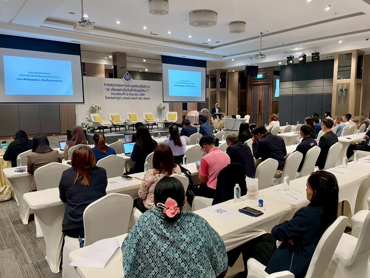 เมื่อวันที่ 18 - 19 กันยายน 2568 ณ โรงแรมLaguna Grand Hotel & Spa จังหวัดสงขลา นายวสันต์  ภัยหลีกลี้ กรรมการสิทธิมนุษยชนแห่งชาติ พร้อมด้วยเจ้าหน้าที่สำนักงาน กสม. จัดการเสวนาและการประชุมเชิงปฏิบัติการ “AI เกี่ยวอย่างไรกับสิทธิมนุษยชน?” เพื่อรับฟังความคิดเห็นจากภาคส่วนต่าง ๆ ทั้งภาครัฐ ภาคเอกชน ภาคประชาสังคม ภาควิชาการ ต่อสถานการณ์การพัฒนาและการใช้ AI ผลกระทบของ AI ต่อสิทธิมนุษยชน การรับรู้ของสาธารณชนต่อความเสี่ยงด้านสิทธิมนุษยชนที่เกิดจาก AI ตลอดจนแนวทางเพื่อคุ้มครองและส่งเสริมสิทธิมนุษยชนจากการใช้และพัฒนา AI ในบริบทของประเทศไทย โดยเฉพาะในพื้นที่ภาคใต้