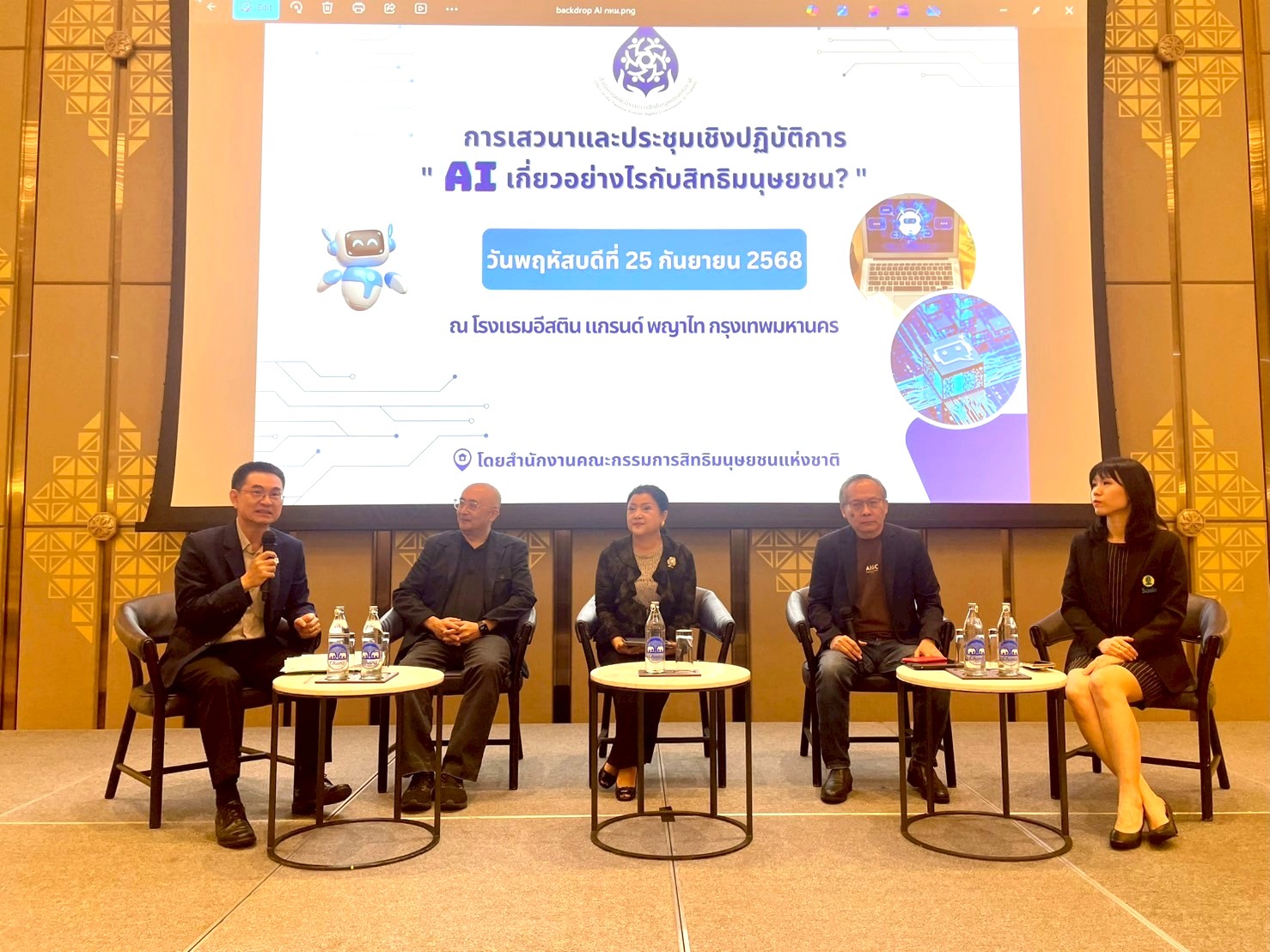เมื่อวันที่ 25 กันยายน 2568 ที่โรงแรมอีสติน แกรนด์ พญาไท กรุงเทพมหานคร ผศ. สุชาติ  เศรษฐมาลินี นายวสันต์  ภัยหลีกลี้ กรรมการสิทธิมนุษยชนแห่งชาติ นางสาวหรรษา  หอมหวล เลขาธิการ กสม. พร้อมด้วยเจ้าหน้าที่สำนักงาน กสม. จัดการเสวนาและการประชุมเชิงปฏิบัติการ “AI เกี่ยวอย่างไรกับสิทธิมนุษยชน?” เพื่อรับฟังความคิดเห็นจากภาคส่วนต่าง ๆ ทั้งภาครัฐ ภาคเอกชน ภาควิชาการ และภาคประชาสังคมต่อสถานการณ์การพัฒนาและการใช้ AI ความเสี่ยงและผลกระทบของ AI ต่อสิทธิมนุษยชน ตลอดจนแนวทางเพื่อคุ้มครองและส่งเสริมสิทธิมนุษยชนจากการใช้และพัฒนา AI ในบริบทของประเทศไทย ในพื้นที่กรุงเทพฯ และปริมณฑล