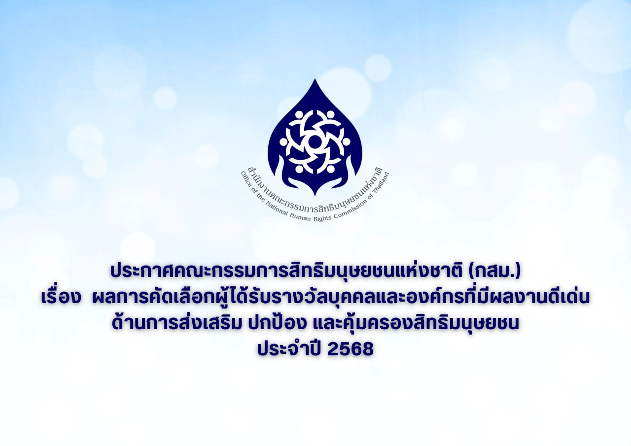 ประกาศคณะกรรมการสิทธิมนุษยชนแห่งชาติ (กสม.) เรื่อง ผลการคัดเลือกผู้ได้รับรางวัลบุคคลและองค์กรที่มีผลงานดีเด่น ด้านการส่งเสริม ปกป้อง และคุ้มครองสิทธิมนุษยชน ประจำปี 2568